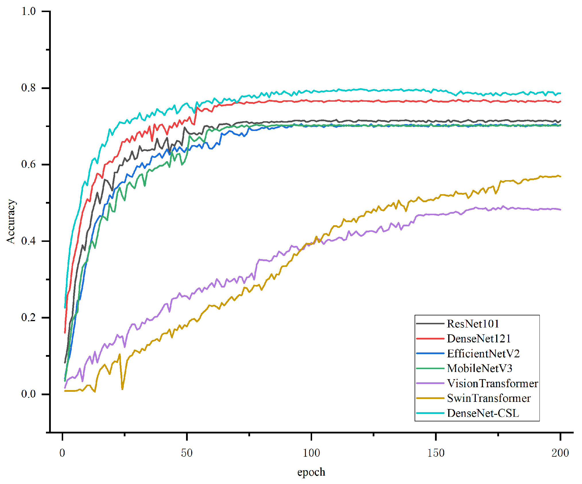 Figure 9 presents the corresponding accuracy curves during training. All models show a rapid increase in accuracy during the early training stages, followed by gradual stabilization. DenseNet-CSL achieves higher accuracy at an earlier stage and ultimately stabilizes at approximately 0.80, outperforming the other models. DenseNet121 and ResNet101 reach stable accuracies of around 0.77 and 0.71, respectively, while EfficientNetV2 and MobileNetV3 converge to lower accuracy levels and exhibit greater fluctuations during early training. In contrast, VisionTransformer and SwinTransformer achieved notably lower accuracies. Their performance started at a low level in the early training stage and improved only to approximately 0.47 and 0.56 by the end, which is substantially below that of the CNN-based baselines. This observation further supports the conclusion drawn from the loss curves that these Transformer-based models fail to converge effectively under the current training setting. Possible explanations include the limited dataset size and the higher optimization difficulty of Transformers, which may prevent them from realizing their expected advantages on this task. Therefore, in the subsequent experimental analysis and model comparison, the two types of Transformer models will not be emphasized.