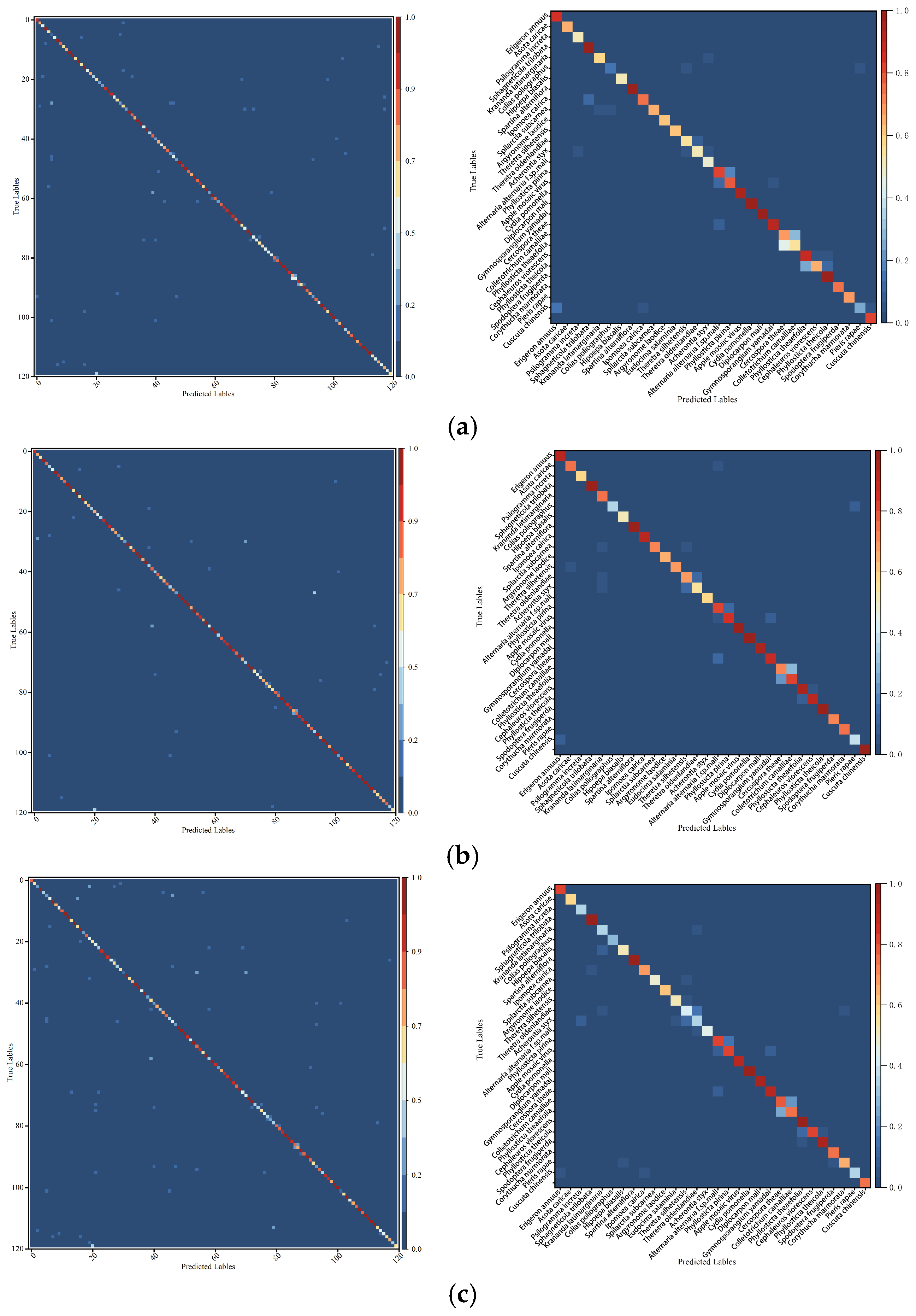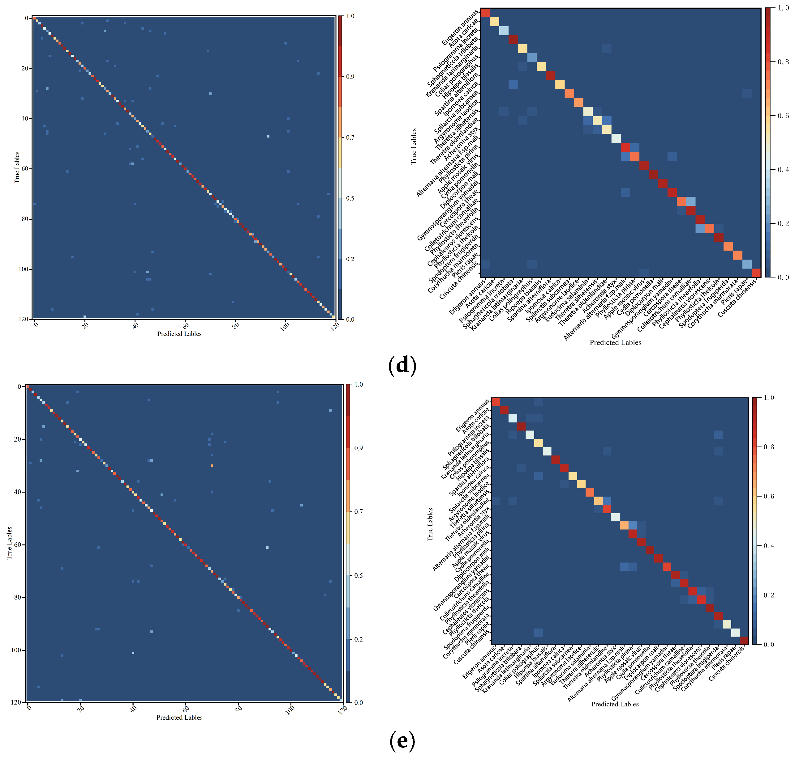 Despite the overall strong performance, misclassification still occurs among certain categories with high phenotypic similarity. For instance, Colias poliographus and Pieris rapae are occasionally confused due to similarities in wing shape and coloration. Likewise, apple Alternaria leaf spot and apple gray spot share visually similar disease symptoms, which can lead to classification ambiguity. Similar confusion patterns are also observed between Vanessa indica and Vanessa cardui, as well as between Acherontia styx and Acherontia lachesis. These errors primarily arise from subtle inter-species differences and represent typical challenges in fine-grained image classification tasks.