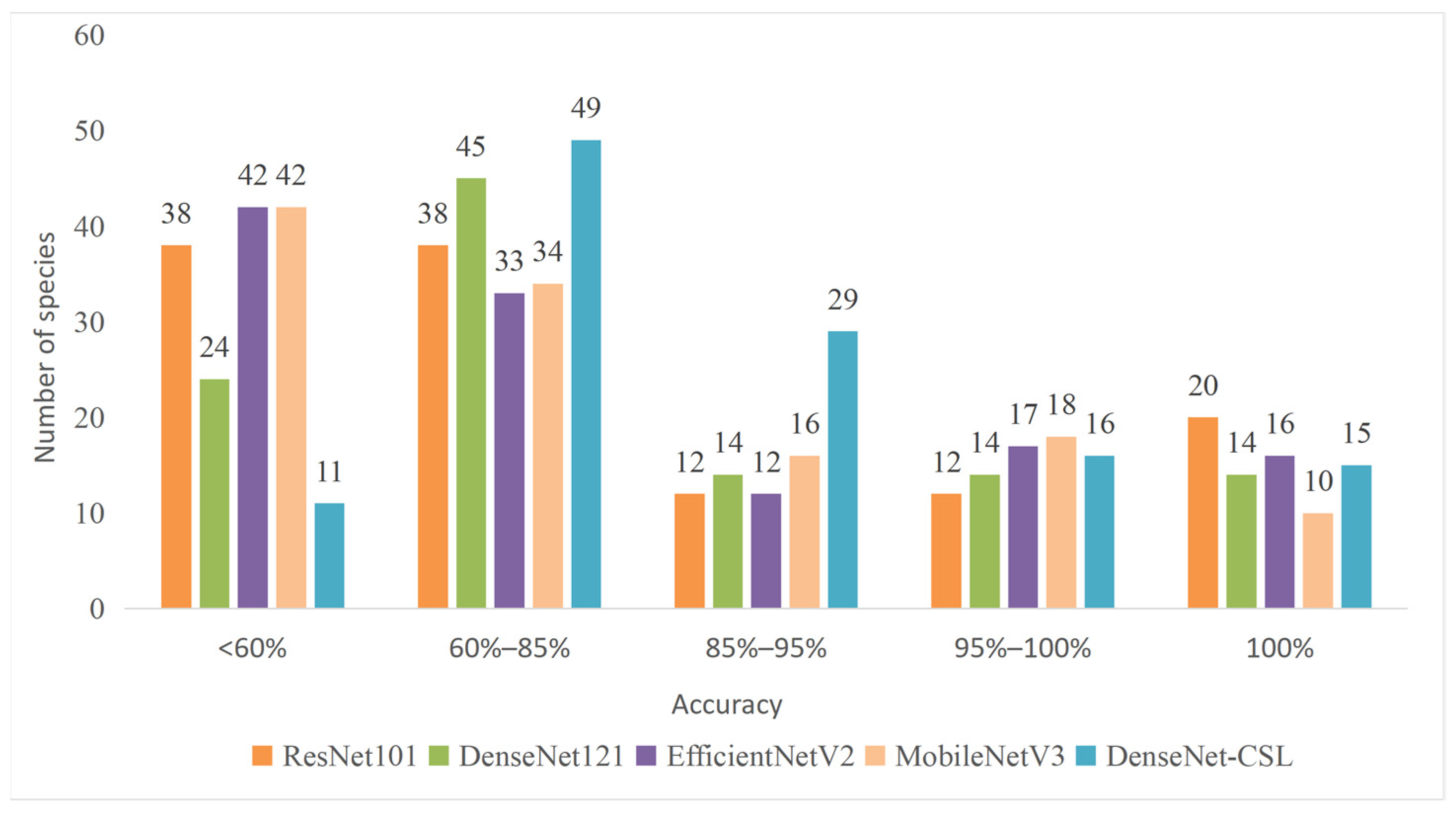 To further examine the classification stability and per-category performance of each model, the recognition accuracy of all 120 species in the test set was statistically analyzed. For ease of comparison, recognition accuracy was divided into five intervals: below 60%, 60–85%, 85–95%, 95–100%, and 100%. The number of species falling into each interval was counted for all models, and the results are illustrated in