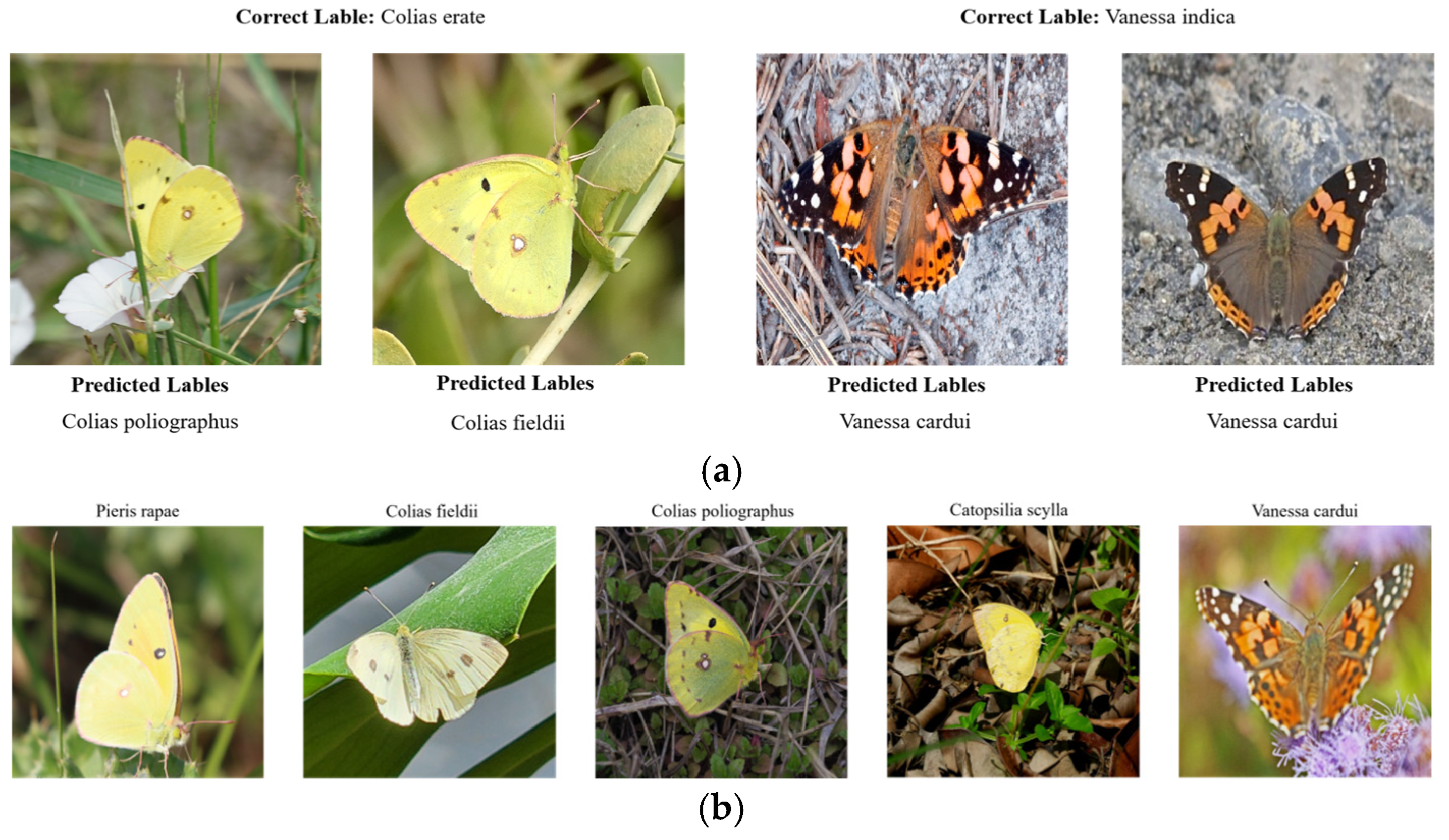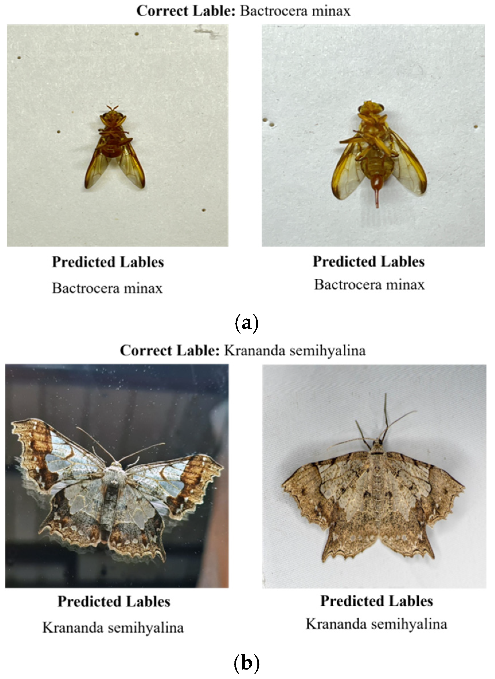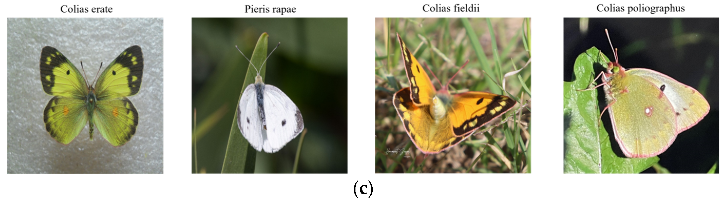 The primary interspecific differences among these species lie in subtle variations in wing shape, vein structure, and the spatial arrangement of color patches. Such fine-grained distinctions are difficult to capture consistently, particularly when images are affected by viewpoint changes, illumination variation, or partial occlusion. As a result, these species represent a typical and challenging case for fine-grained classification in agricultural image recognition.