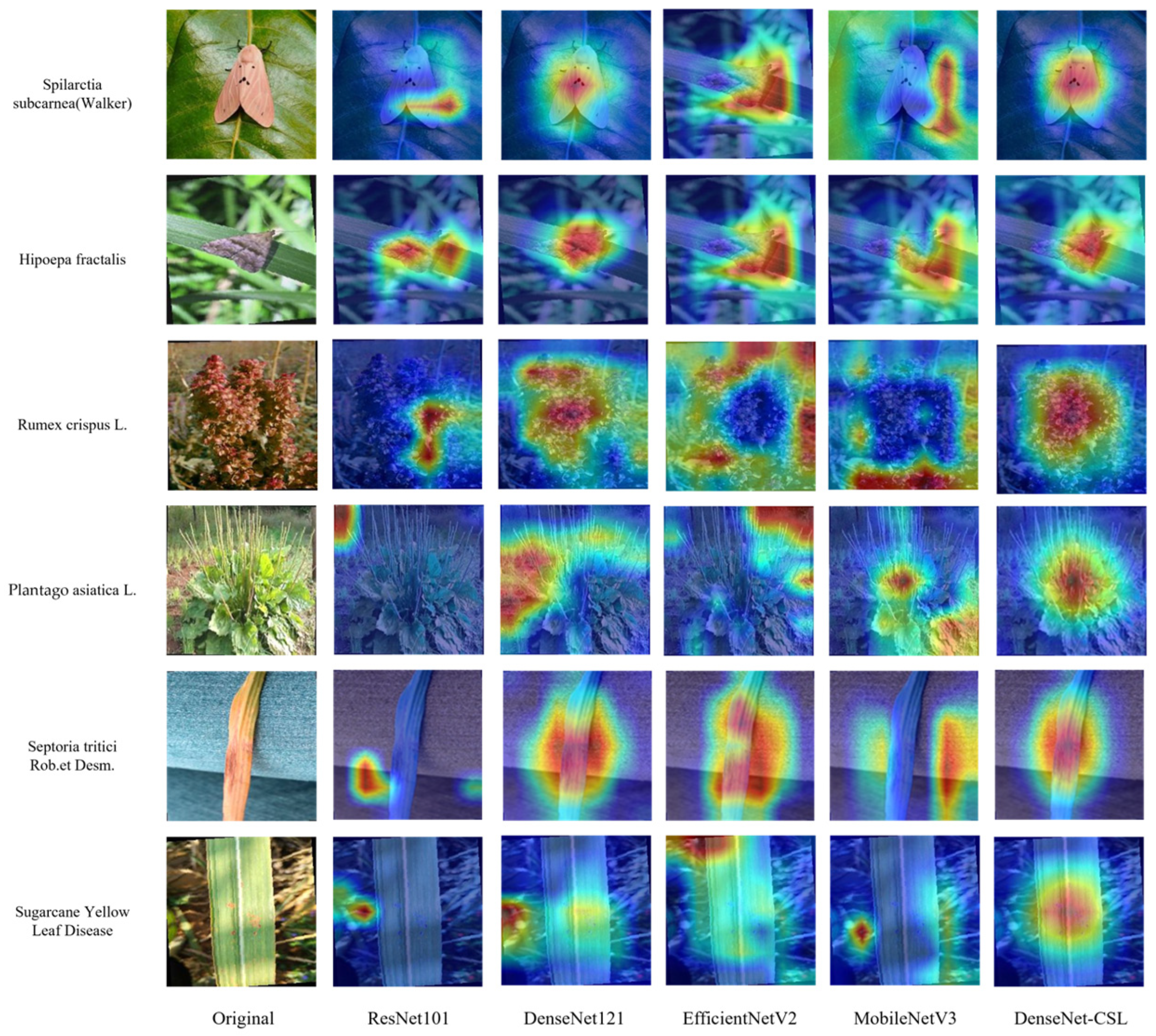 Figure 15 shows representative Grad-CAM visualizations produced by ResNet101, DenseNet121, EfficientNetV2, and DenseNet-CSL for six test samples spanning both laboratory-style PlantVillage disease images (typically characterized by uniform backgrounds) and field-captured pest/weed images (typically characterized by cluttered natural backgrounds). Overall, ResNet101 and EfficientNetV2 tend to produce more scattered or multi-region activations, and in several cases their responses extend beyond the target organism to surrounding leaves, soil, or background textures. This indicates that these models may be more sensitive to background clutter and may partially rely on context-related cues rather than strictly discriminative biological regions. In contrast, DenseNet121 shows relatively improved localization but still exhibits occasional background leakage. By contrast, DenseNet121 shows relatively improved localization but still exhibits occasional background leakage. In comparison, DenseNet-CSL consistently focuses on more complete and biologically relevant regions of the harmful organisms, such as characteristic body contours, leaf lesion areas, or distinctive structural features. This observation indicates that the proposed model is more effective in capturing spatially coherent and semantically meaningful features.