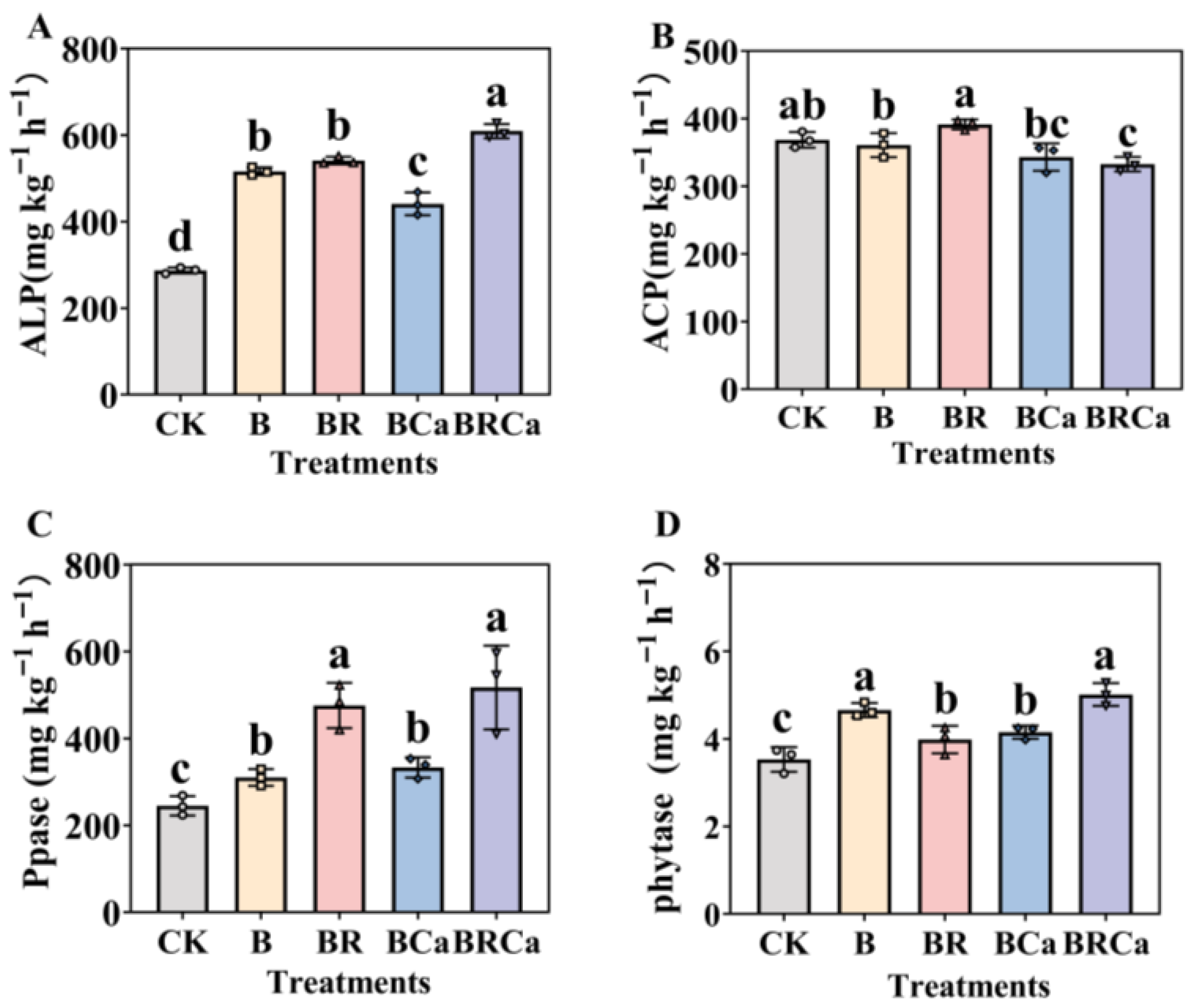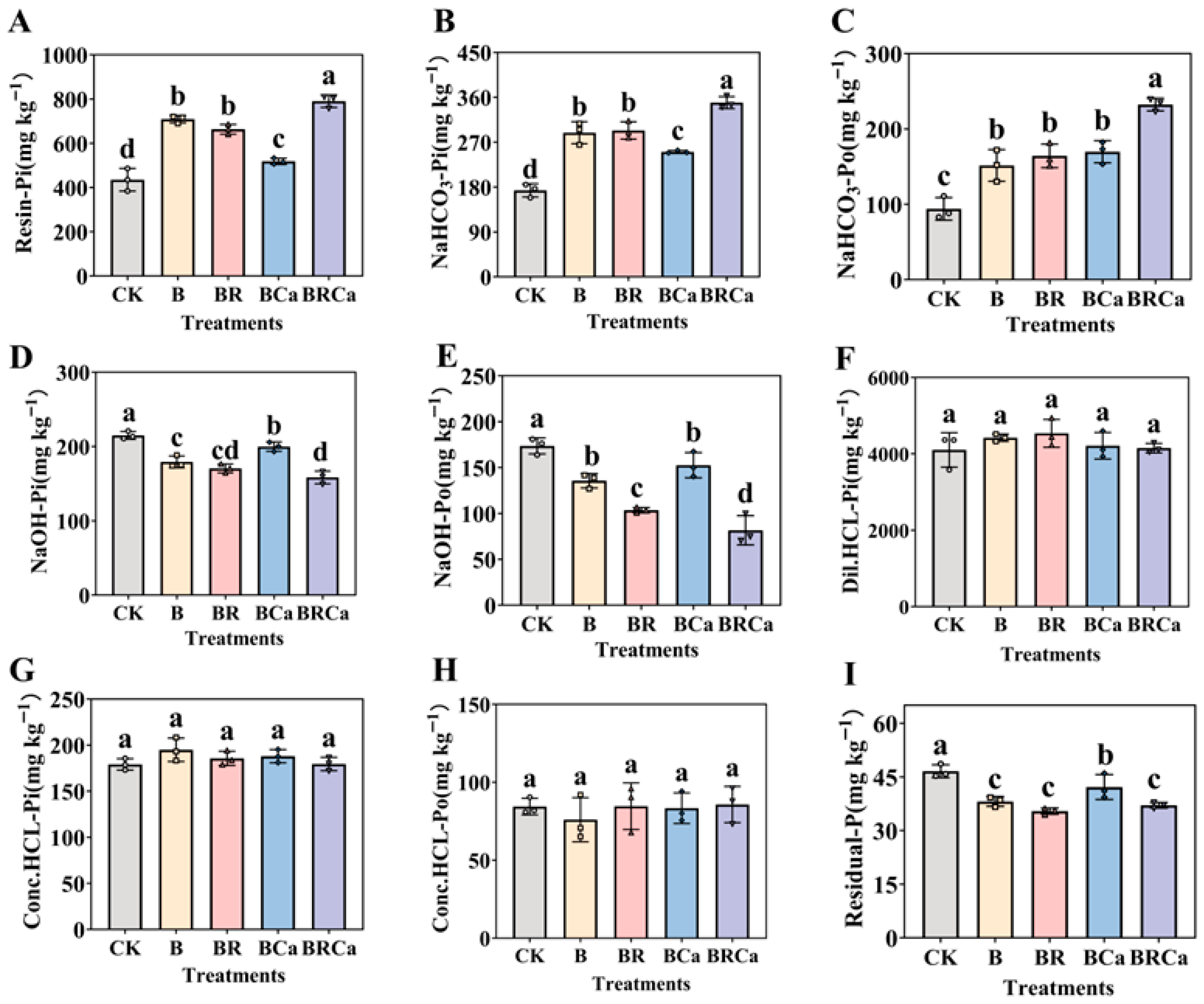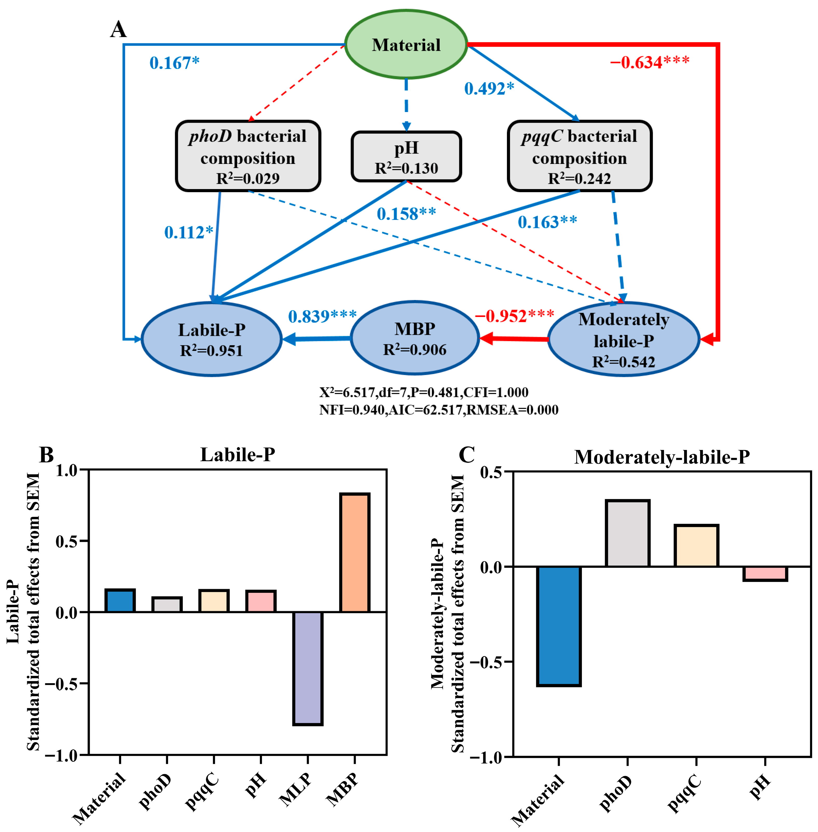 4.2. The Impact of Material Addition on Soil Phosphorus Fractions and Phosphorus-Related Enzyme Activities