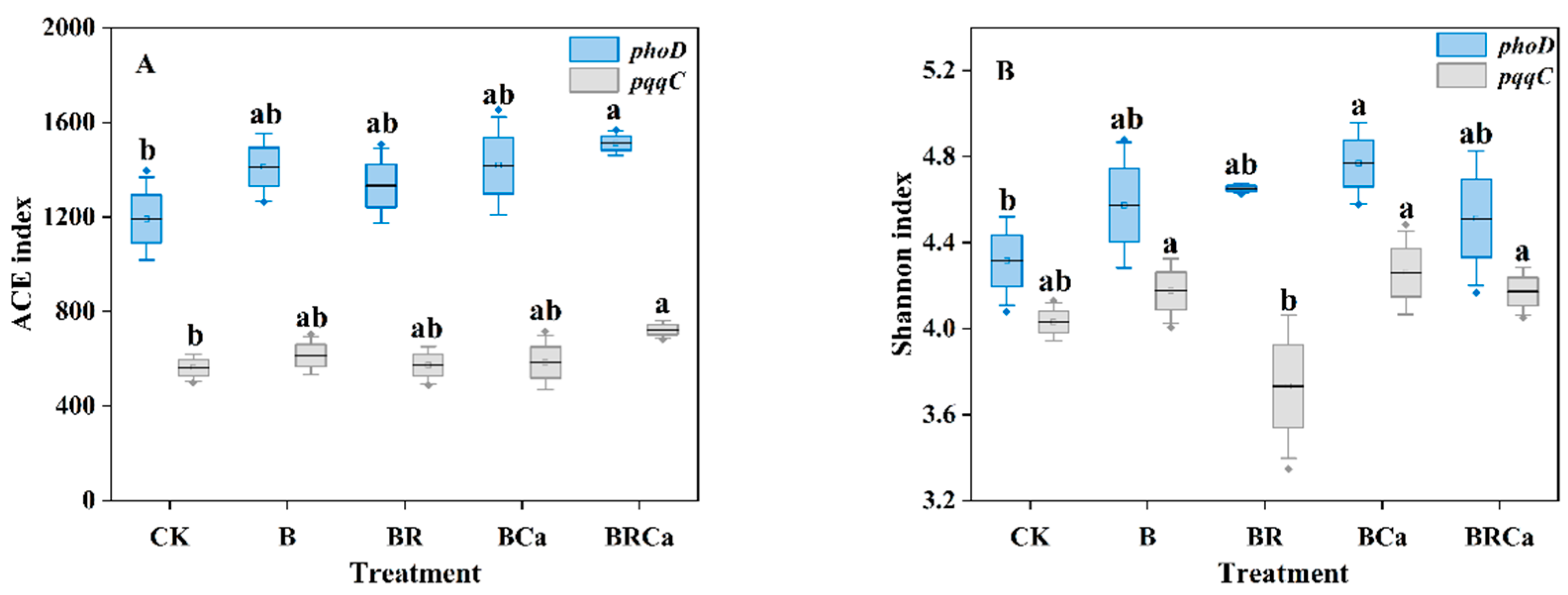 3.4. Alpha Diversity Index of phoD and pqqC Genes