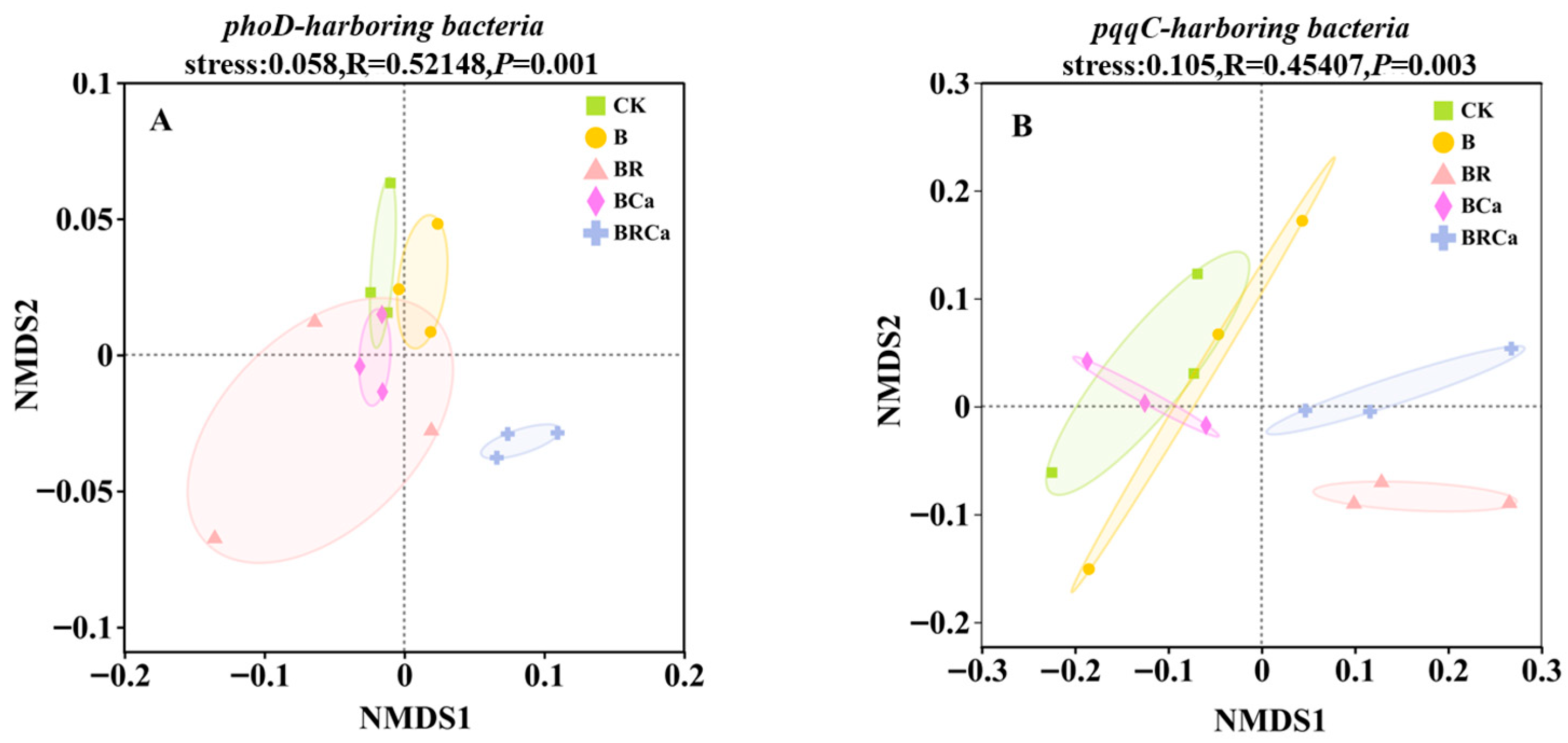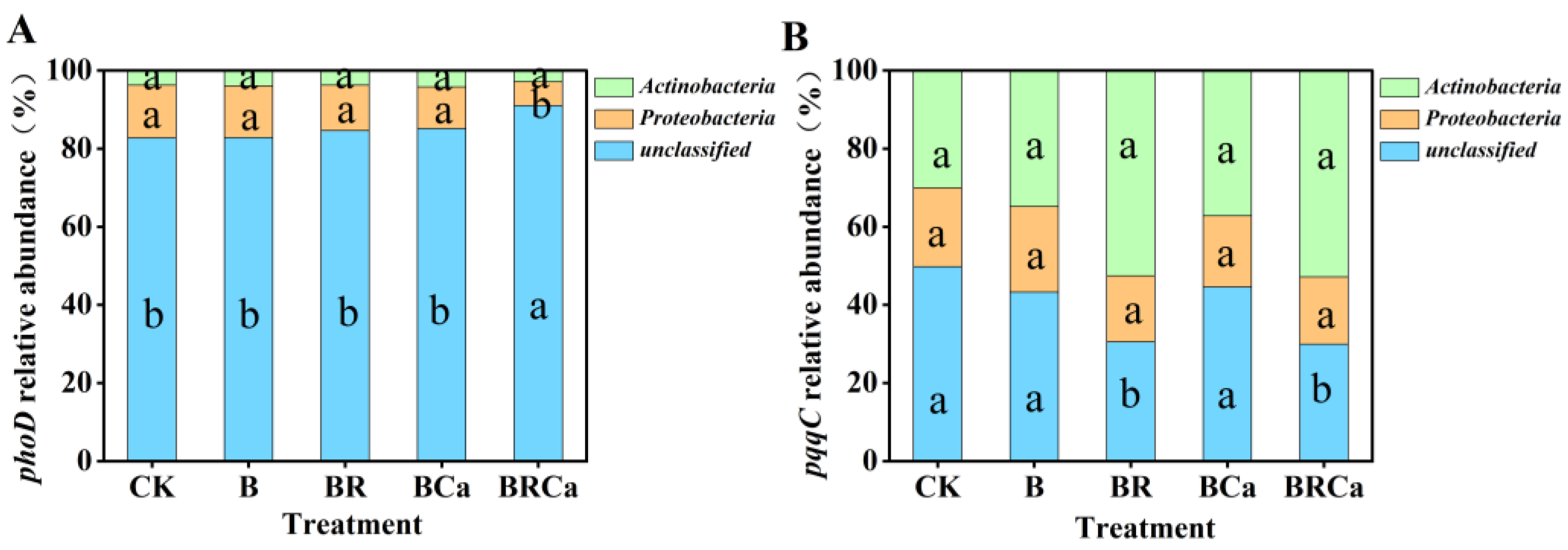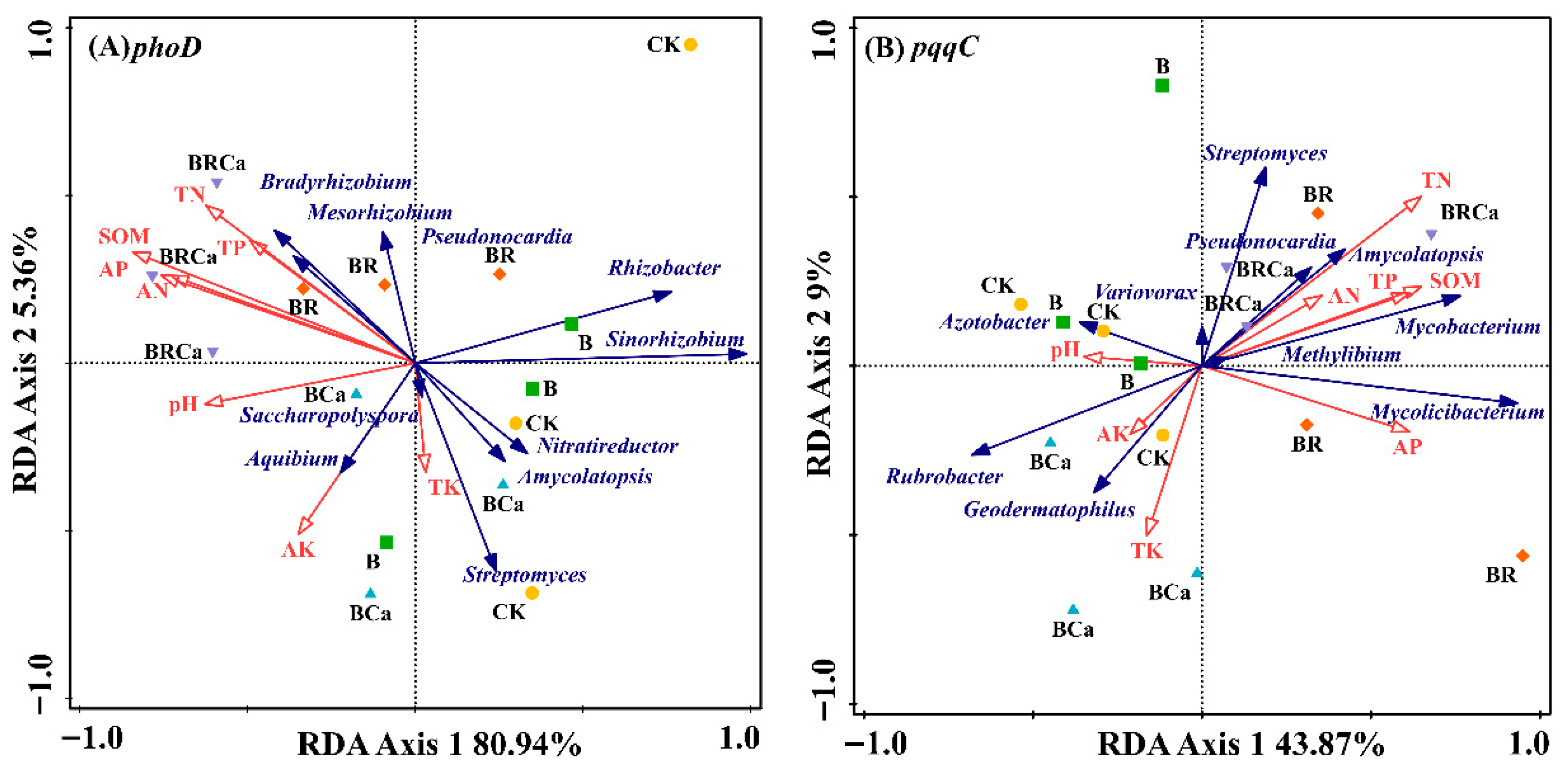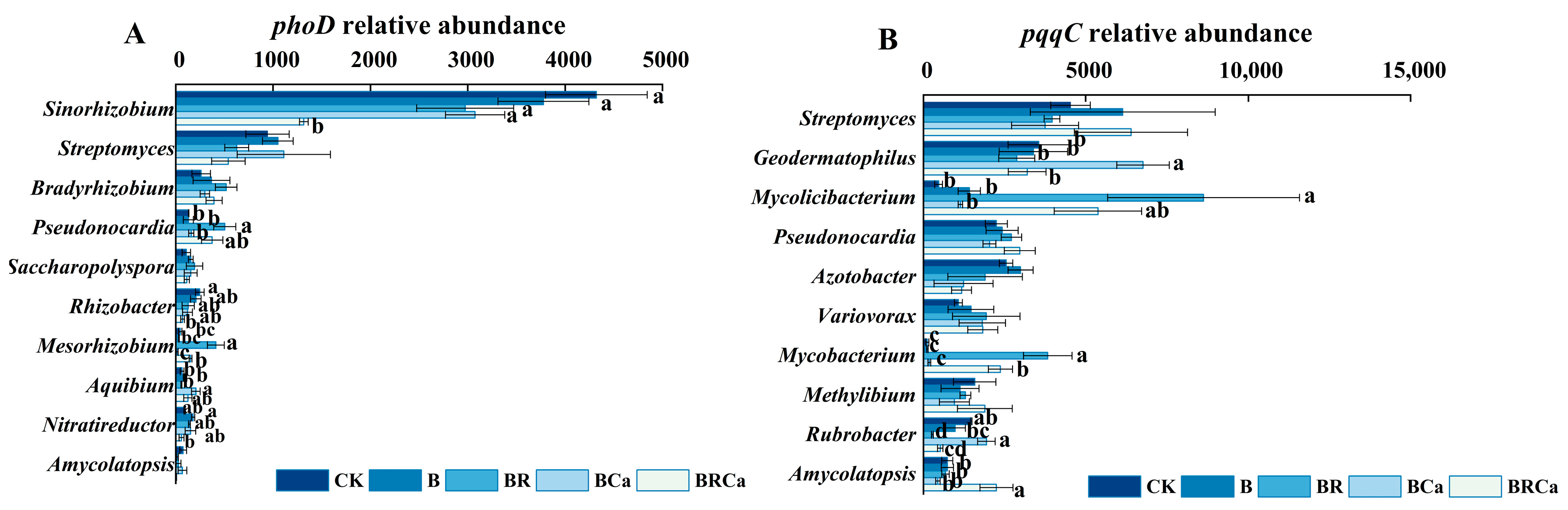 3.6. Phylum-Level Distribution of phoD and pqqC Microbial Communities