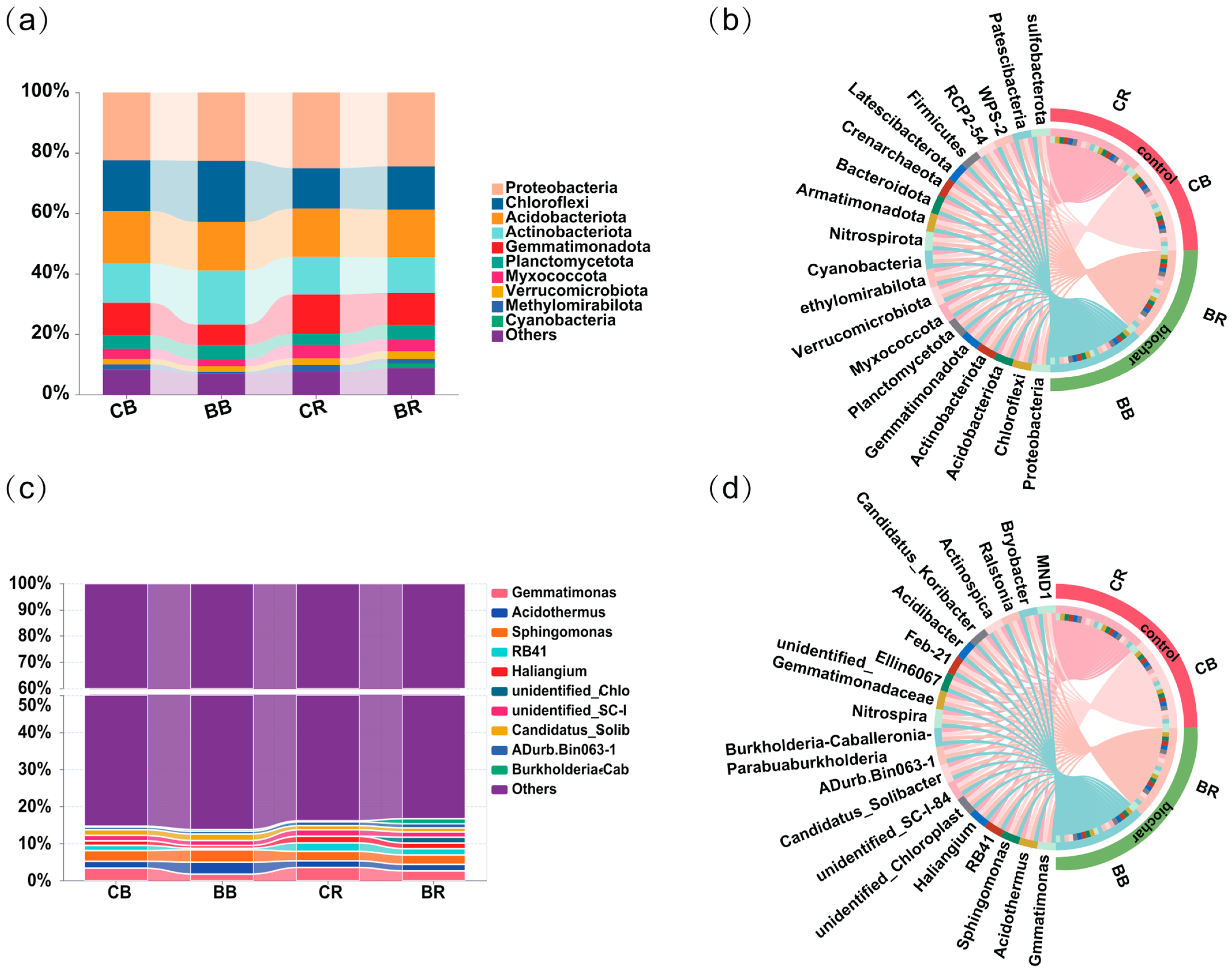 4.1. Biochar Application Altered Soil Bacterial Diversity and Community Structure in a Cassava Field
