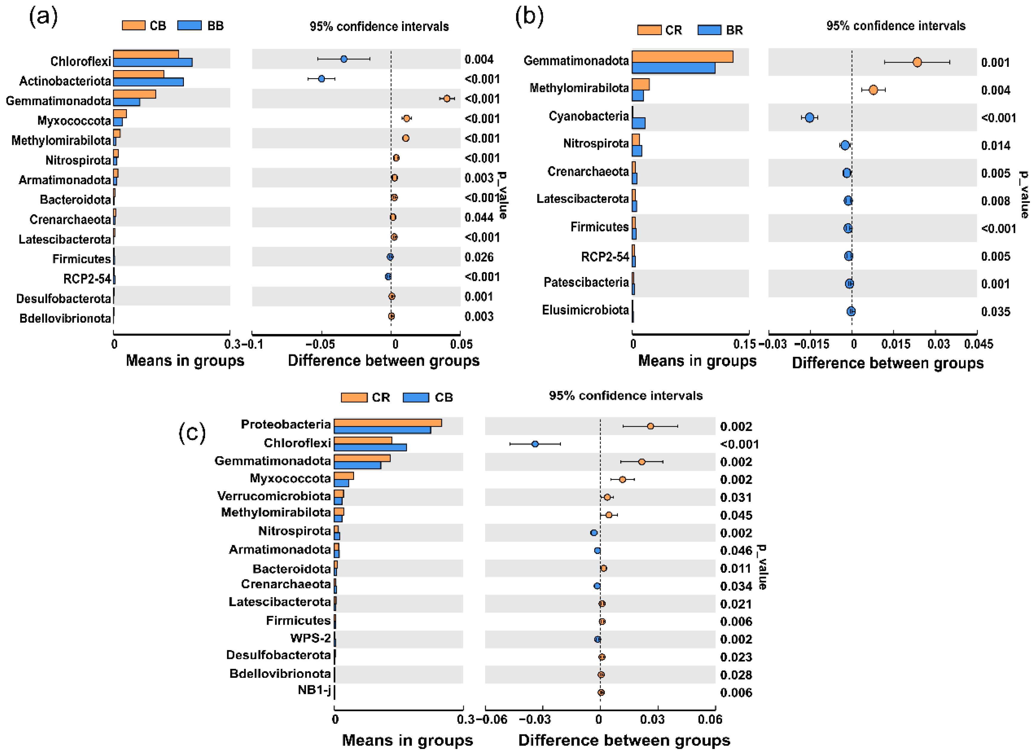 3.1.2. Identification of Differentially Abundant Phyla in Soil Bacterial Communities of a Cassava Field Under Biochar Application Using T–Test Analysis