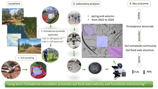 Trichoderma species not only on PPNs but also on FLNs, which reflects the functional status of soil and provides insight into interactions among microorganisms, soil, and plants. Interactions in perennial cropping systems, such as olive orchards, are highly dynamic and complex, and such studies can substantially contribute to a better understanding of the effects of bioinoculation in agroecosystems exposed to pronounced environmental variability.