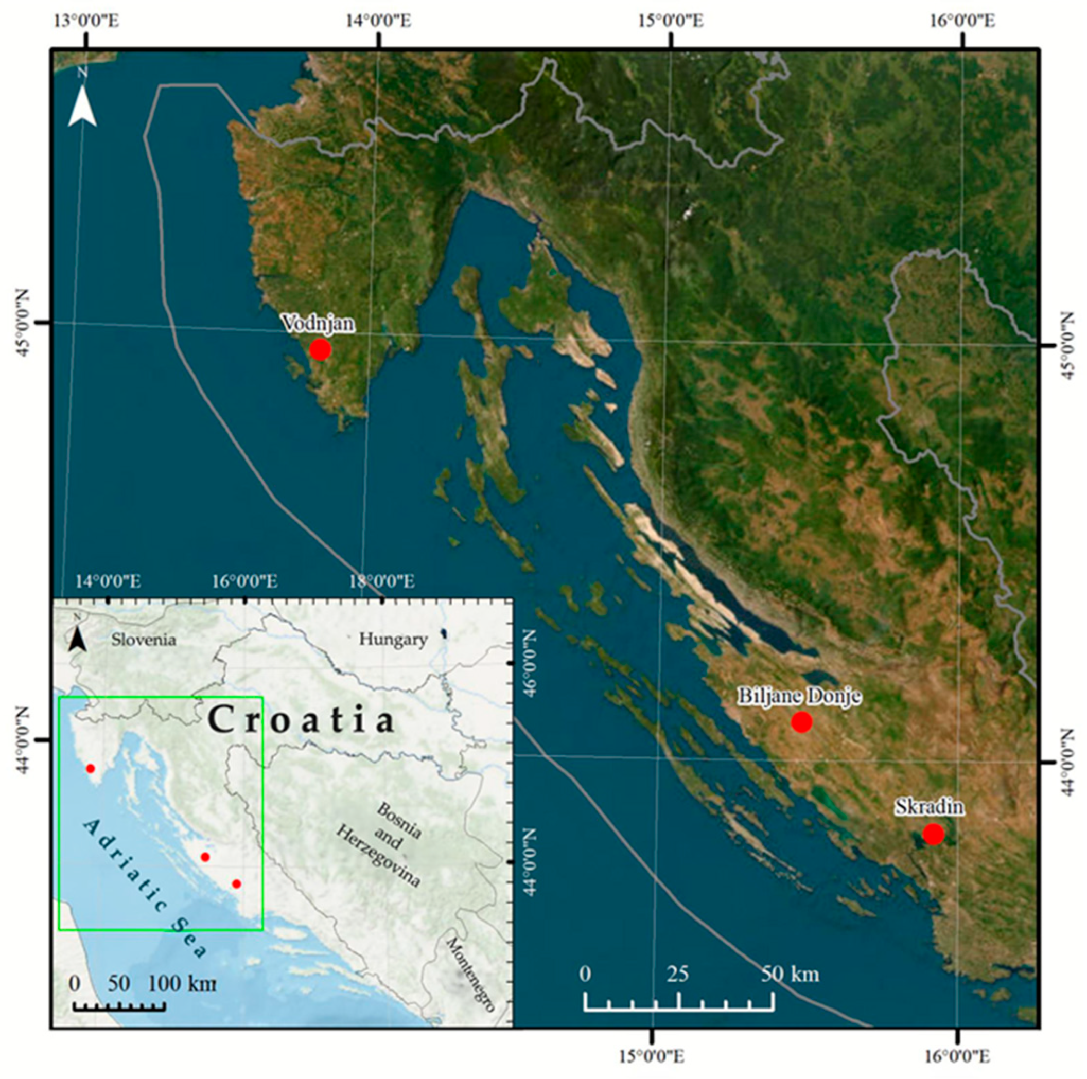 46]. In Croatia, olive cultivation extends along approximately 1000 km of the Adriatic coast, encompassing about 5.5 million trees distributed across six subregions [