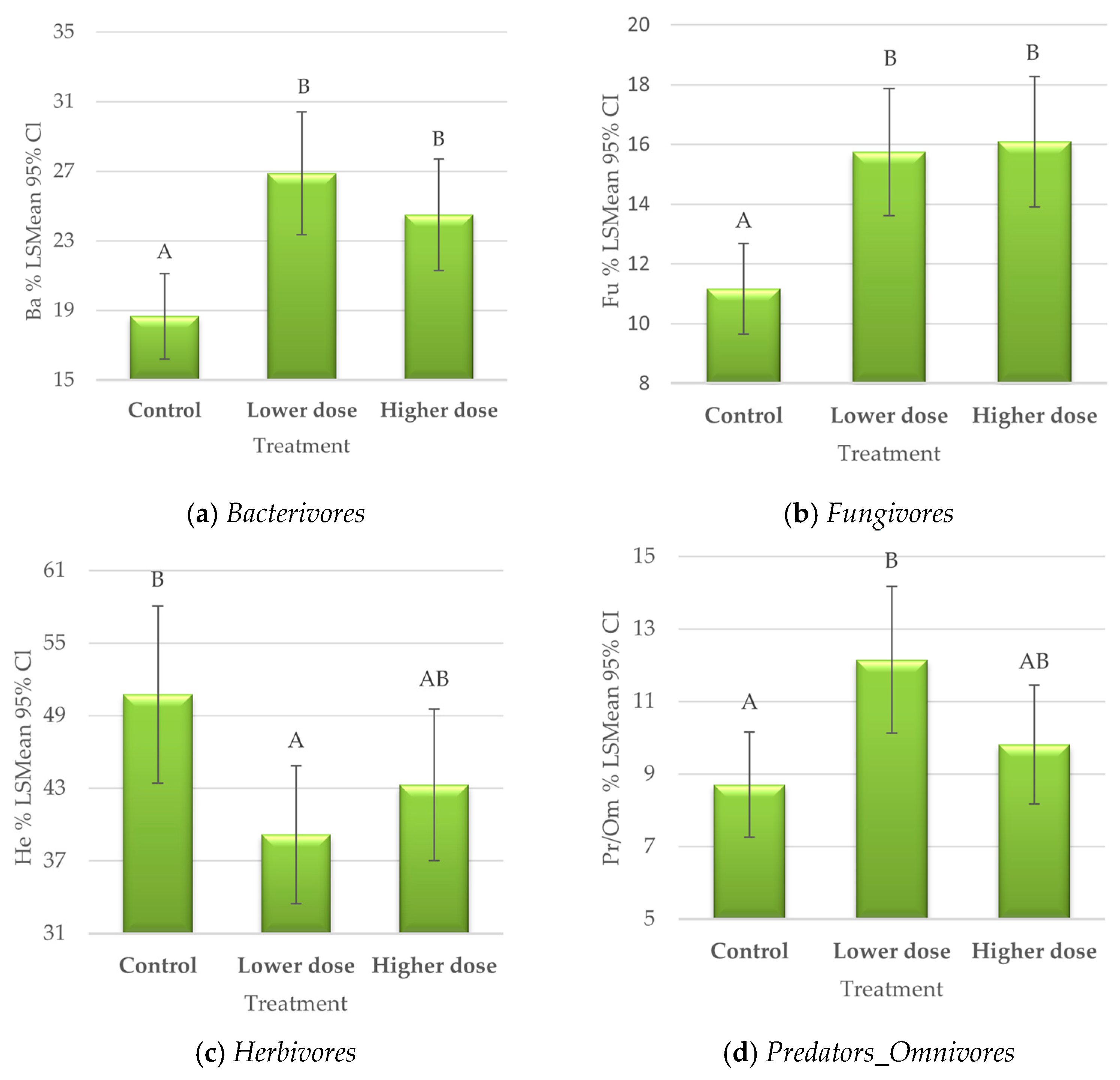 In addition to the treatment effect, a seasonal effect (spring vs. autumn) was recorded for the Ba and He trophic groups reflecting opposite seasonal trends in their abundances. In spring, an increase in Ba abundance was observed, estm. 0.45 ± 0.09 (p < 0.001), and a reduced abundance of He, estm. −12.89 ± 3.53 (p < 0.001).