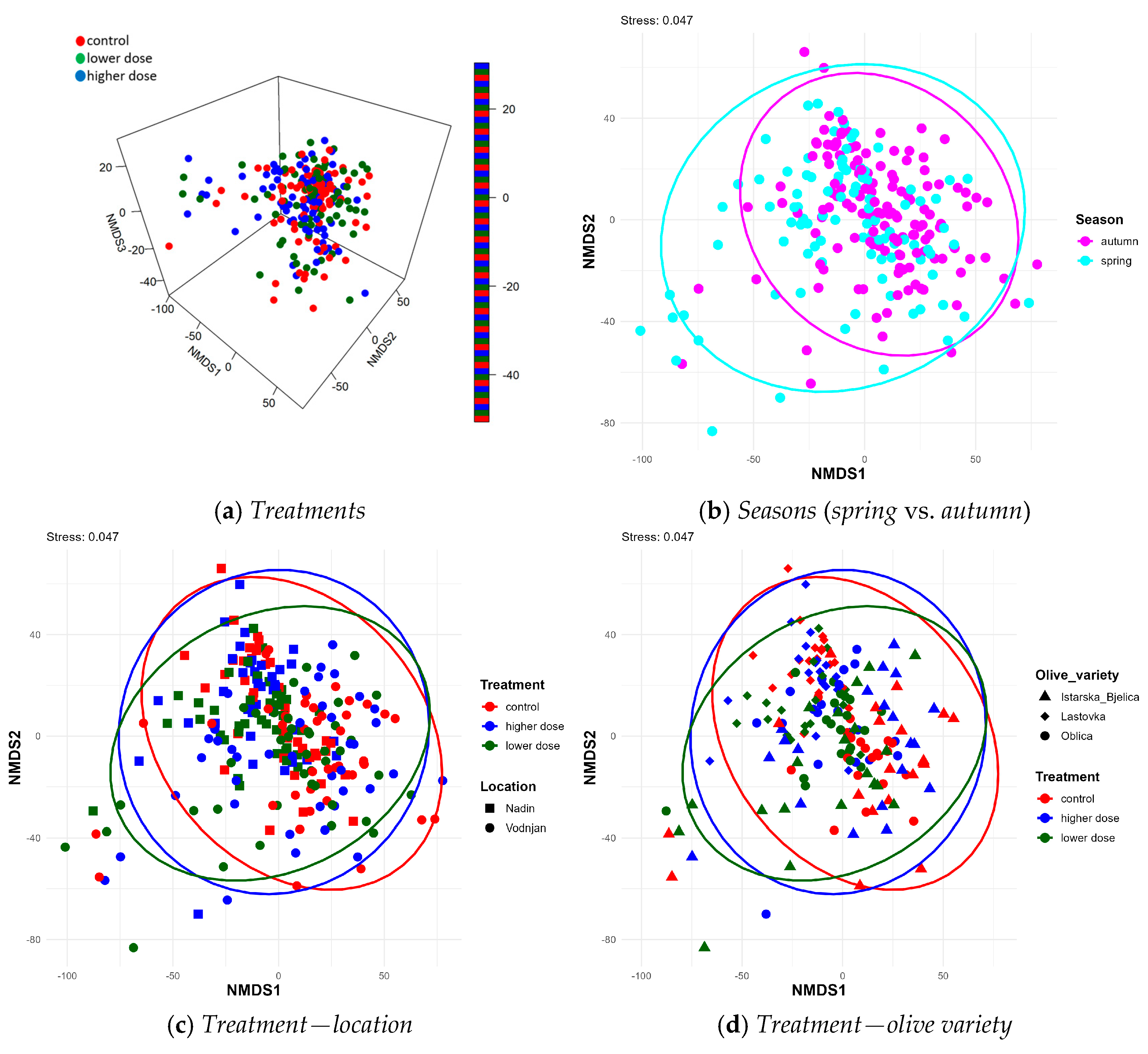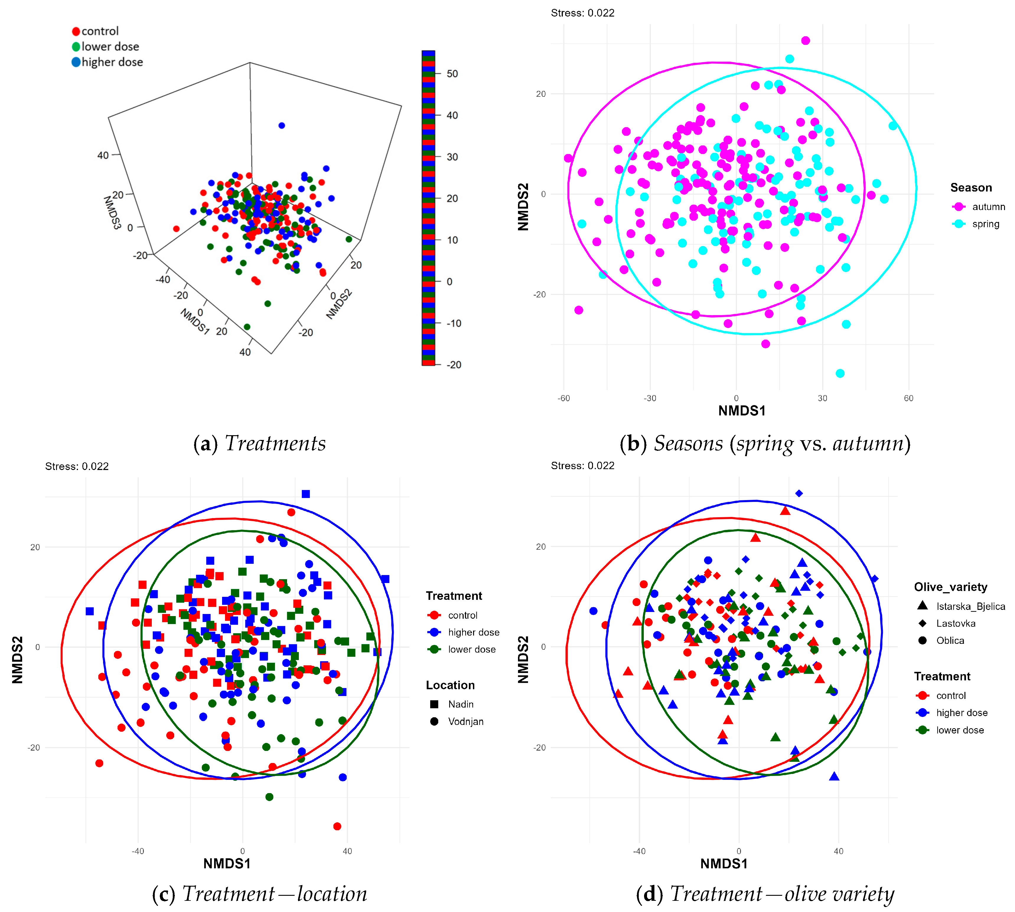 At the Vodnjan location, a lower initial abundance of He was observed, estm. −20.70 ± 8.07 (p = 0.01), and a higher abundance of Ba, estm. 0.55 ± 0.20 (p = 0.005), compared to the ref. combination (Nadin_Oblica_control_autumn_2022).