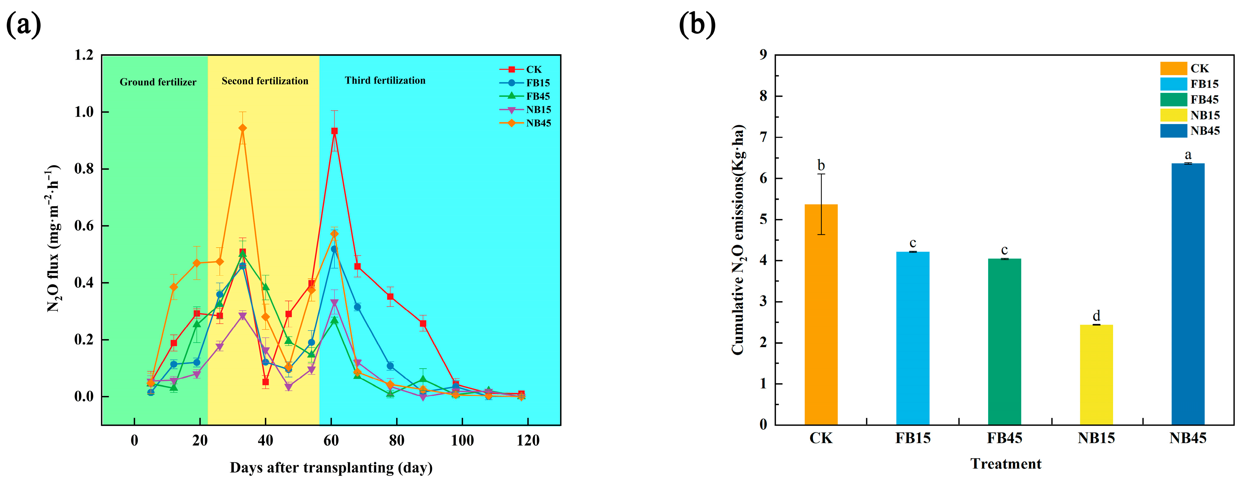 4.2. Effects of the Application Duration of Biochar on N2O Emissions from Paddy Fields
