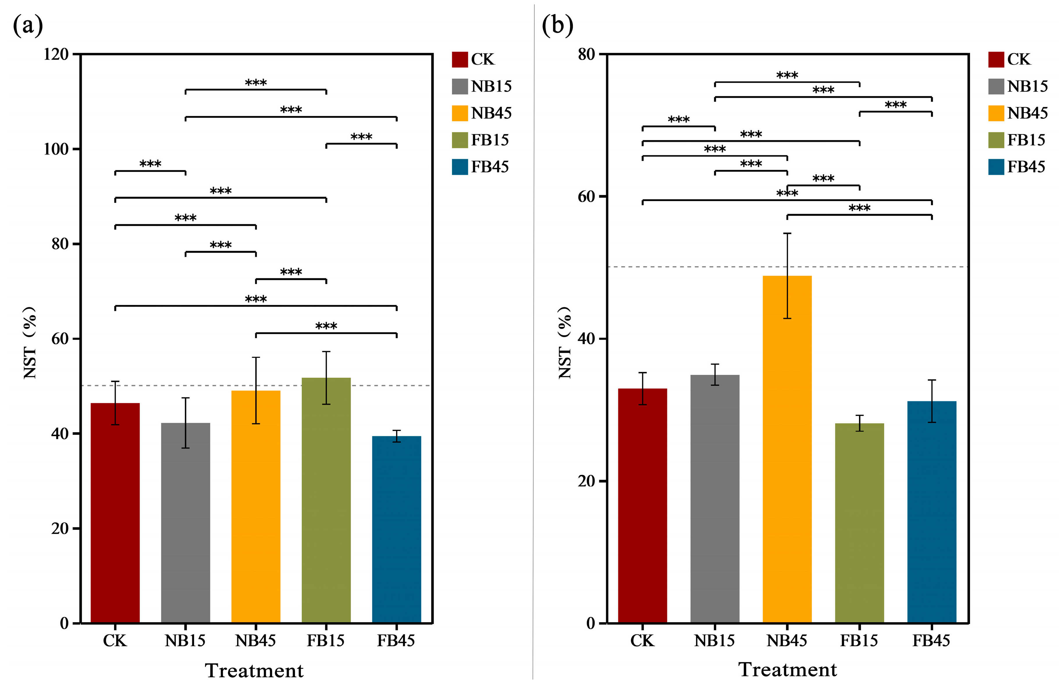 3.4. Normalized Stochasticity Ratio (NST) Analysis of the Community Structure of Nitrification and Denitrification in Paddy Field Soil
