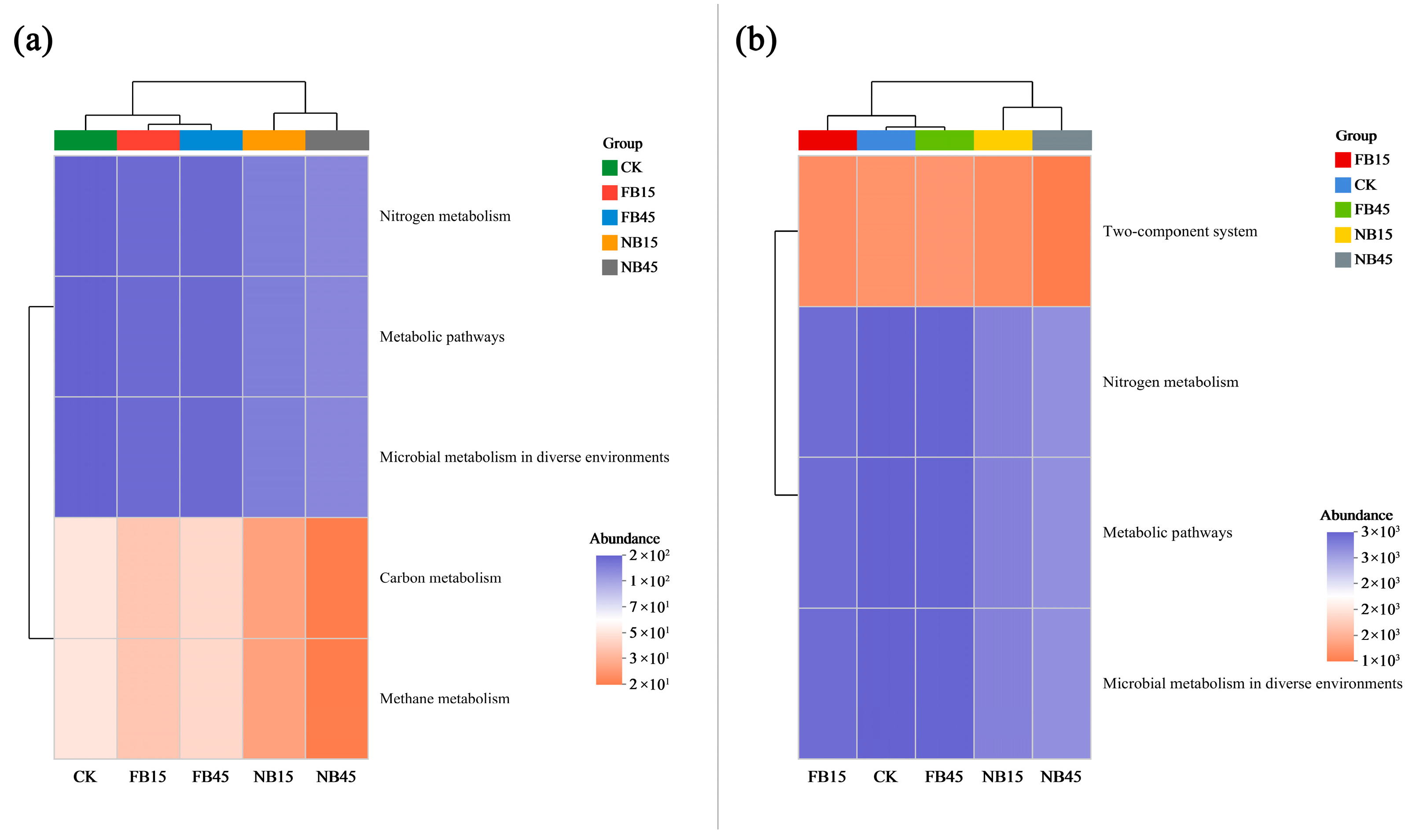 3.7. Comparison of Nitrogen Metabolism Functions Among Microbial Groups Related to Nitrification and Denitrification