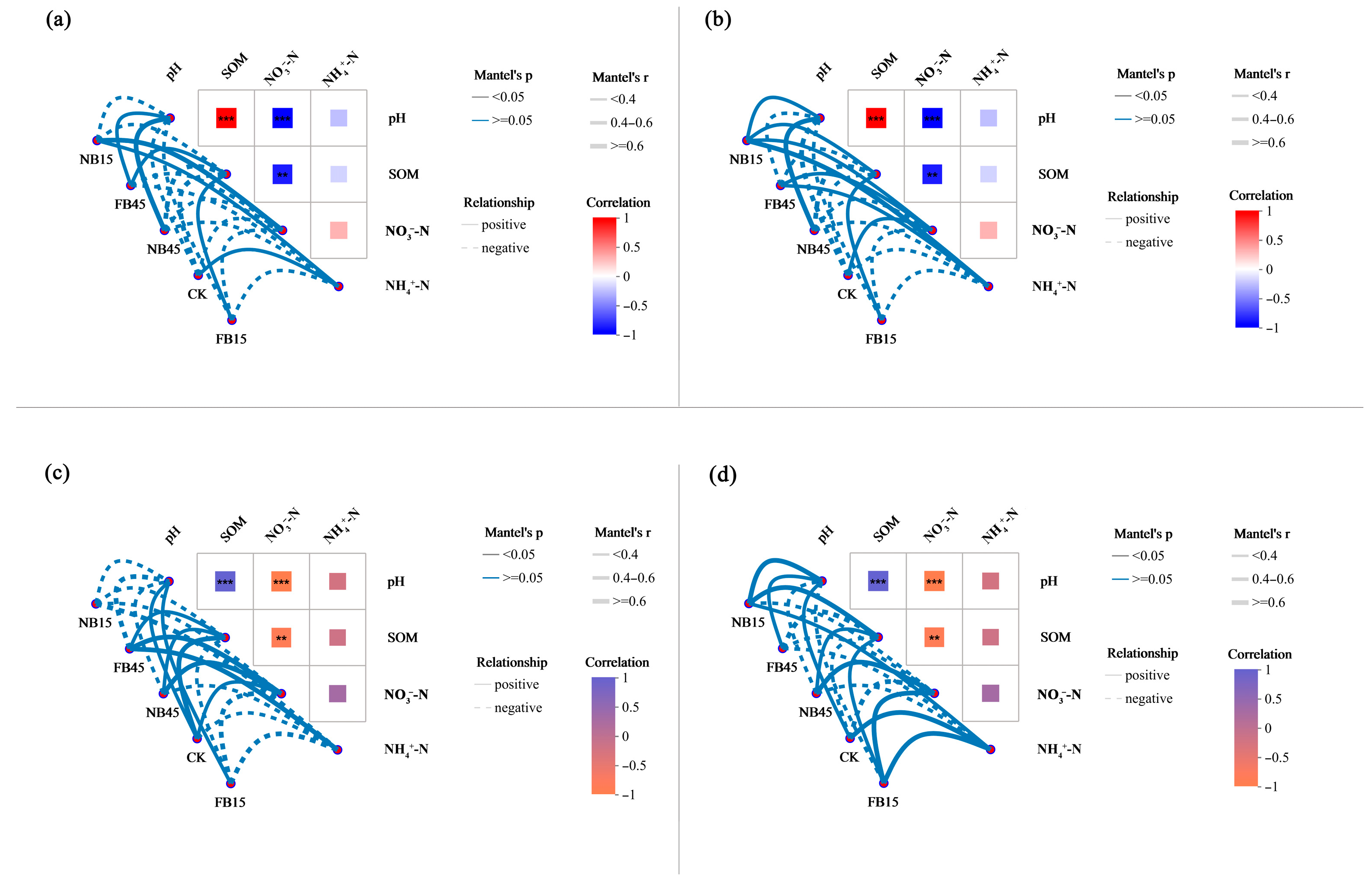 3.8. Correlation Analysis Between Microorganisms Related to Nitrification and Denitrification and Environmental Factors