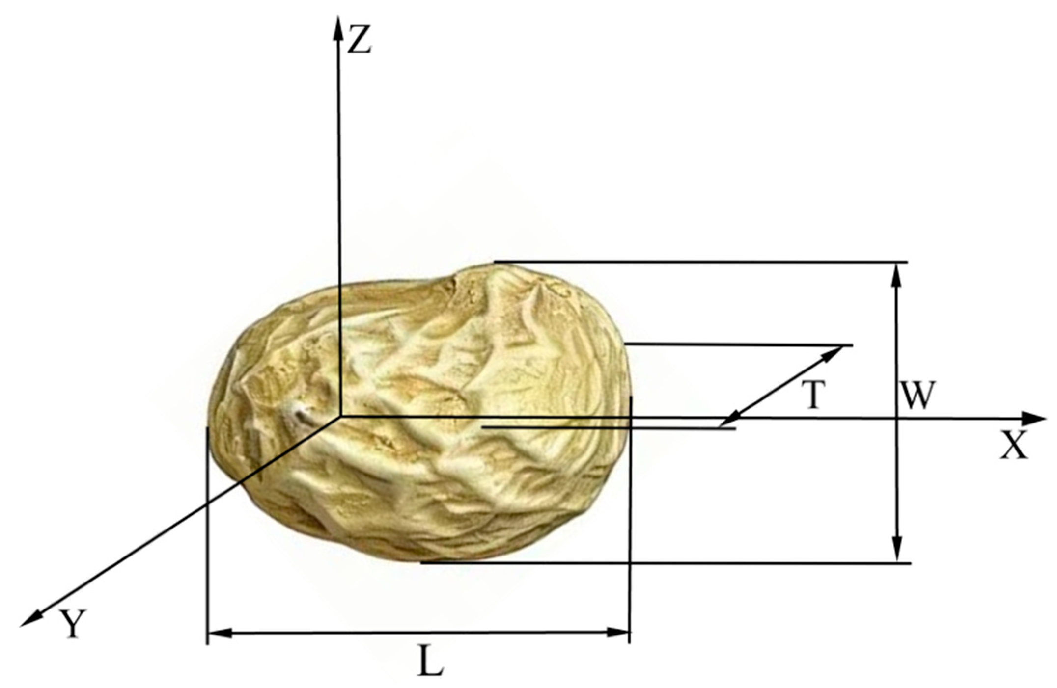 Figure 4 below. Select peanut pods that are roughly cylindrical in shape and cut a section from the middle to form the specimen. Measure the height of the specimen and then measure the inner and outer diameters separately at the upper, middle and lower positions. Calculate the cross-sectional area and use the average value during the compression process. A single-factor test is conducted at a loading rate of 2 mm/min, with each group repeated five times. The final result is taken as the mean value. The elastic moduli are calculated using formula (1):