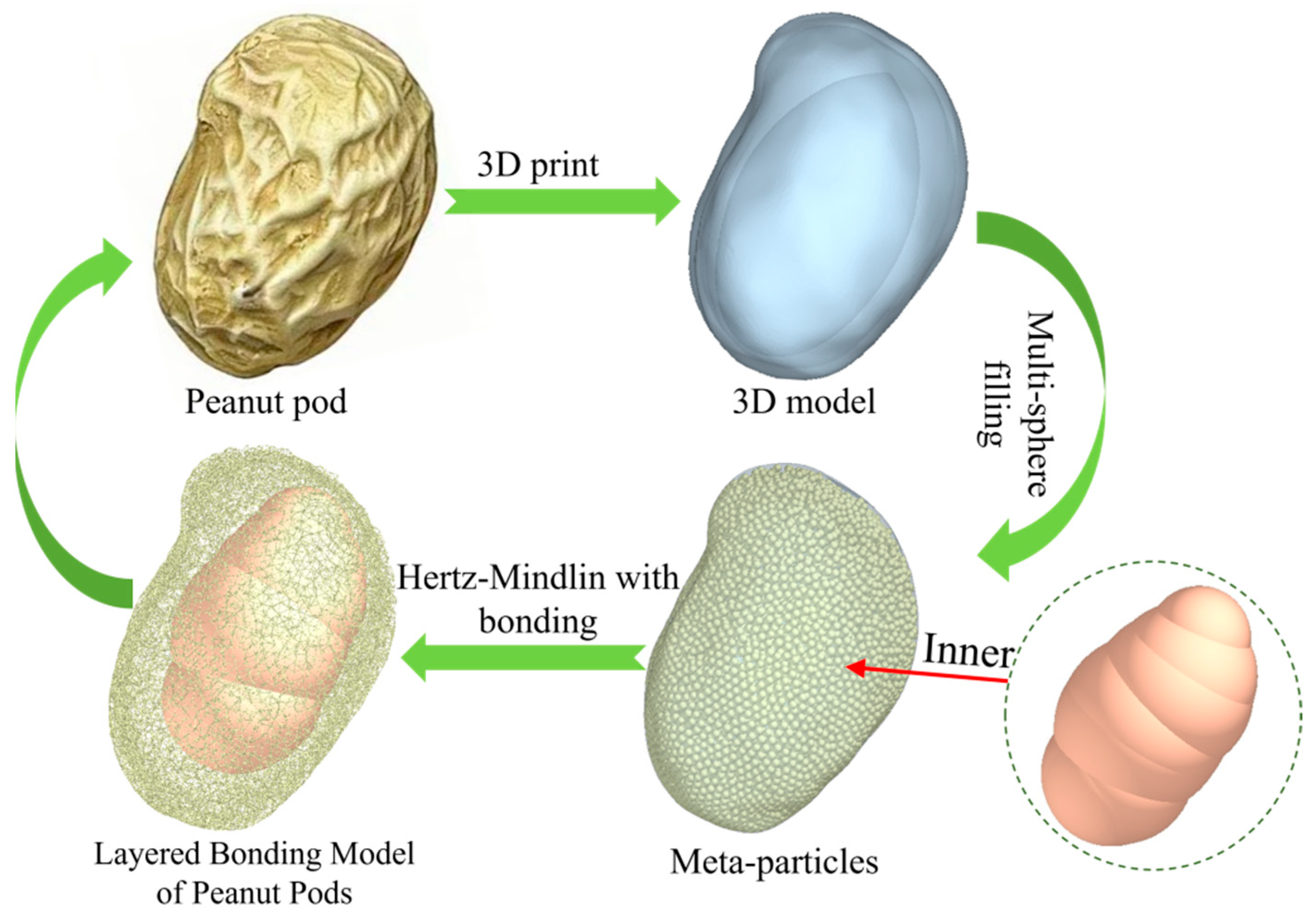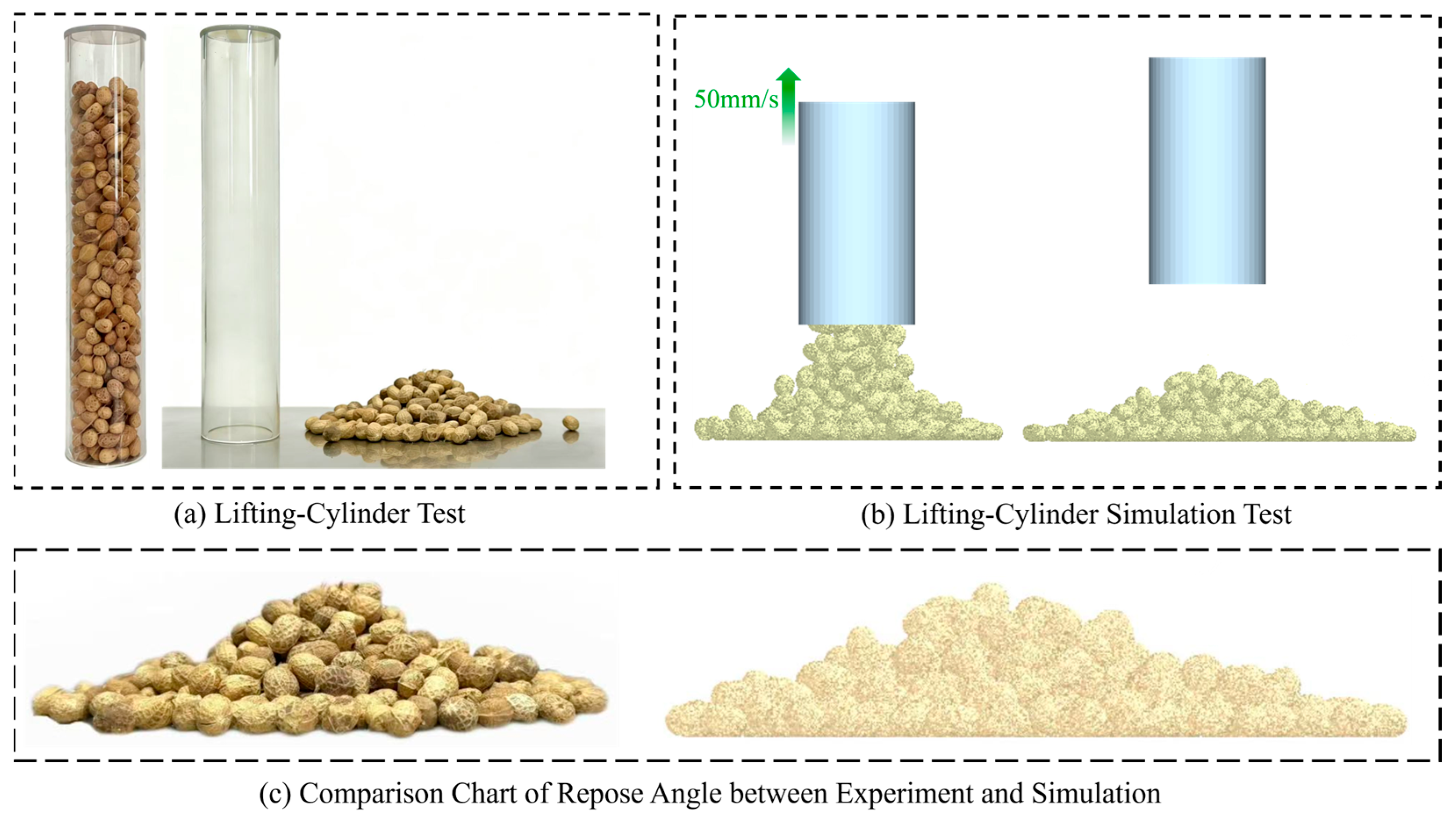 The optimal values of each parameter were obtained through a combination of BB analysis and the following calculations: peanut shell–peanut shell normal stiffness per unit area: 7.81 × 1010 N/m3; peanut shell–peanut shell shear stiffness per unit area: 9.0 × 108 N/m3; peanut shell–peanut shell critical normal stress: 2.17 × 105 N/m3; peanut shell–peanut shell critical shear stress: 2.25 × 105 N/m3.