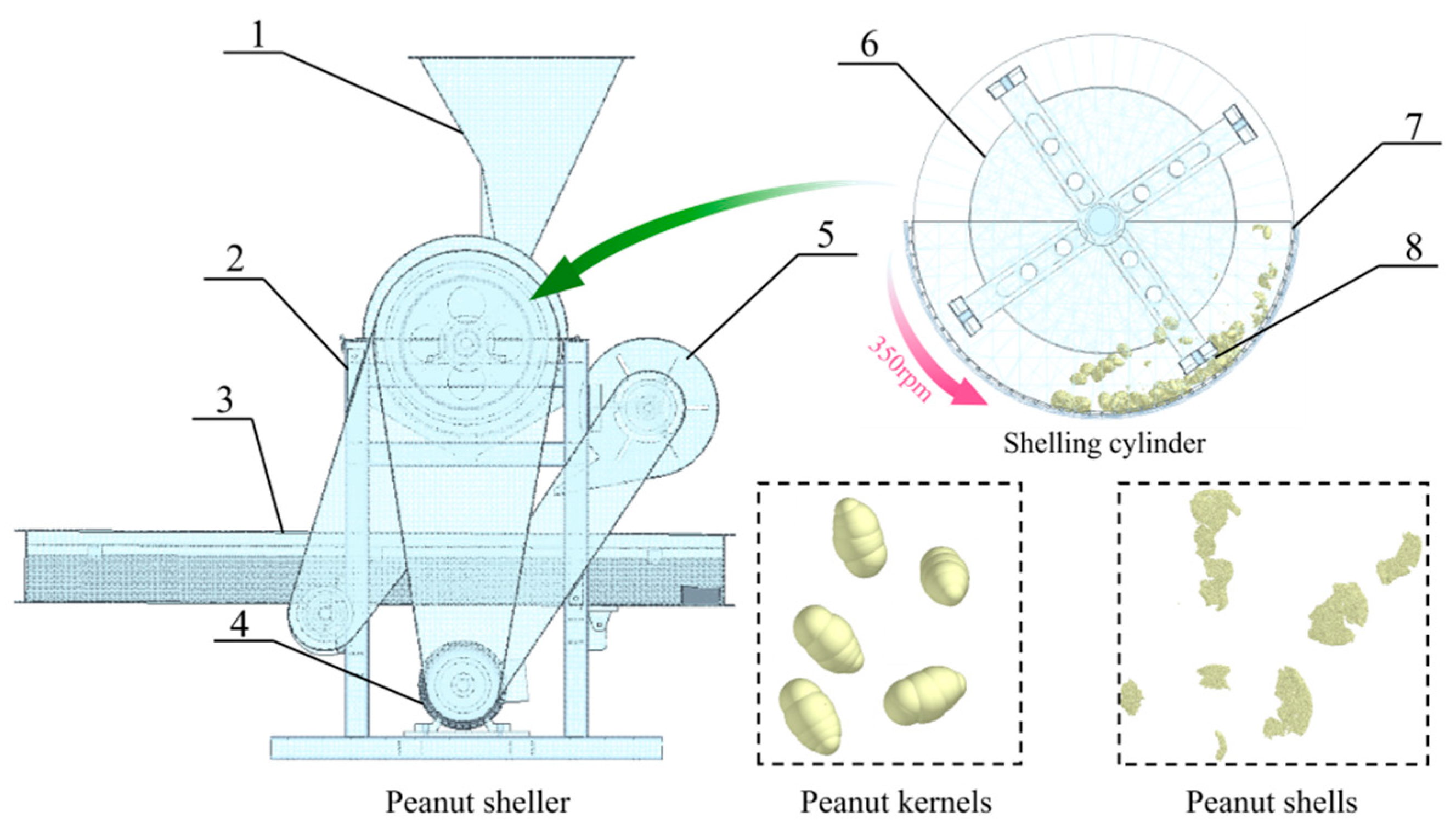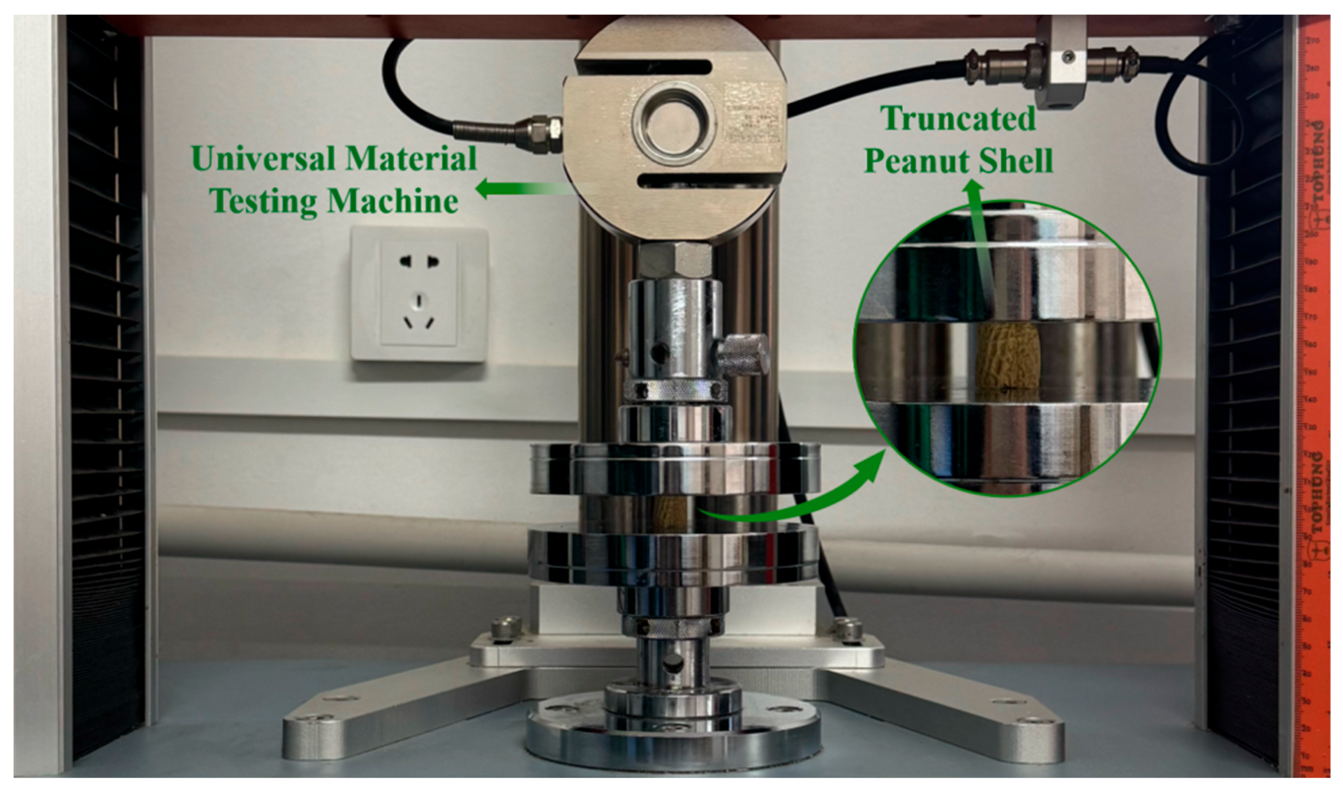 The elastic moduli of peanut shells and kernels are measured by a uniaxial compression test using a servo-controlled computerized universal material testing machine (TH-8201S, Tuobo, Suzhou, China), as shown in