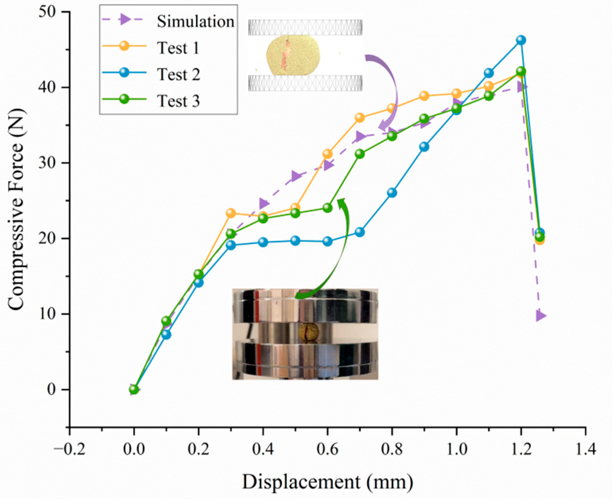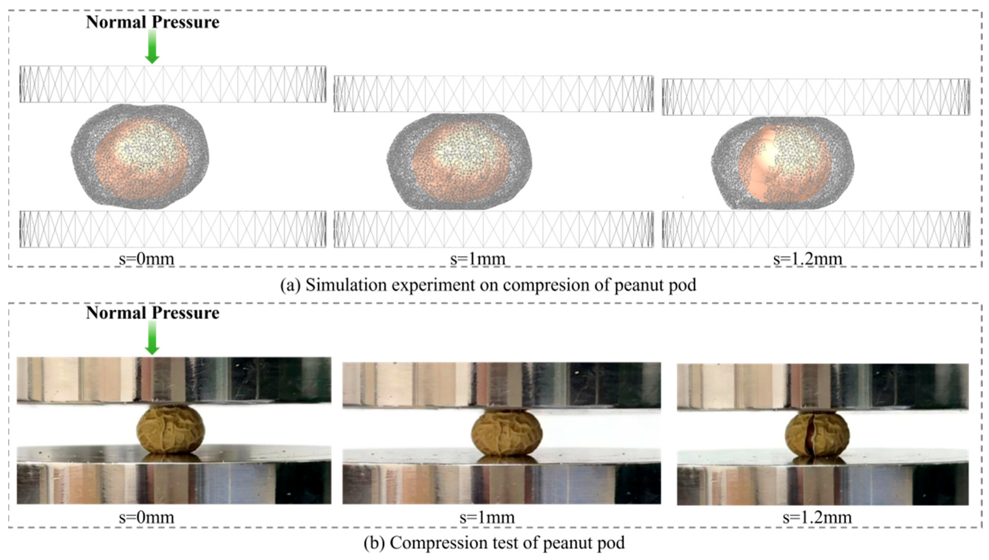 Figure 6 below shows a line chart comparing the simulation and physical experiment results for the peanut pod compression. Both curves generally exhibit an increasing trend in the compression force with compression displacement, and both experience a sharp drop at a displacement of 1.2 mm. At this point, the peanut husk ruptures and is unable to withstand any greater pressure. However, the experimental value shows a brief decrease at a displacement of 0.5 mm, potentially due to temporary contact instability in the experimental device. Meanwhile, the simulation model continues to increase in a uniform, continuous manner.