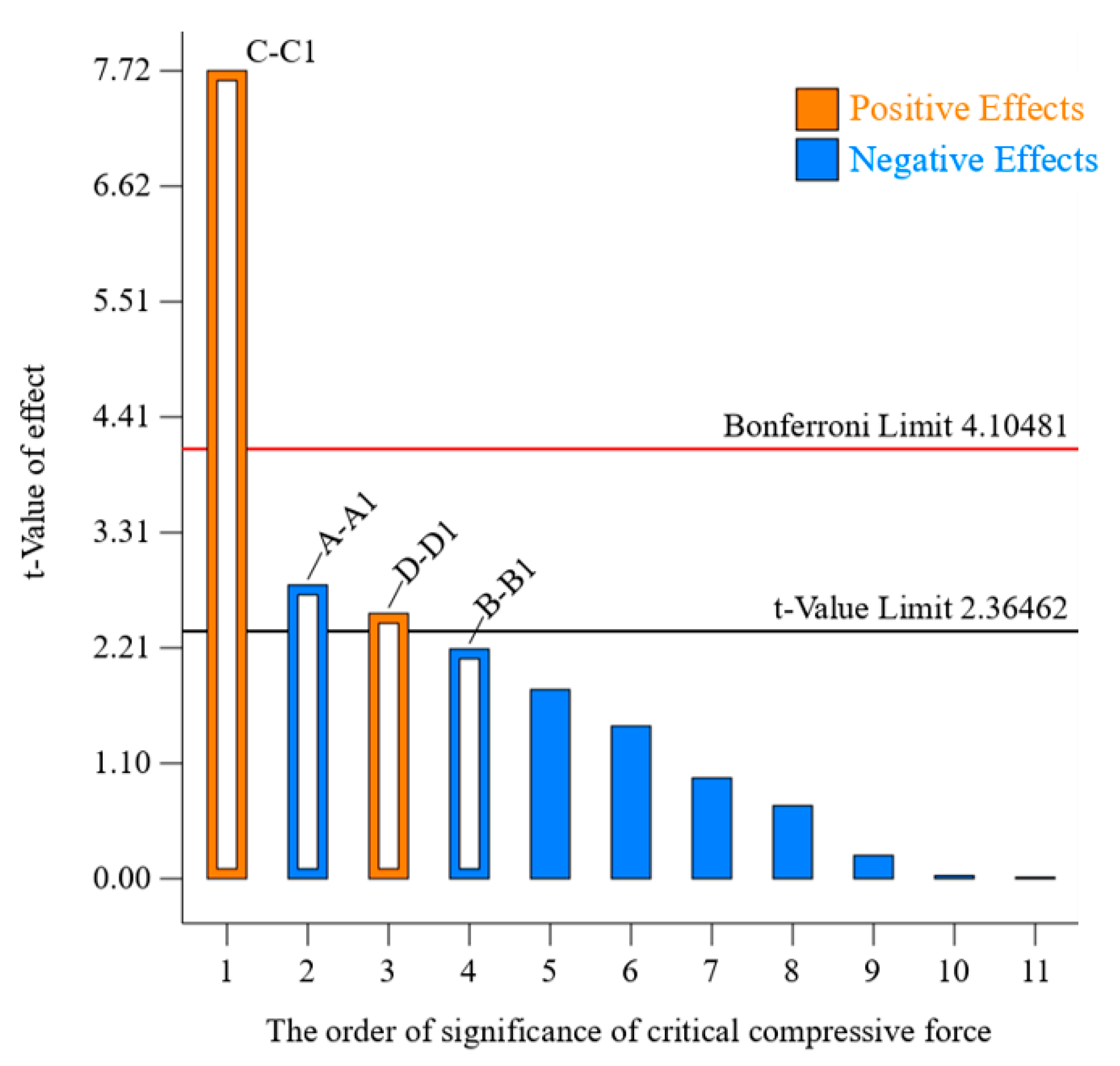 p-values of A1 and D1 are below 0.05, demonstrating that the normal stiffness per unit area and critical shear stress of the husk–husk have significant effects on the critical load. The