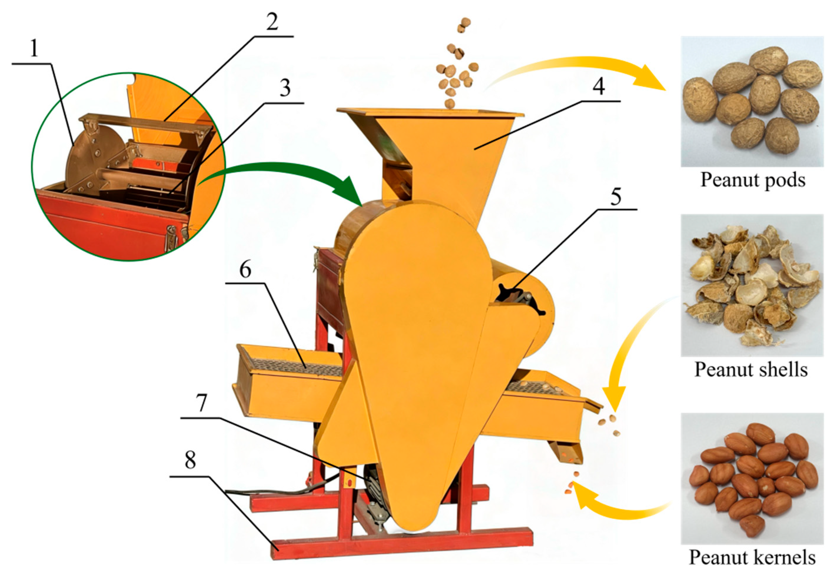 The kinetic friction coefficients were measured via the inclined plane method for the contact pairs listed below: peanut pod–steel plate, peanut shell–steel plate, peanut pod–peanut pod, and peanut shell–peanut shell. The steel plates, peanut pod plates or peanut shell plates were fixed to the panel of the inclinometer and acted as the contact materials, while the peanut pods or shells acted as the test materials and were placed on top of the contact materials. The test materials were made to roll stably on the contact materials by continuously increasing the inclination angle of the inclined plane. The tangent value of the angle indicated by the inclinometer at this point was the coefficient of rolling friction (