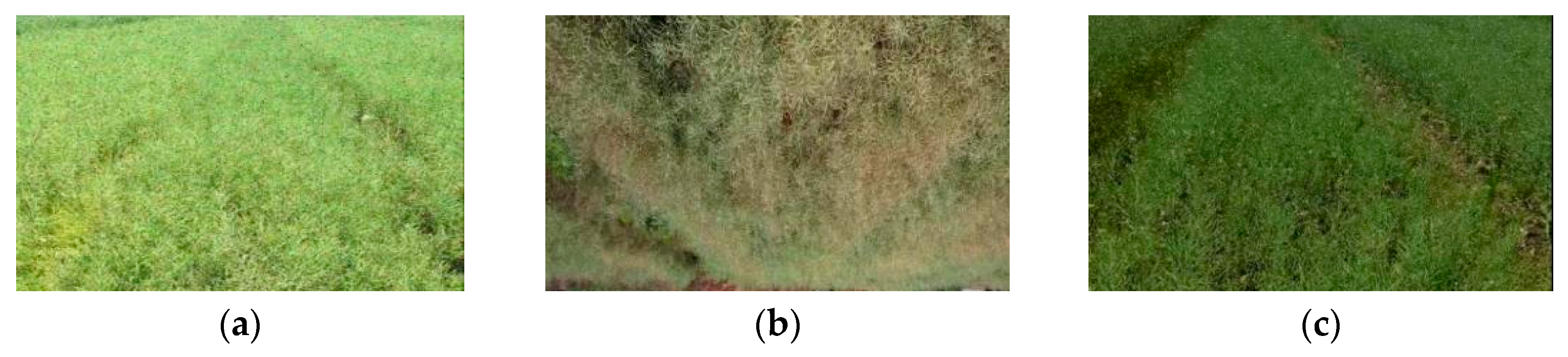The vehicle’s operational speed was controlled at 0.5 m/s, matching the working speed of actual rapeseed field management machinery to simulate dynamic image capture under real-world working conditions. Data collection periods were concentrated between 09:00–11:30 and 14:00–16:30 daily, encompassing three typical light conditions: clear skies, cloudy skies, and overcast skies. A total of 21 video segments were collected, primarily encompassing four core scenarios, as illustrated in