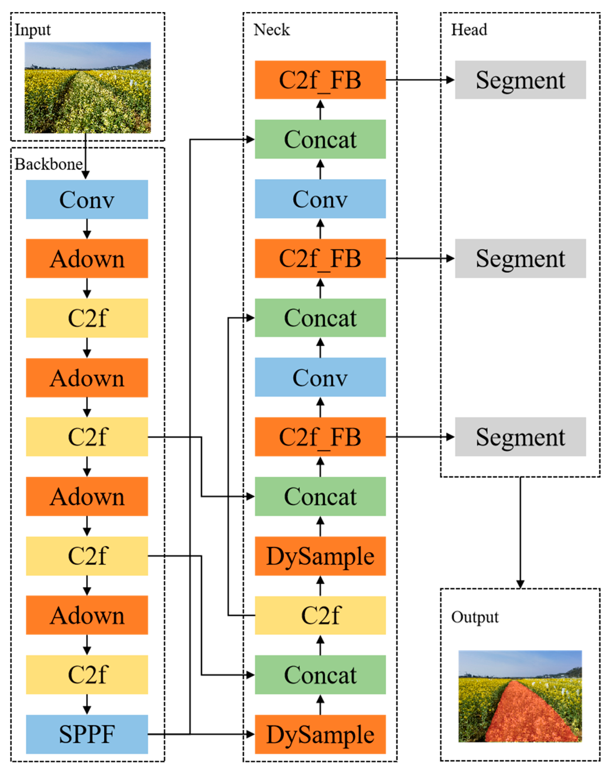 The proposed collaborative optimisation framework comprises three modules: ADown, DySample, and C2f_FB. This is not a simple amalgamation of existing lightweight components, but rather a methodologically designed approach tailored to address three core constraints identified during rapeseed parent row navigation. These modules form a progressive collaborative mechanism of “feature fidelity—edge enhancement—computational efficiency optimisation”, achieving a fundamental leap from segmentation model refinement to enhanced navigation system performance.