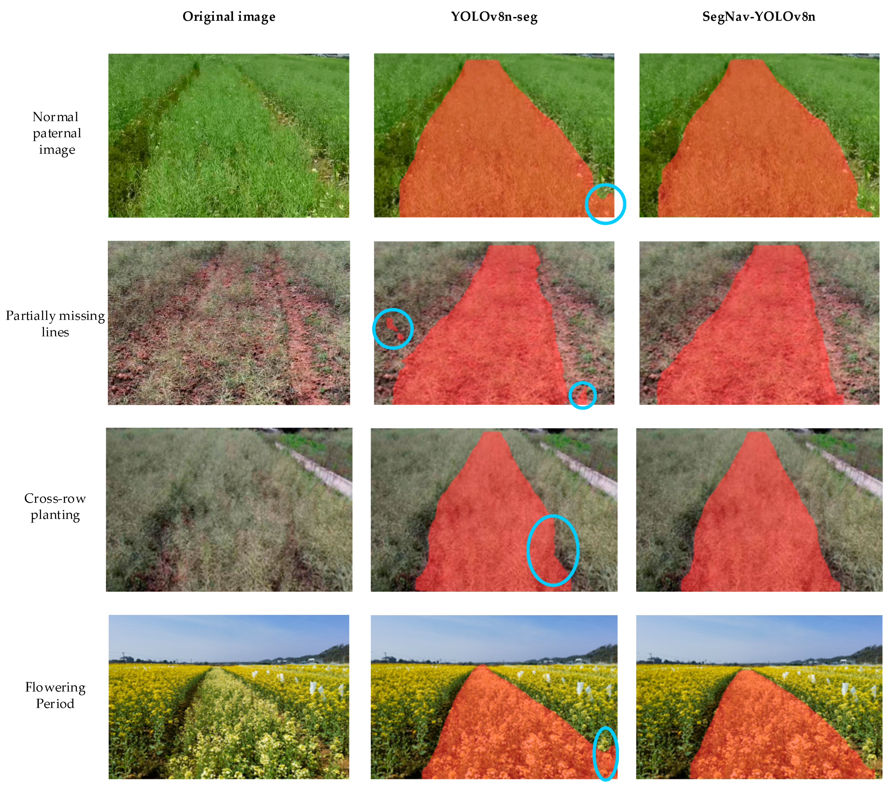 The core innovation of this study extends beyond resolving navigation line detection for rapeseed seed production paternal rows. Crucially, it proposes a “navigation-constraint-driven lightweight segmentation-fitting integrated approach”, achieving substantial progress in three key areas: 1. Transition from scene description to failure quantification: Complex field scenarios such as high-density planting of rapeseed paternal lines and weed interference were converted into quantifiable navigation failure criteria using an 11.5 pixel threshold (corresponding to ±30 cm in actual fields). This provides a reference for navigation research on densely planted, visually similar crop rows. 2. Method optimisation from module replacement to constraint design: Establishing a framework of “navigation performance requirements—Customised Module Development—End-to-End Collaborative Optimisation” framework. Through the synergistic operation of the ADown, DySample, and C2f_FB modules, it was validated that optimisation of lightweight segmentation models must precisely align with core navigation system requirements (e.g., boundary integrity and real-time response speed), rather than merely pursuing numerical improvements in segmentation metrics. This offers new insights for model design in agricultural machinery embedded navigation systems. 3. Providing guidance for navigation in similar crop scenarios: The proposed lightweight segmentation–polynomial fitting integrated approach demonstrates strong transferability for row navigation scenarios in crops like wheat, which share dense planting patterns and similar growth characteristics with rapeseed. This offers valuable reference for navigation technology development in such crops. Leveraging the advantages of modular design, this approach holds promise for adapting to the morphological characteristics of diverse crops. It offers a technically replicable and practically valuable solution for intelligent field management of densely planted crops within smart agriculture.