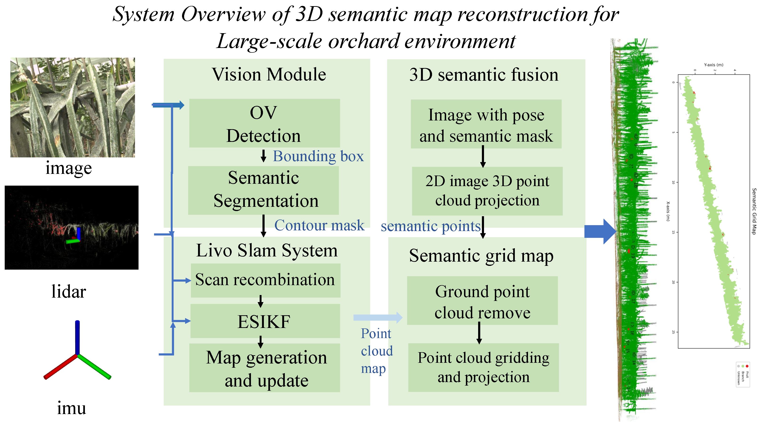 Chicago/Turabian StyleWang, Quanchao, Yiheng Chen, Jiaxiang Li, Yongxing Chen, and Hongjun Wang. 2026. "3D Semantic Map Reconstruction for Orchard Environments Using Multi-Sensor Fusion" Agriculture 16, no. 4: 455. https://doi.org/10.3390/agriculture16040455
