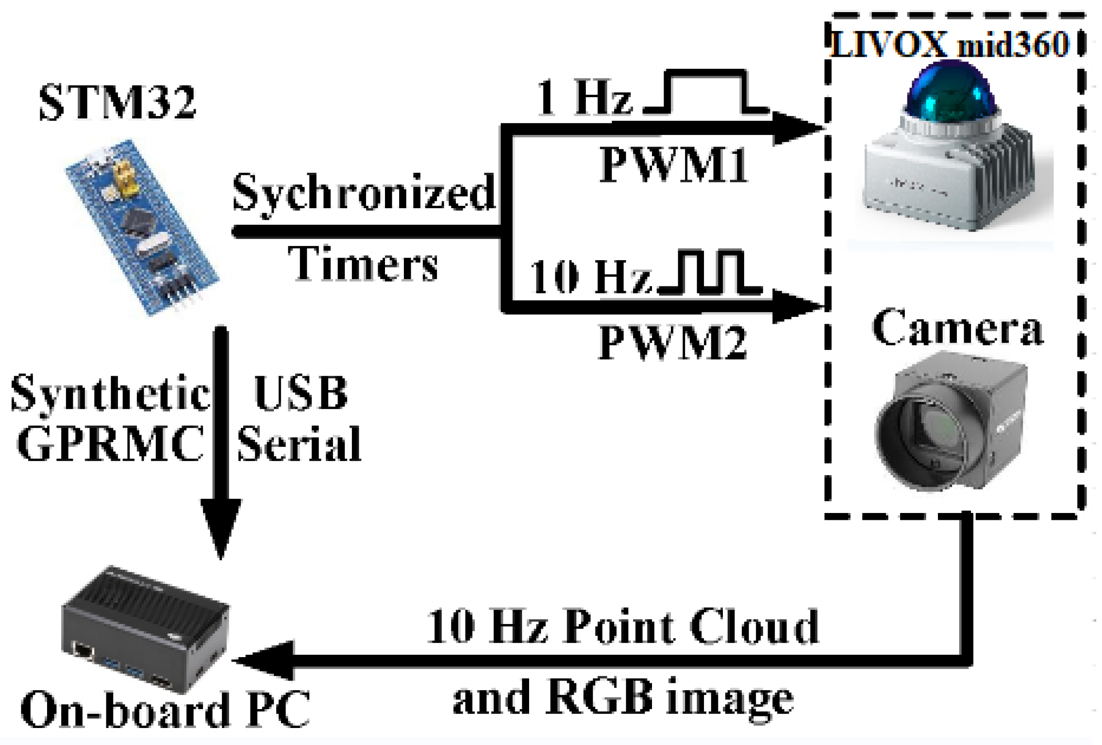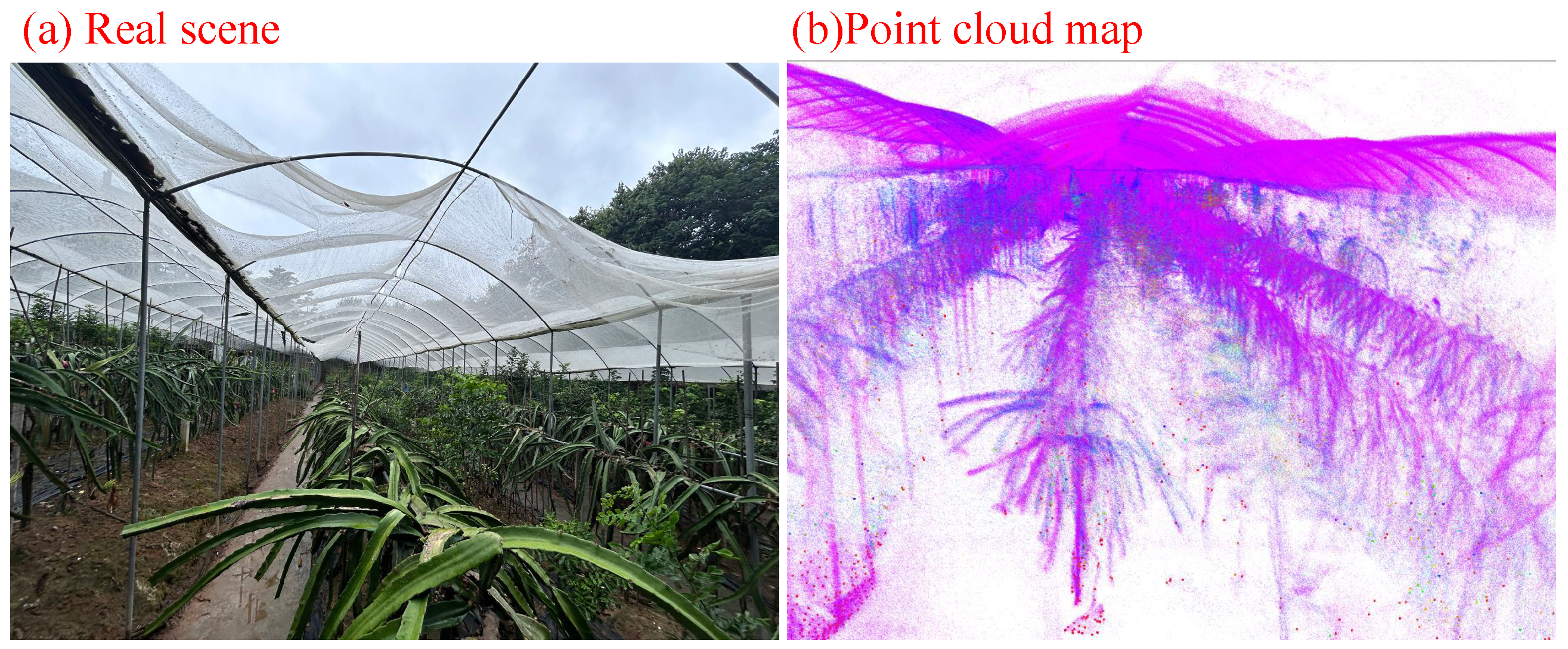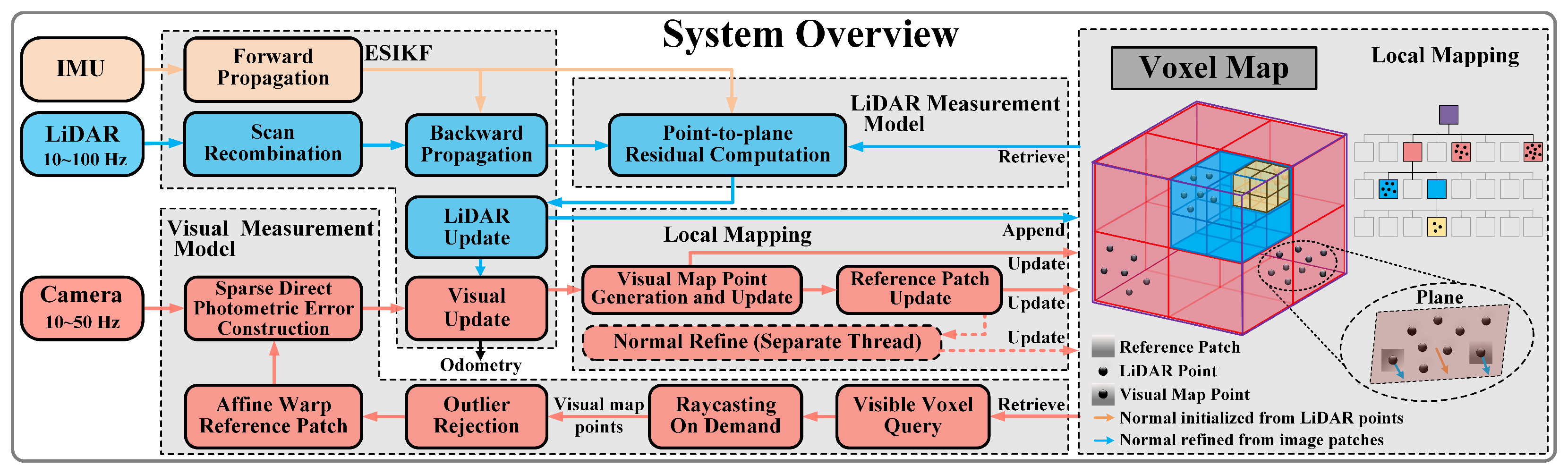 - Zheng, C.; Zhu, Q.; Xu, W.; Liu, X.; Guo, Q.; Zhang, F. Fast-livo: Fast and tightly-coupled sparse-direct lidar-inertial-visual odometry. In Proceedings of the 2022 IEEE/RSJ International Conference on Intelligent Robots and Systems (IROS), Kyoto, Japan, 23–27 October 2022; IEEE: Piscataway, NJ, USA, 2022; pp. 4003–4009. [Google Scholar]