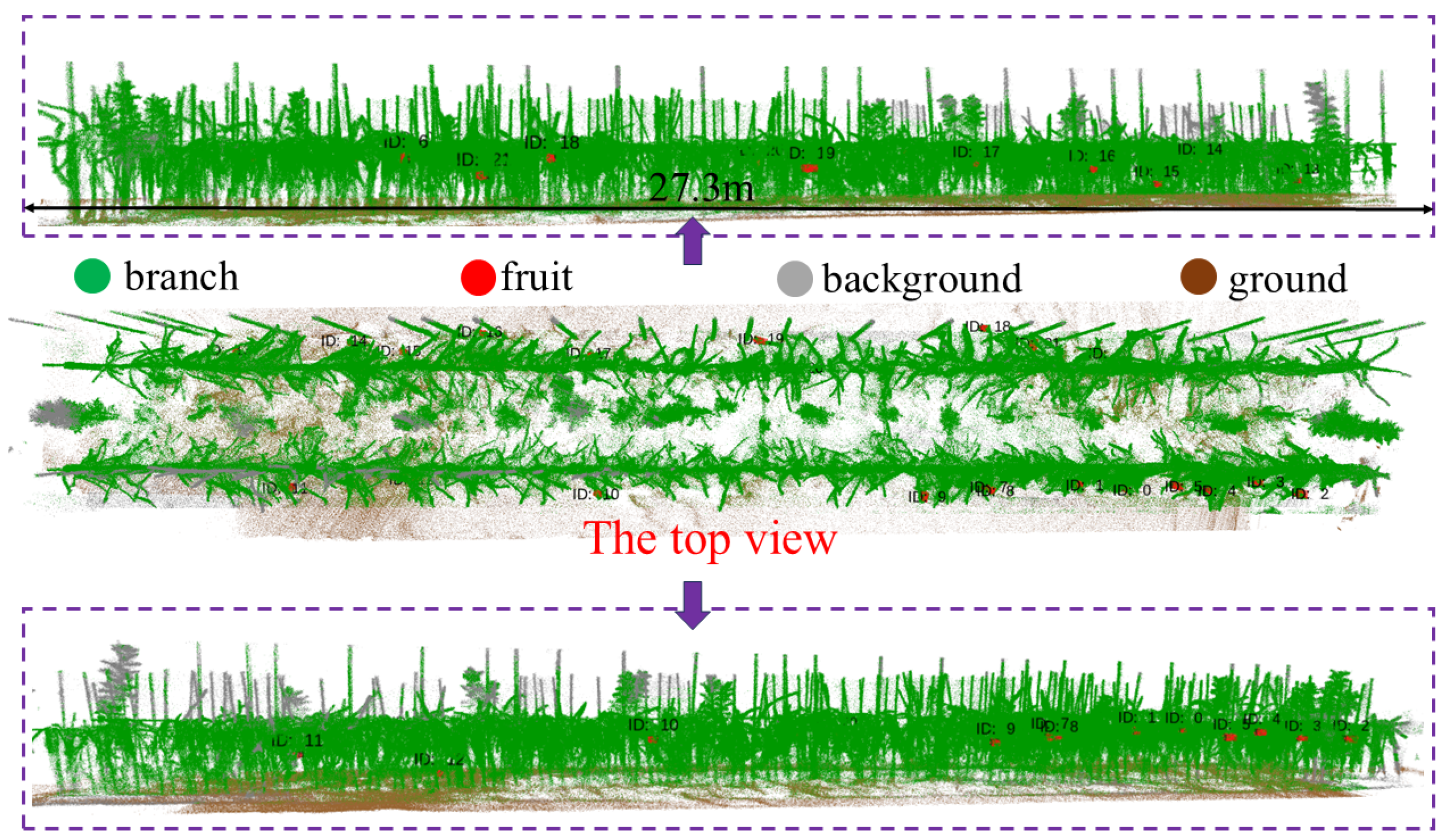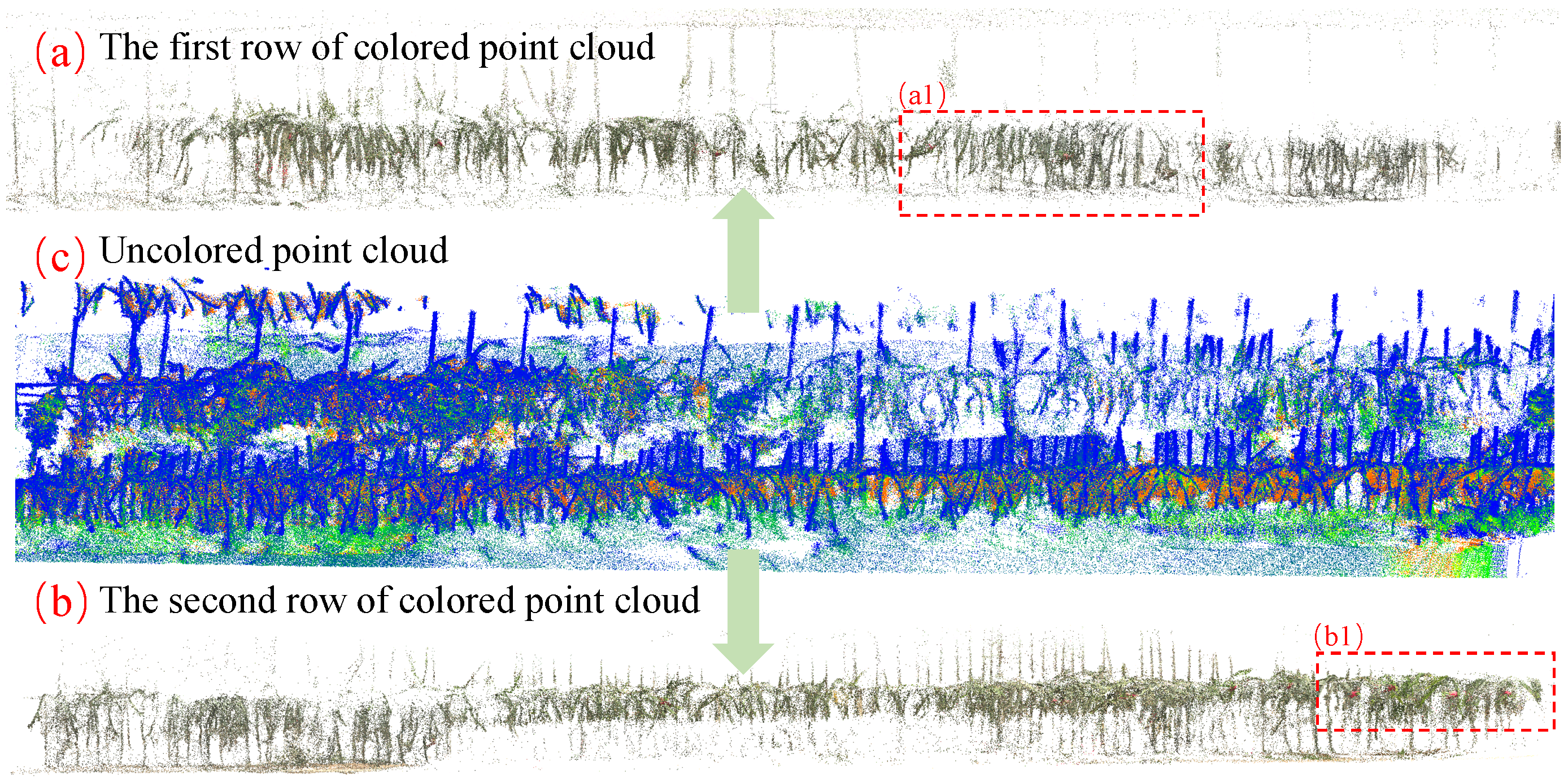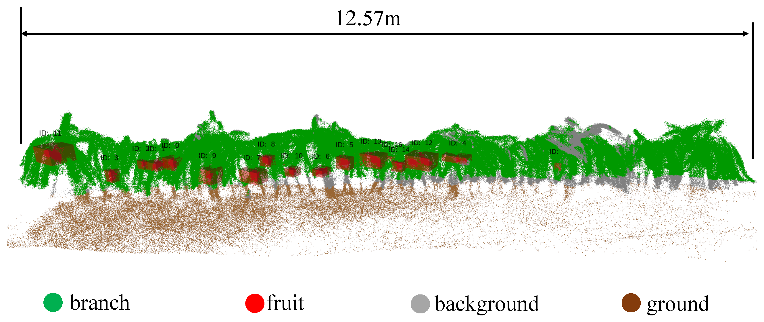 - Point cloud noise: Influenced by factors such as LiDAR measurement accuracy, multipath reflections, and edge effects, semantic point clouds inevitably contain outliers and areas with blurred boundaries. This noise interferes with density-based clustering algorithms, leading to adjacent fruits being incorrectly merged or individual fruits being excessively fragmented;
