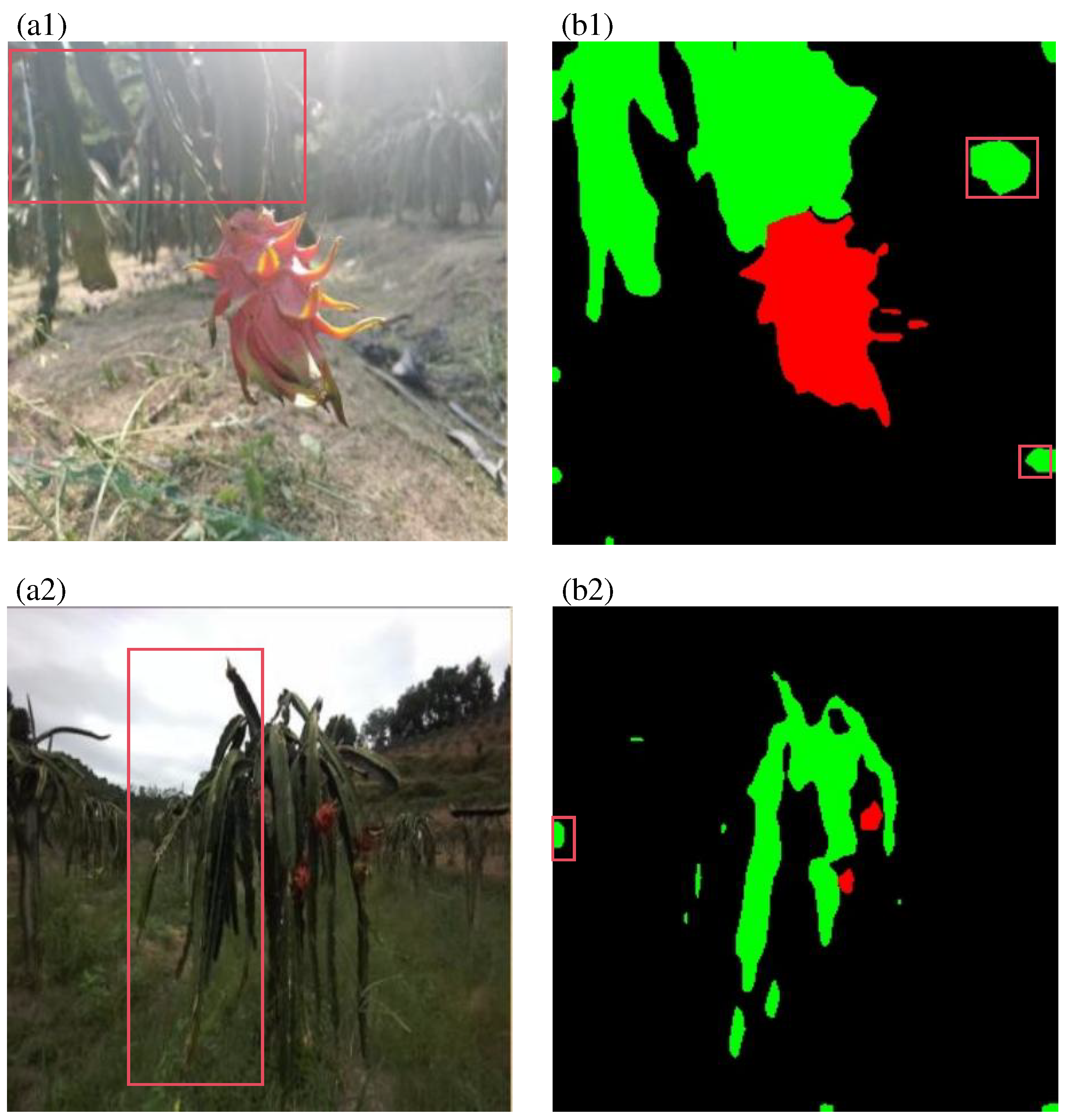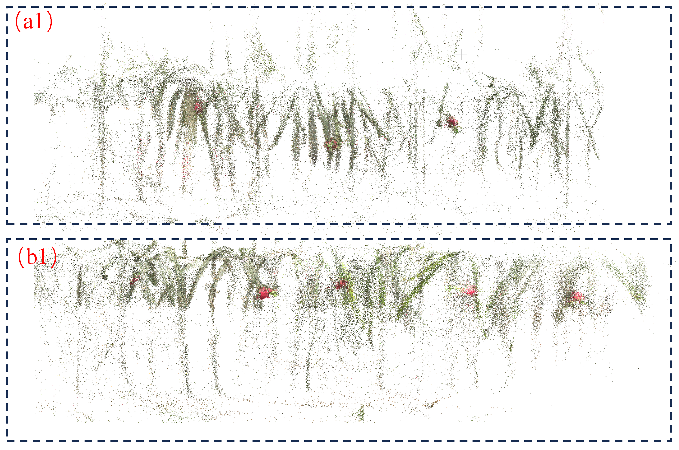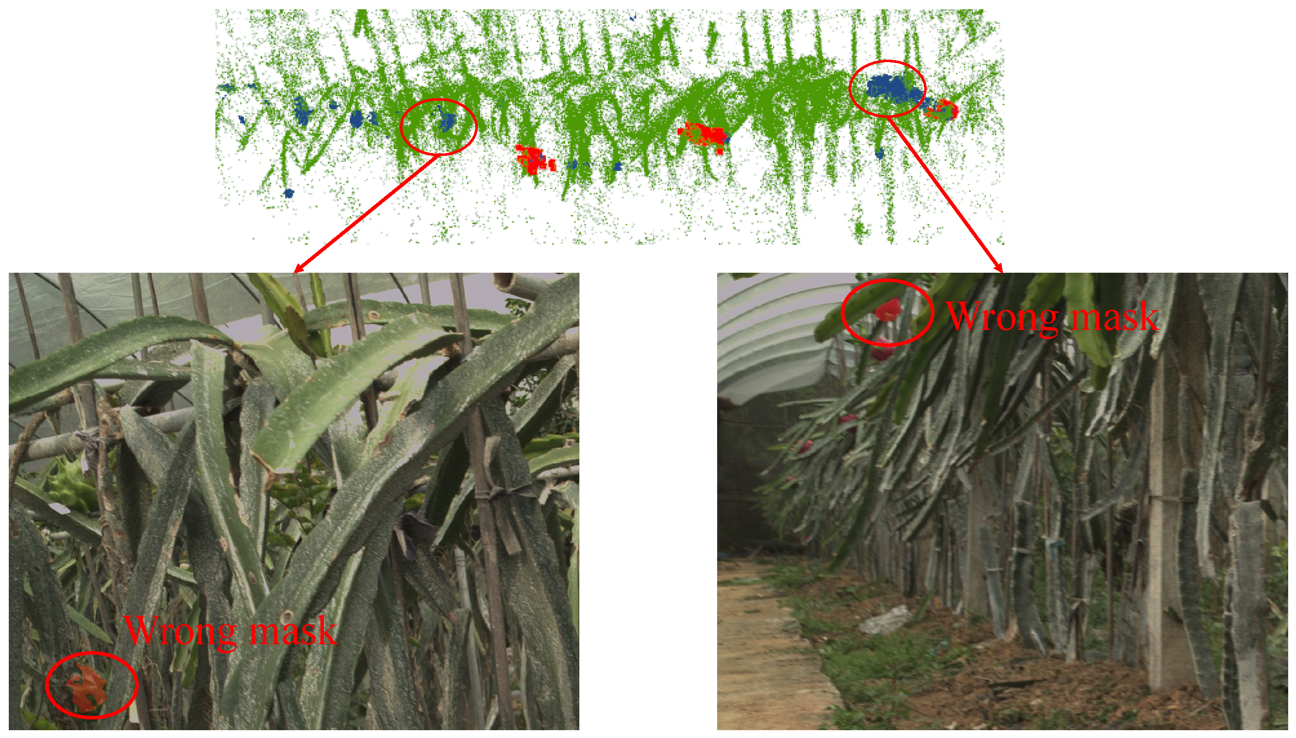 - Occlusion issues: In natural orchard environments, dragon fruit are often obscured by dense branches and foliage. Some fruits have only a small portion of their surface exposed within the sensor’s field of view, preventing complete reconstruction in the 3D point cloud and leading to missed detections.