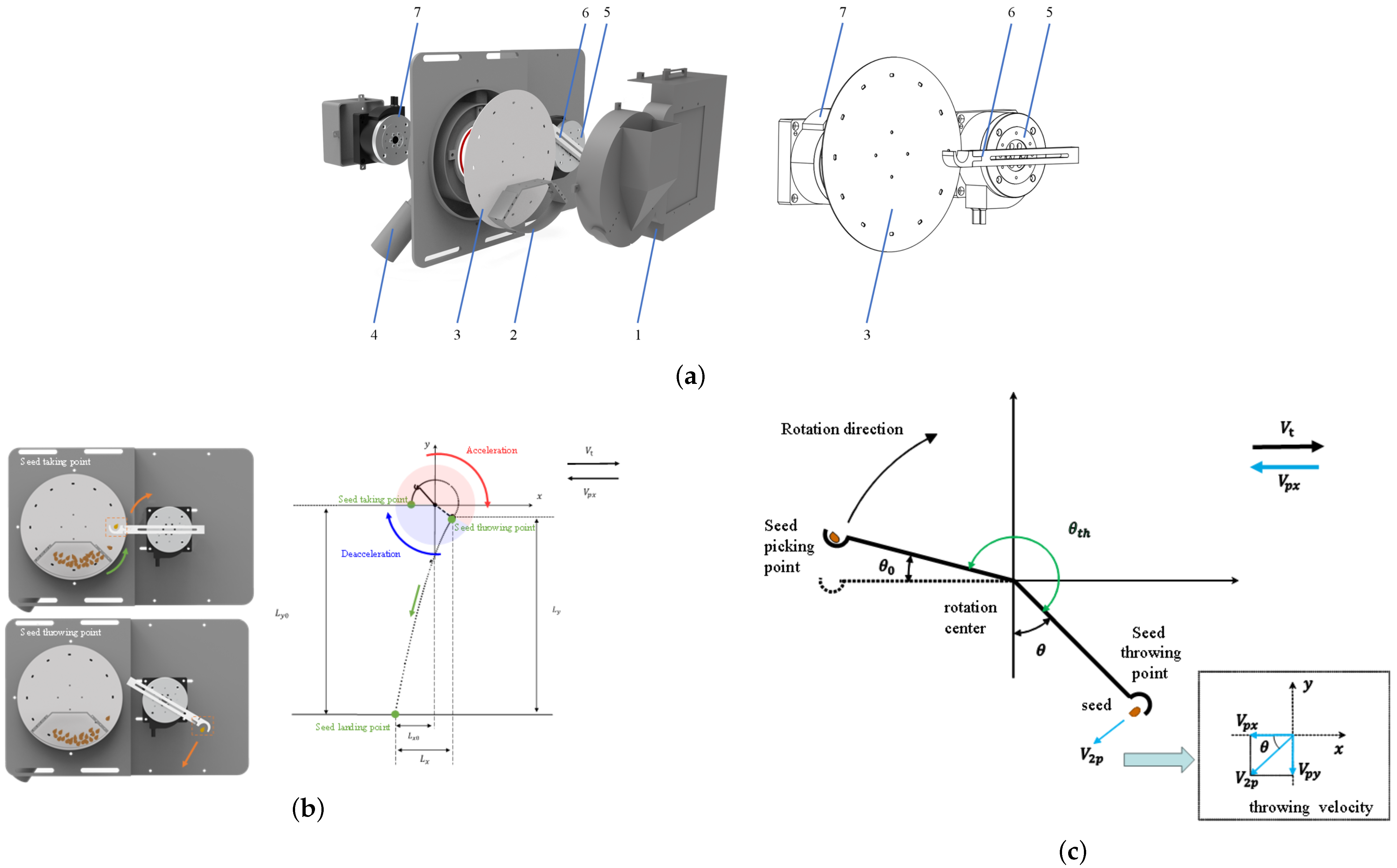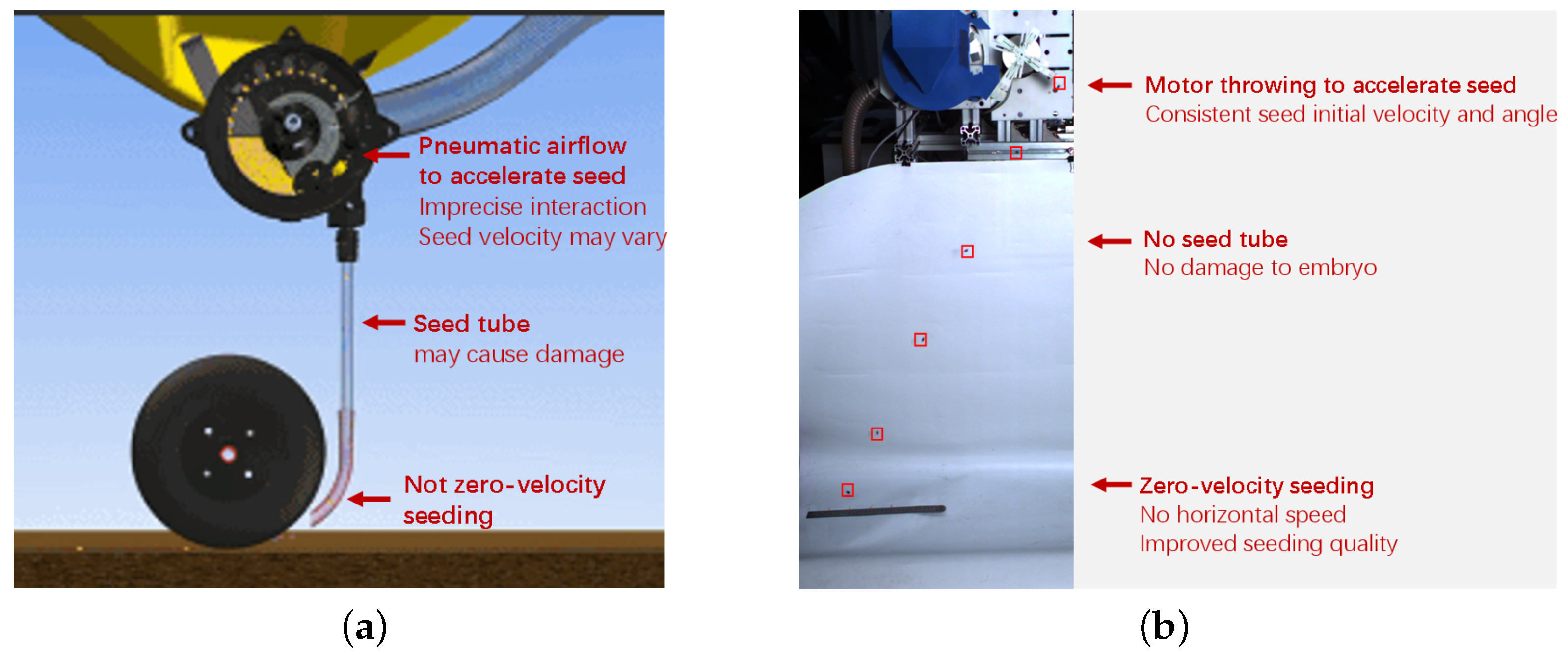 - Xing, H.; Wang, Z.; Luo, X.; He, S.; Zang, Y. Mechanism modeling and experimental analysis of seed throwing with rice pneumatic seed metering device with adjustable seeding rate. Comput. Electron. Agric. 2020, 178, 105697. [Google Scholar] [CrossRef]