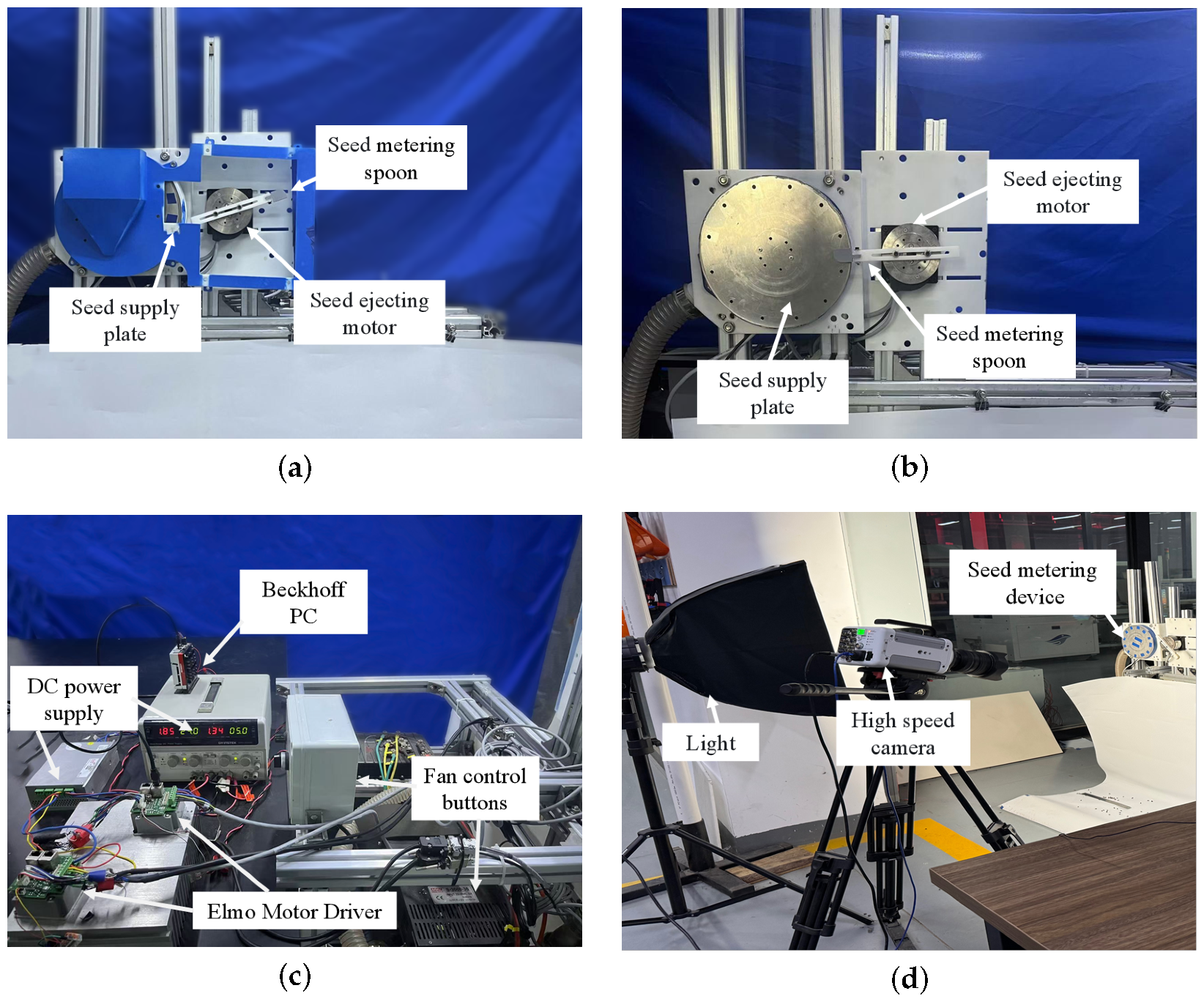- Deng, S.; Feng, Y.; Cheng, X.; Wang, X.; Zhang, X.; Wei, Z. Disturbance analysis and seeding performance evaluation of a pneumatic-seed spoon interactive precision maize seed-metering device for plot planting. Biosyst. Eng. 2024, 247, 221–240. [Google Scholar] [CrossRef]