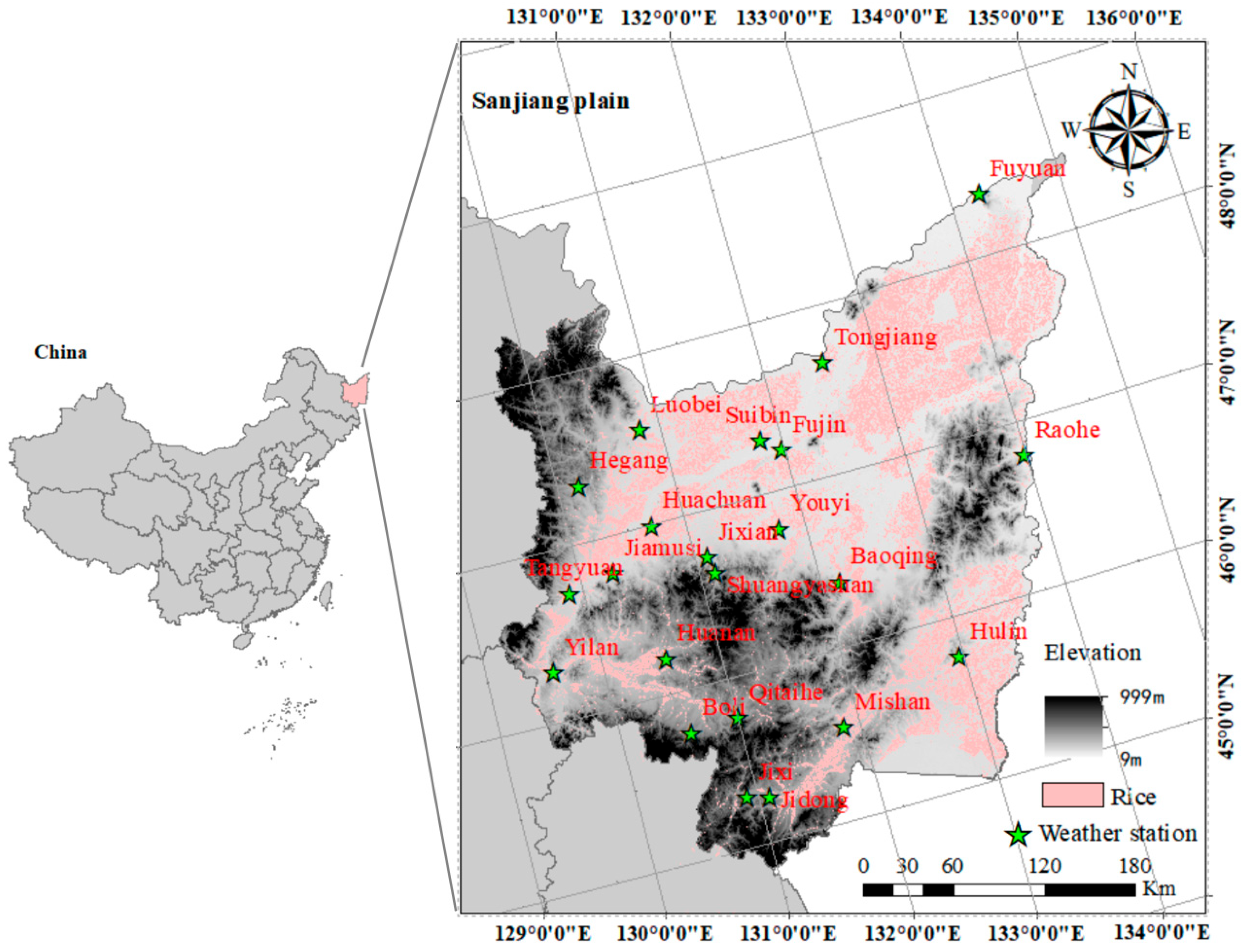 2. The region experiences a temperate, humid, and semi-humid continental monsoon climate, with an average annual temperature of 1–4 °C. Annual sunshine duration ranges from 2400 to 2500 h, and the frost-free period lasts 120–140 days. The accumulated temperature above 10 °C is 2300–2500 °C. During the growing season (May–September), the daily average temperature ranges from 17 °C to 20 °C. The area is characterized by high latitude, rich soil organic matter, and an annual rainfall of approximately 384–886 mm, with about 400–600 mm occurring during the growing season. Elevation ranges from 34 to 1100 m above sea level. Precipitation is concentrated in the summer and autumn, and the region’s summer rain–heat synchronization, combined with its high soil fertility (soil organic matter content typically ranging from 3% to 5%), creates favorable conditions for rice cultivation. By 2022, the rice cultivation area in the Sanjiang Plain reached approximately 1.1 million hectares, accounting for 29% of the region’s arable land. The proposed model was applied to 21 counties (or cities) that constitute the core agricultural area of the Sanjiang Plain, including those within Jiamusi, Hegang, Shuangyashan, Qitaihe, and Jixi cities in Heilongjiang Province, as well as Yilan County in Harbin City. The study area is depicted in