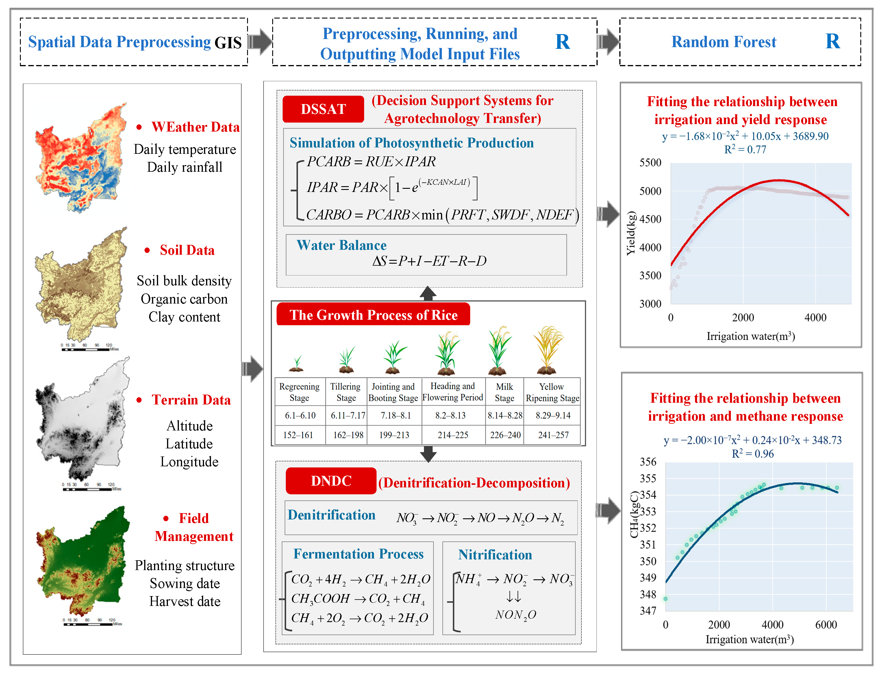 Section 2.1. Station observations were interpolated using Thiessen polygons in GIS to create continuous spatial datasets. The processed meteorological data were then converted into formats compatible with the DSSAT and DNDC models, generating a gridded regional climate dataset for subsequent simulations. Soil data were extracted from the Harmonized Soil Database version 2.0 (HWSD v2.0), with single-factor extraction performed using GIS. Data screening was carried out in R (version 4.4.1), and the filtered data were rasterized in GIS to produce the multifactor raster data required for the model. The soil data include soil profile stratification, field water holding capacity, soil water content, bulk density, pH, and organic matter content. Crop and field management data were primarily sourced from relevant regional statistical yearbooks, national agricultural yield information, and related literature. The irrigation decisions in this study are based on a critical water consumption threshold parameter