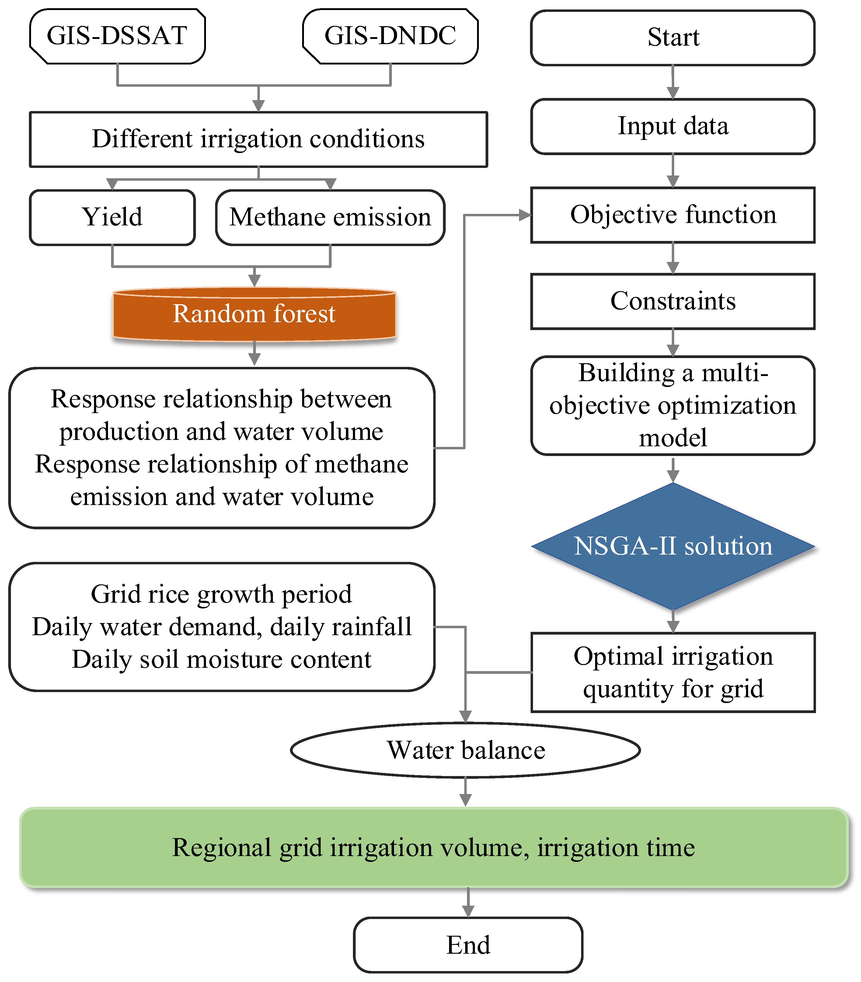 4 emissions, with constraints that accounted for crop water demand and water availability. The decision variables were irrigation water amount and irrigation timing. The multi-objective model was solved using the NSGA-II algorithm, and irrigation schedules were determined based on the water demand of rice in each grid cell. Each grid cell served as the fundamental unit, enabling refined spatio-temporal optimization of irrigation decisions for rice cultivation across the Sanjiang Plain. The overall workflow of the multi-objective optimization for rice irrigation water allocation is illustrated in