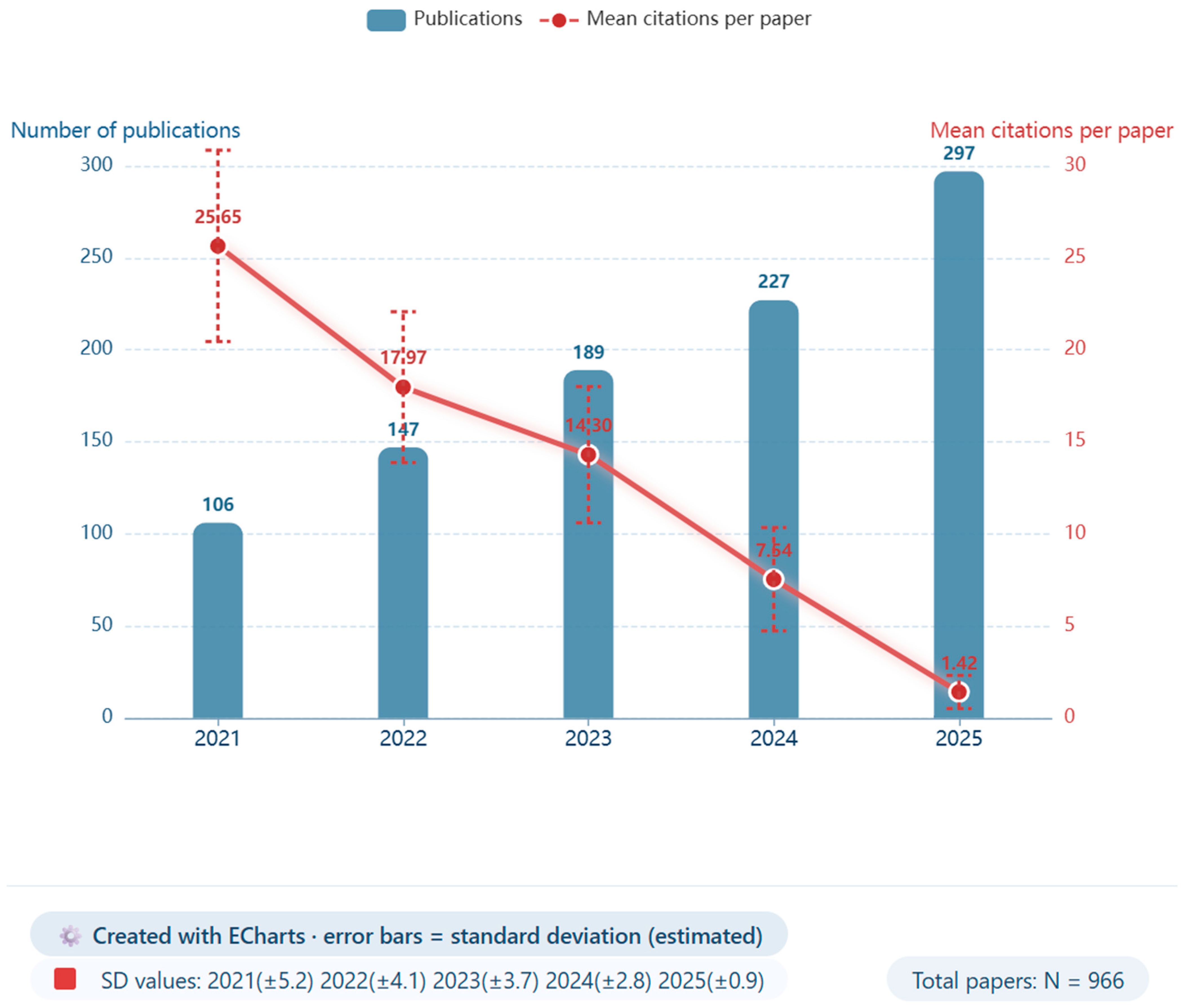 Figure 1. The analysis is based on 966 articles retrieved and cleaned from the core collection of Web of Science (as of 31 December 2025). The time distribution and citation characteristics clearly reflect the growth trajectory, academic vitality and influence evolution of this field.
