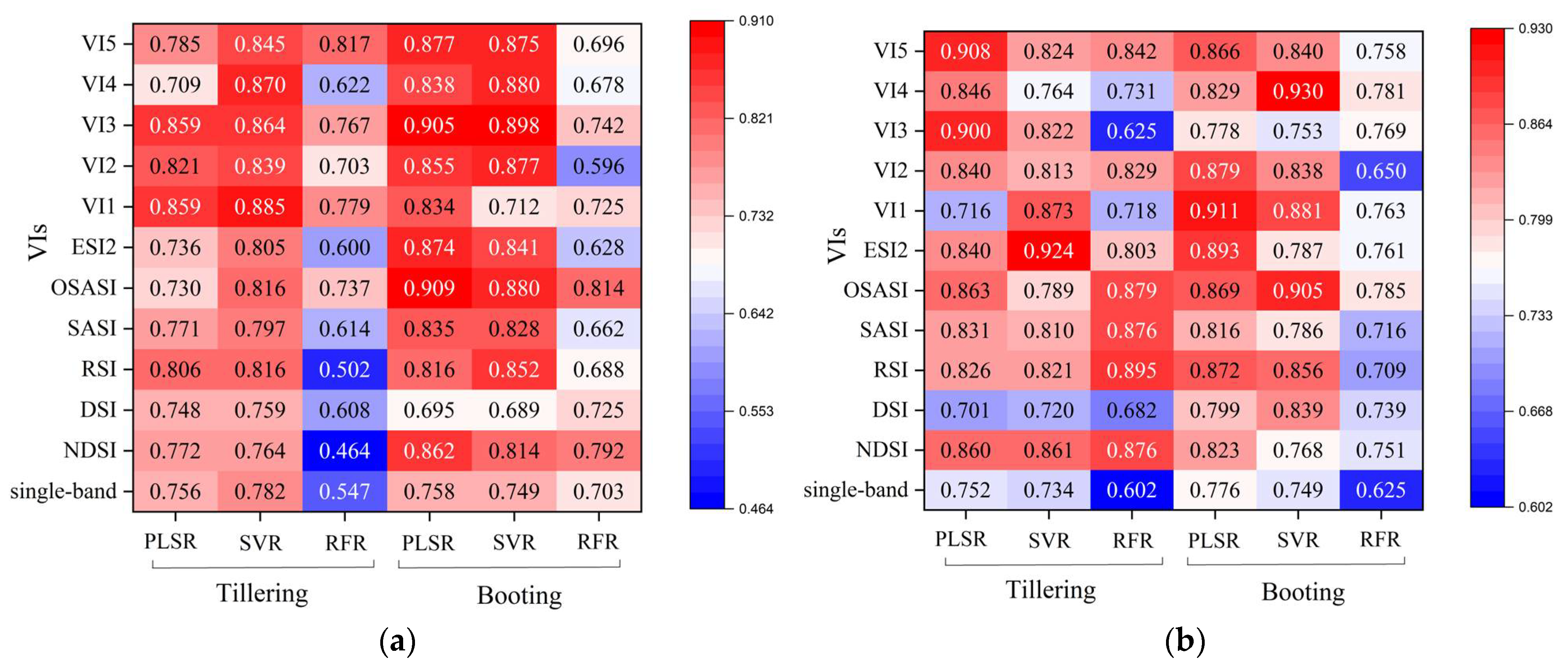 - Booting Stage: For SPAD readings retrieval, the PLSR–VI3 model is recommended, as it effectively utilizes red-edge and near-infrared band features, aligning with the spectral stability of mature leaves. For LNC estimation, the PLSR–VI1 model performed best, making it suitable for mid-to-late season nitrogen nutrition assessment.