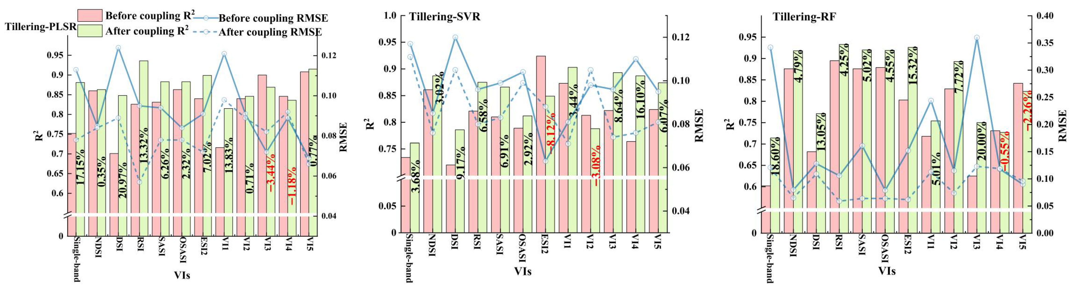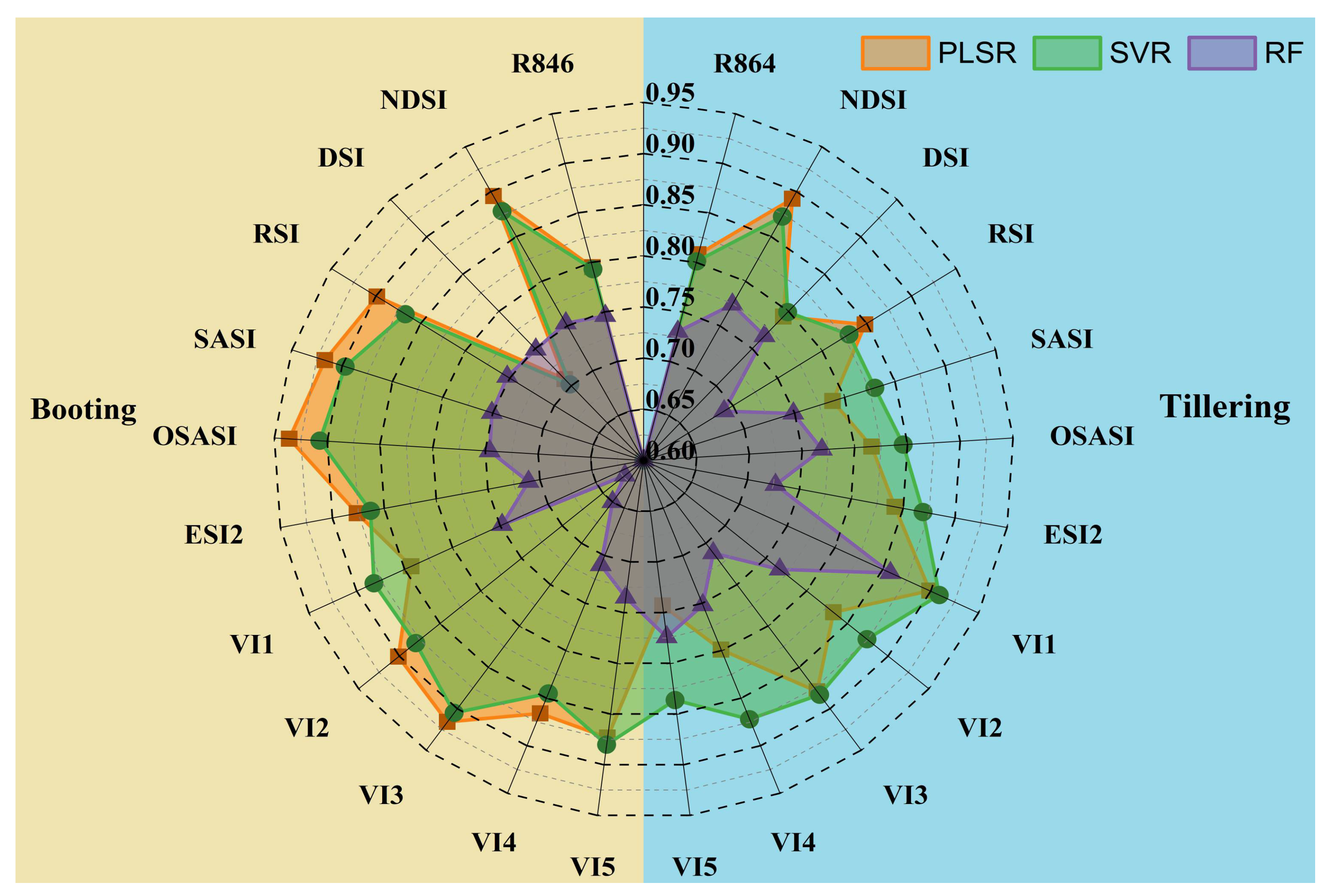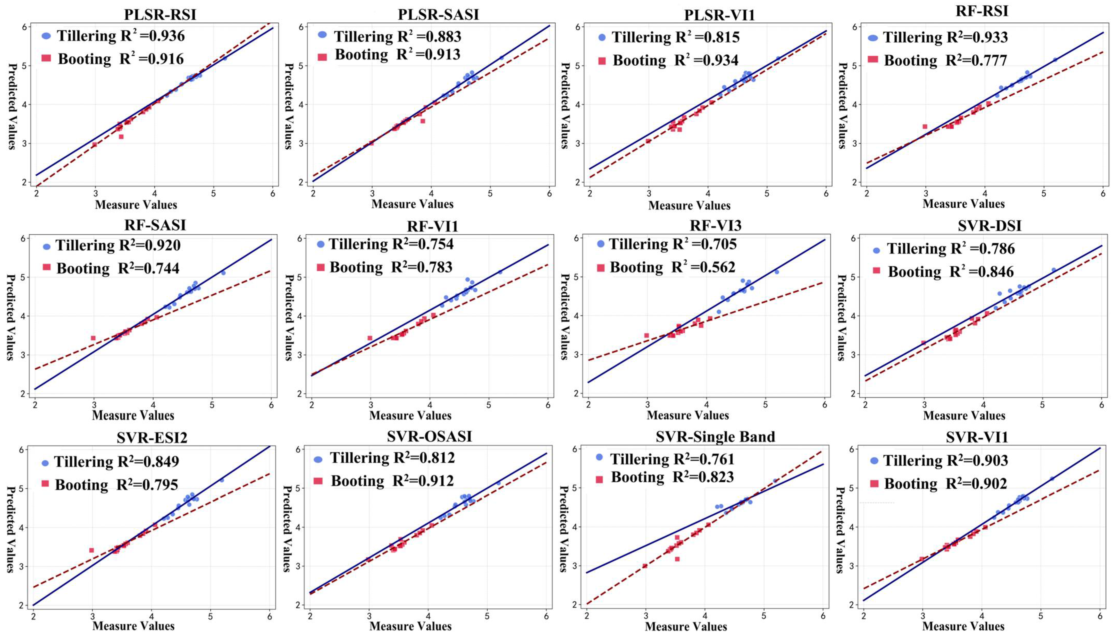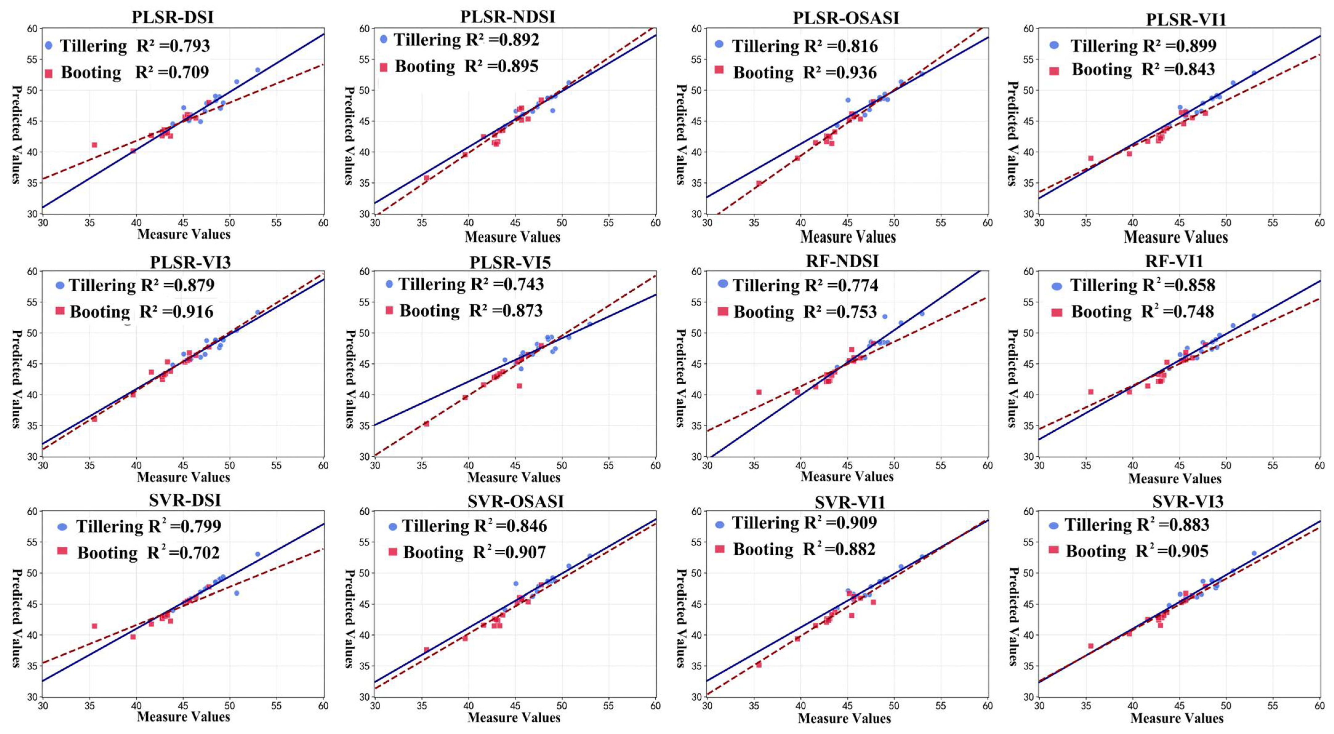 - Tillering Stage: For SPAD monitoring, the SVR–VI1 model is recommended to fully capture nonlinear relationships between multi-band spectra and chlorophyll. For LNC retrieval, the PLSR–RSI model is preferred, as it performs stably in integrating visible and red-edge information and is suitable for early-growth monitoring.