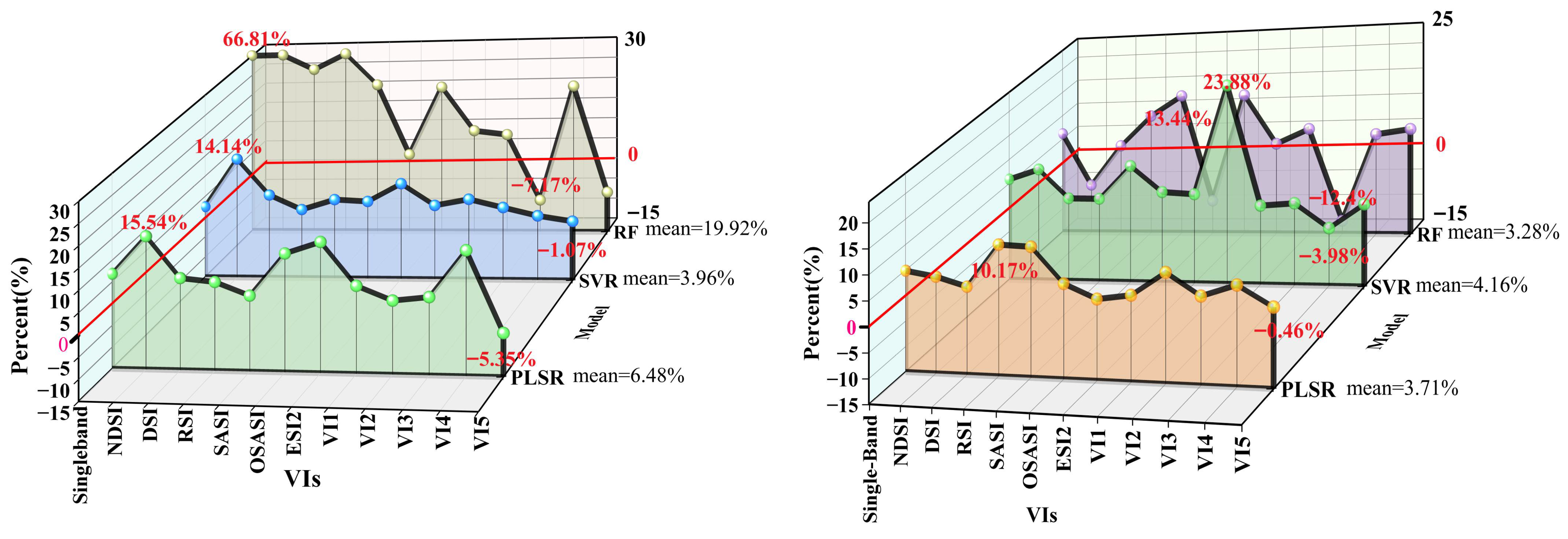 3.3. Inversion Model Construction of SPAD Readings and LNC Using Spectral Features with Auxiliary PH Information