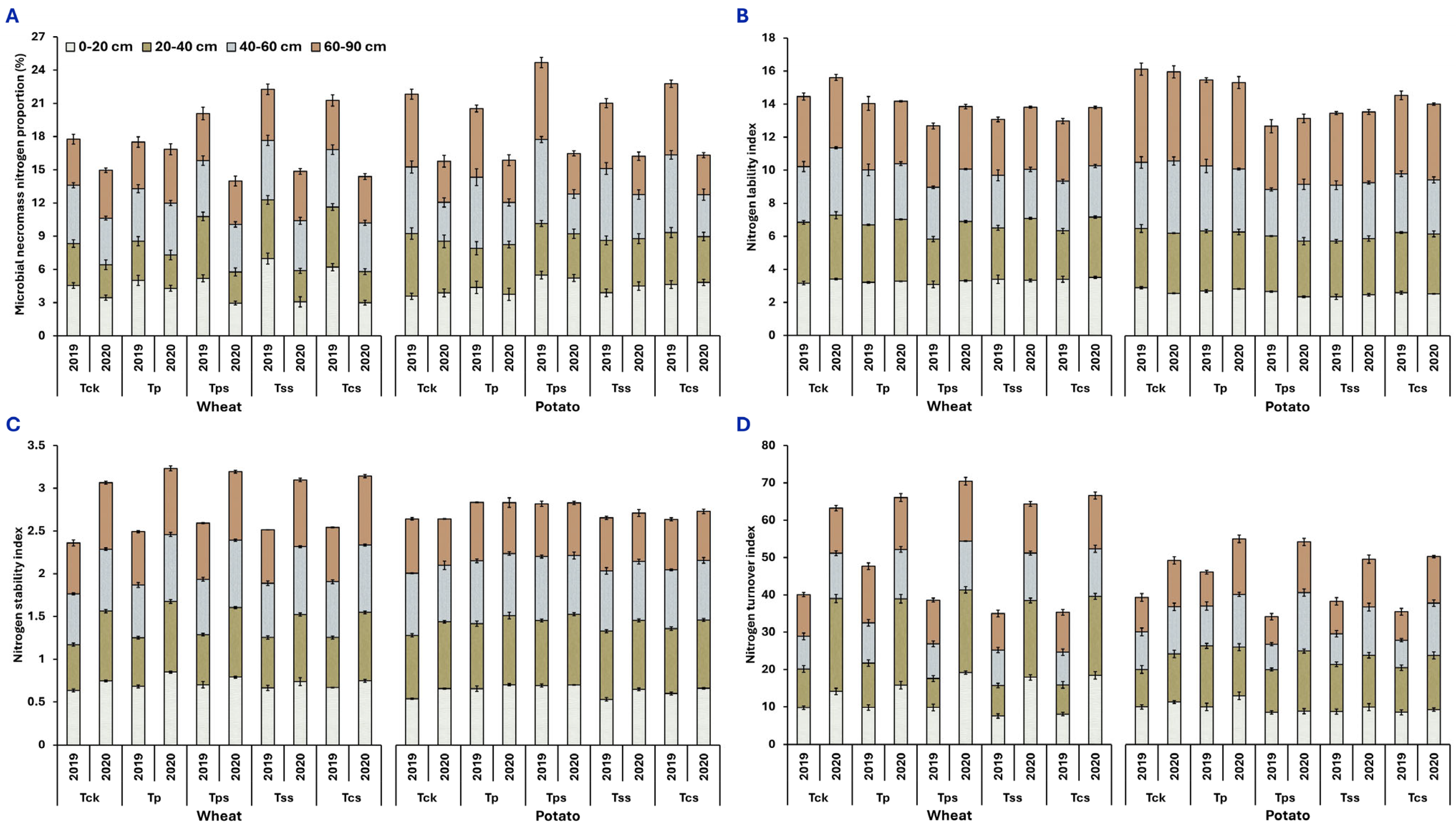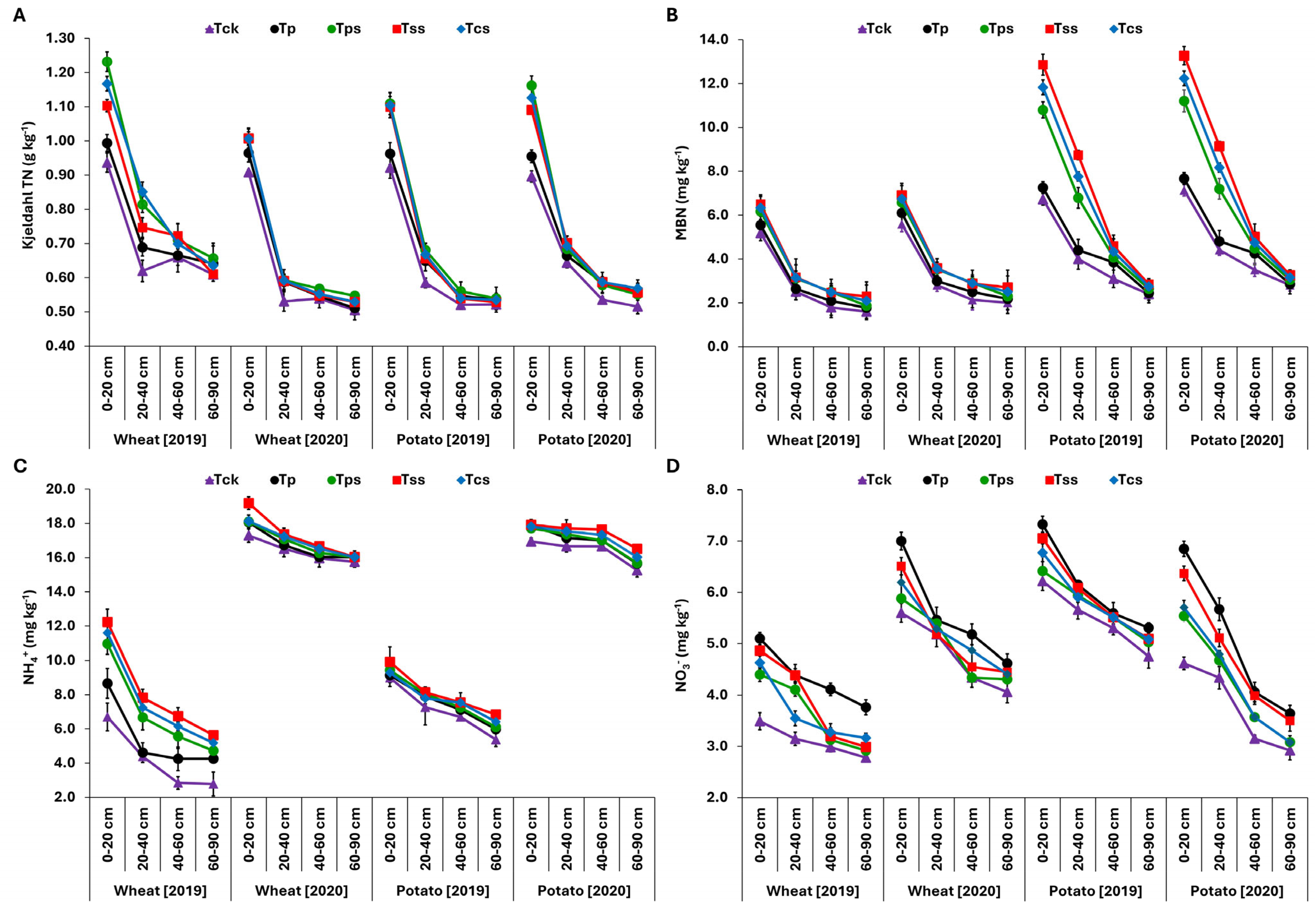 Pang L, Xia B, Girmanee TG, Mumtaz MZ, Hu N, Wang X, Wang X, Zheng H, Lu J. Maize Straw Strip Mulching Mediated Transformation of Soil Organic Nitrogen Across Soil Depths in Wheat and Potato Cultivation. Agriculture. 2026; 16(6):674. https://doi.org/10.3390/agriculture16060674
