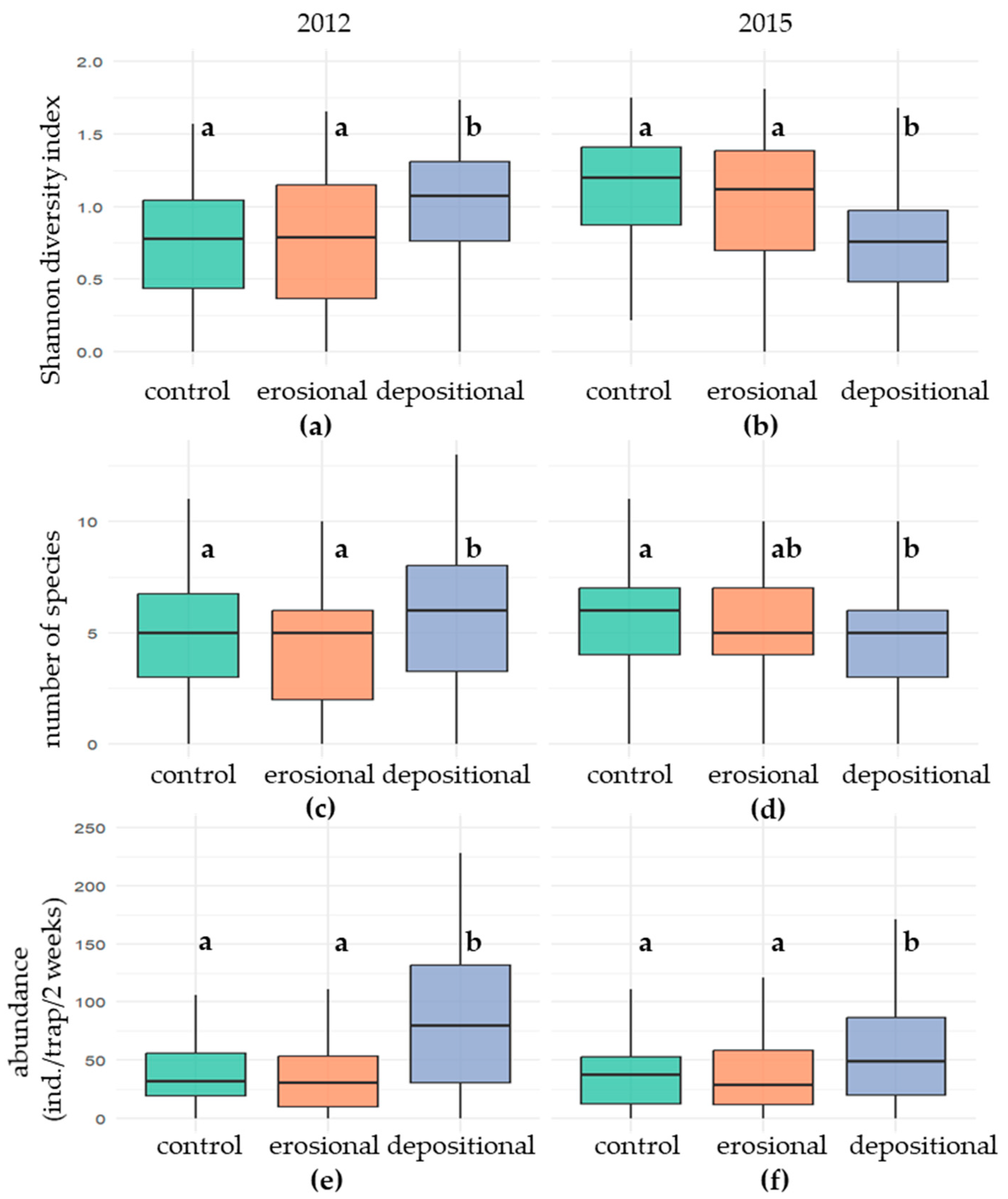 4.3. Differential Responses of Invertebrate Communities to Slope Position and Erosion Intensity