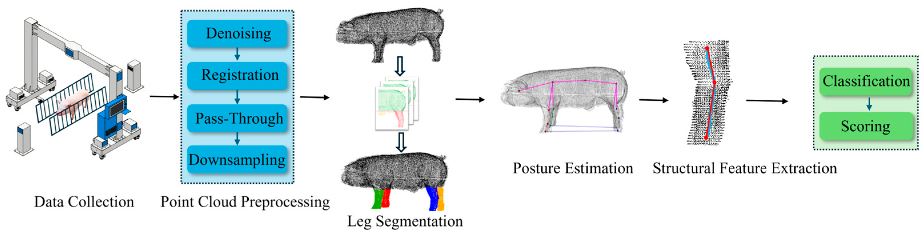 This section describes the overall technical workflow and experimental design of the study. We first present objective scoring of the experimental subjects and the data acquisition procedure, followed by detailed steps of point cloud preprocessing and coordinate unification, including registration, filtering, and posture normalization. On this basis, we constructed an adaptive leg region segmentation and key point localization method, extracted multi-scale geometric and symmetry features, and performed posture screening of the animals. Finally, following a “classify first, then score” strategy, we established a nine-level linear scoring model along with evaluation metrics and statistical methods.