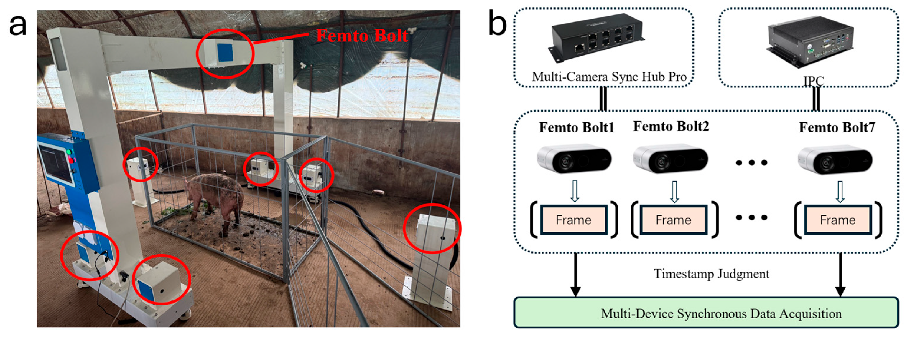 All cameras are time-of-flight (ToF) depth cameras (Femto Bolt, Orbbec Inc., Shenzhen, China). The seven depth cameras were connected to an industrial PC via USB-C interfaces and synchronized using a professional star-topology synchronization hub (Multi-Camera Sync Hub Pro, Orbbec Inc., Shenzhen, China). The industrial PC was configured with an Intel Core i7-8700 CPU, 16 GB RAM, a 256 GB SSD and a 1 TB HDD, running Windows 10 (64-bit). When a pig passed through the corridor, the seven cameras simultaneously captured its external morphology, and multi-view 3D point cloud data were obtained from all perspectives. The cameras were arranged around the animal at different angles and provided a depth resolution of 512 × 512 with a wide field of view of 120° × 120°, ensuring complete multi-angle coverage of the leg structures.