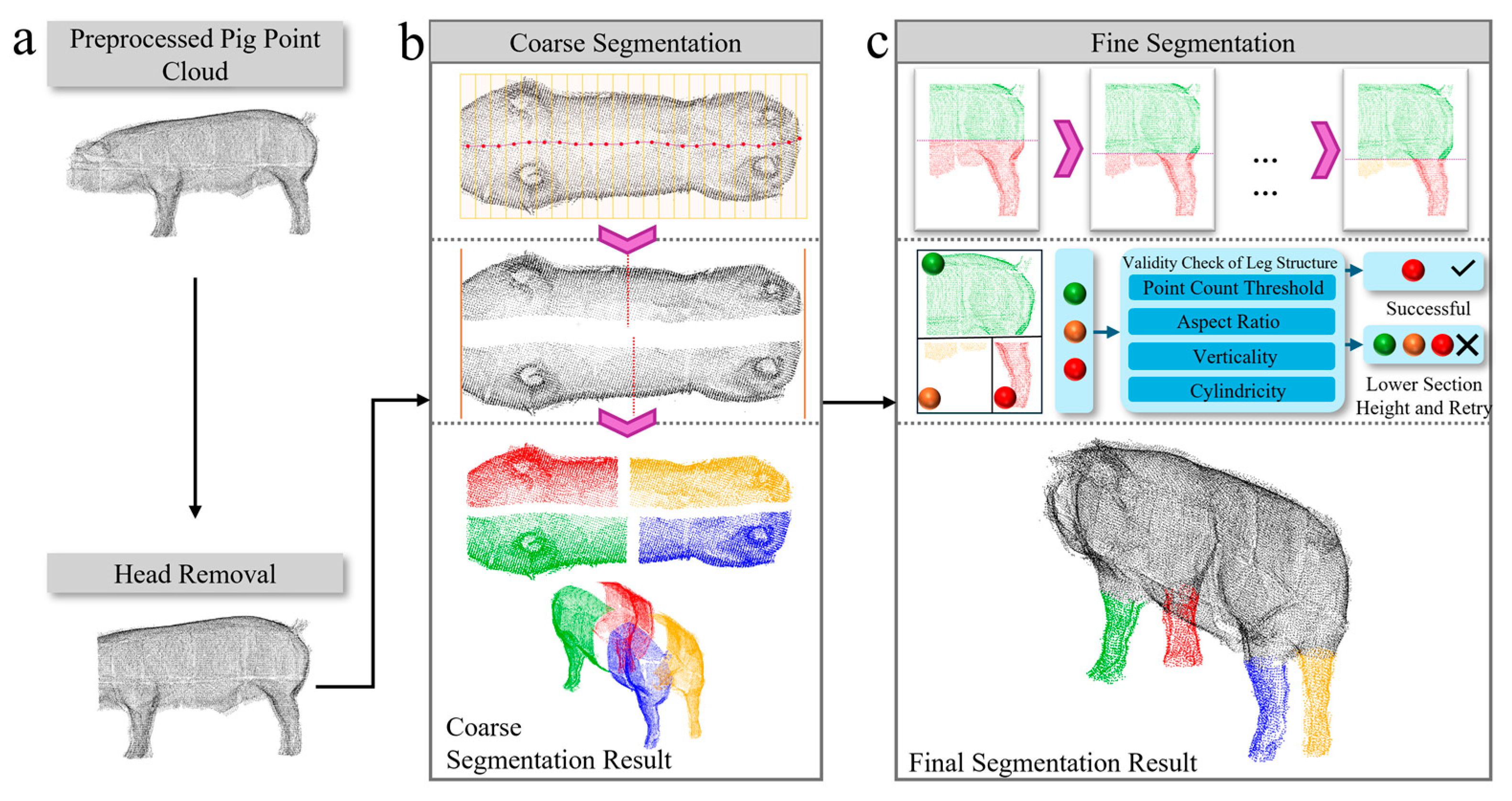 First, the anterior part of the point cloud model was cropped along the longitudinal axis of the pig to remove the head region, so as to avoid interference in subsequent left–right partitioning and leg localization. Here, the longitudinal axis denotes the global head–tail direction after pose normalization, obtained as the dominant principal direction of the extracted body point cloud. In practice, after pose normalization, we removed the points belonging to the anterior segment using a fixed proportion of the overall point cloud length measured along the longitudinal axis. The remaining point cloud, which mainly contains the trunk and limbs, was used as the input for leg segmentation (