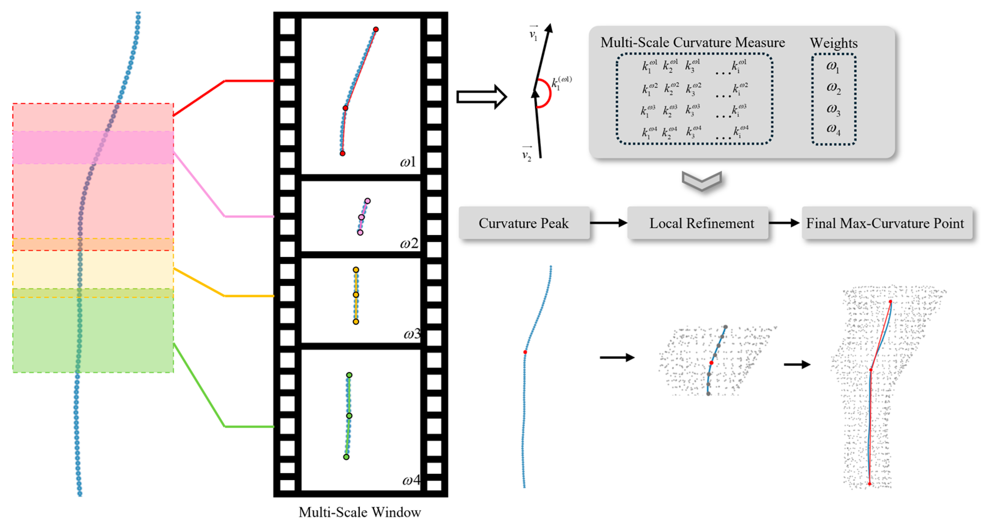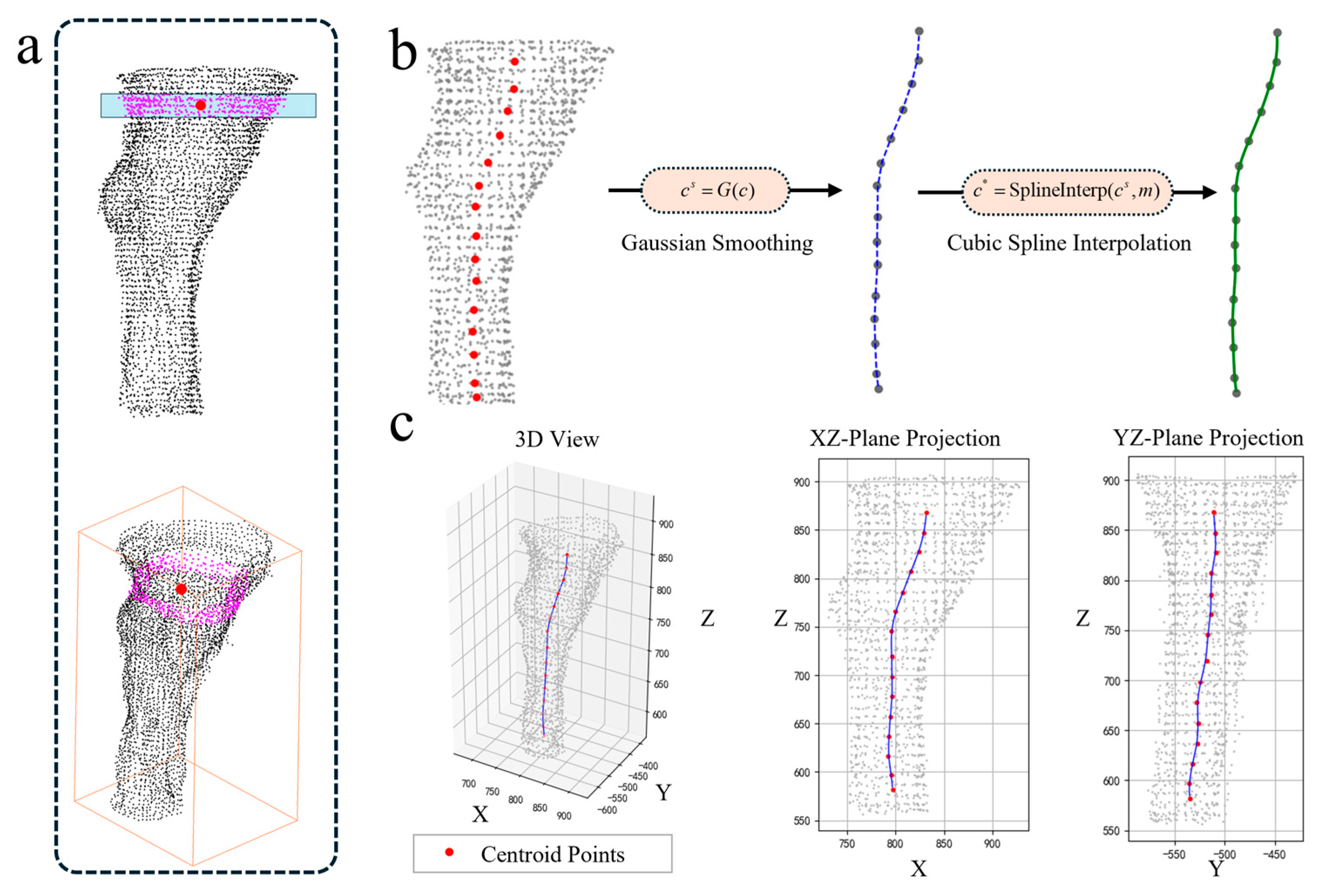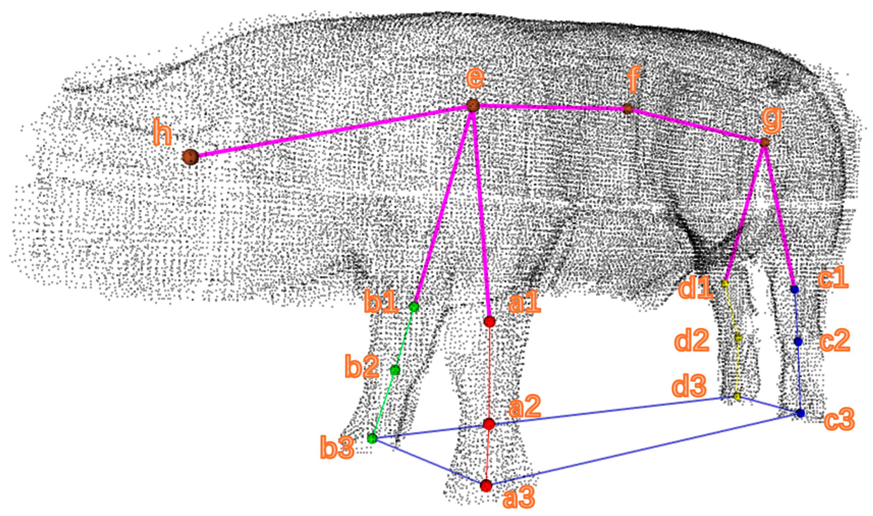For each leg point cloud, a multi-scale curve analysis was carried out to estimate the leg’s central axis and identify key feature points. Given a leg point cloud