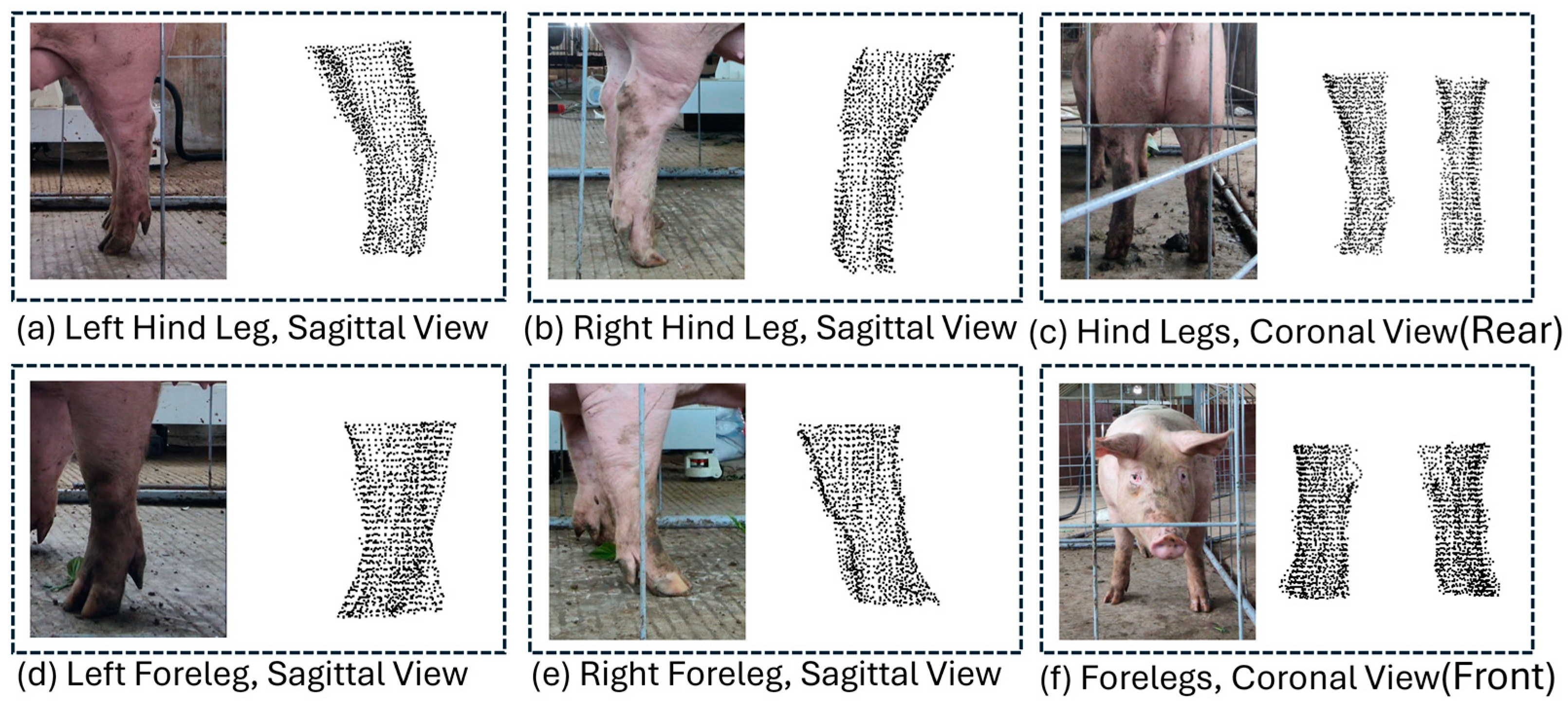 To address variations in body orientation and posture across acquisitions and to further improve analysis accuracy, principal component analysis (PCA) was employed to standardize the body pose orientation of the point cloud model. The covariance matrix and eigenvectors of the point cloud were computed along three principal directions, from which the longitudinal (head–tail), transverse (left–right), and vertical (dorsal–ventral) axes of the pig’s body were derived. The point cloud was then rotated so that the longitudinal axis aligned with the global x-axis, the transverse axis with the y-axis, and the vertical axis with the z-axis. This pose normalization provided a unified spatial reference frame for subsequent leg structure analysis from fixed viewpoints.