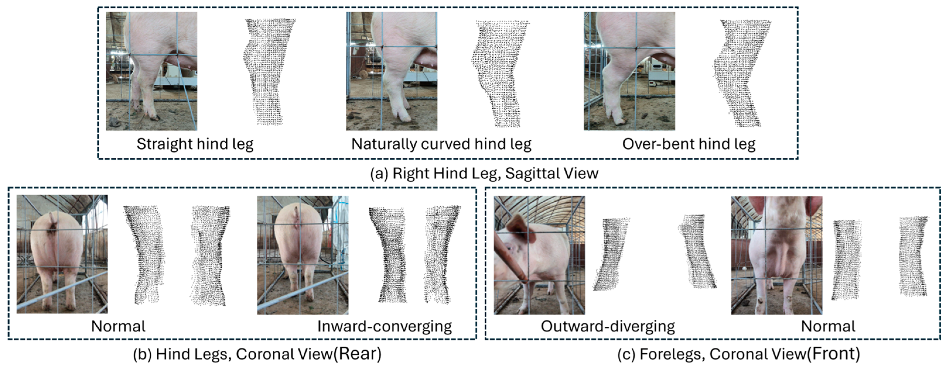 8]. In particular, the PIC system defines a nine-point scale for both fore- and hindlimbs, with a score of 5 representing the ideal hind-leg conformation; scores below or above this value indicate excessive curvature or straightness, respectively. Standardized reference images are provided to support field classification. This system has been widely applied worldwide in breeding stock selection, acceptance of imported animals, and lameness risk screening, and has become an important basis for evaluating limb soundness and productive longevity in commercial production.