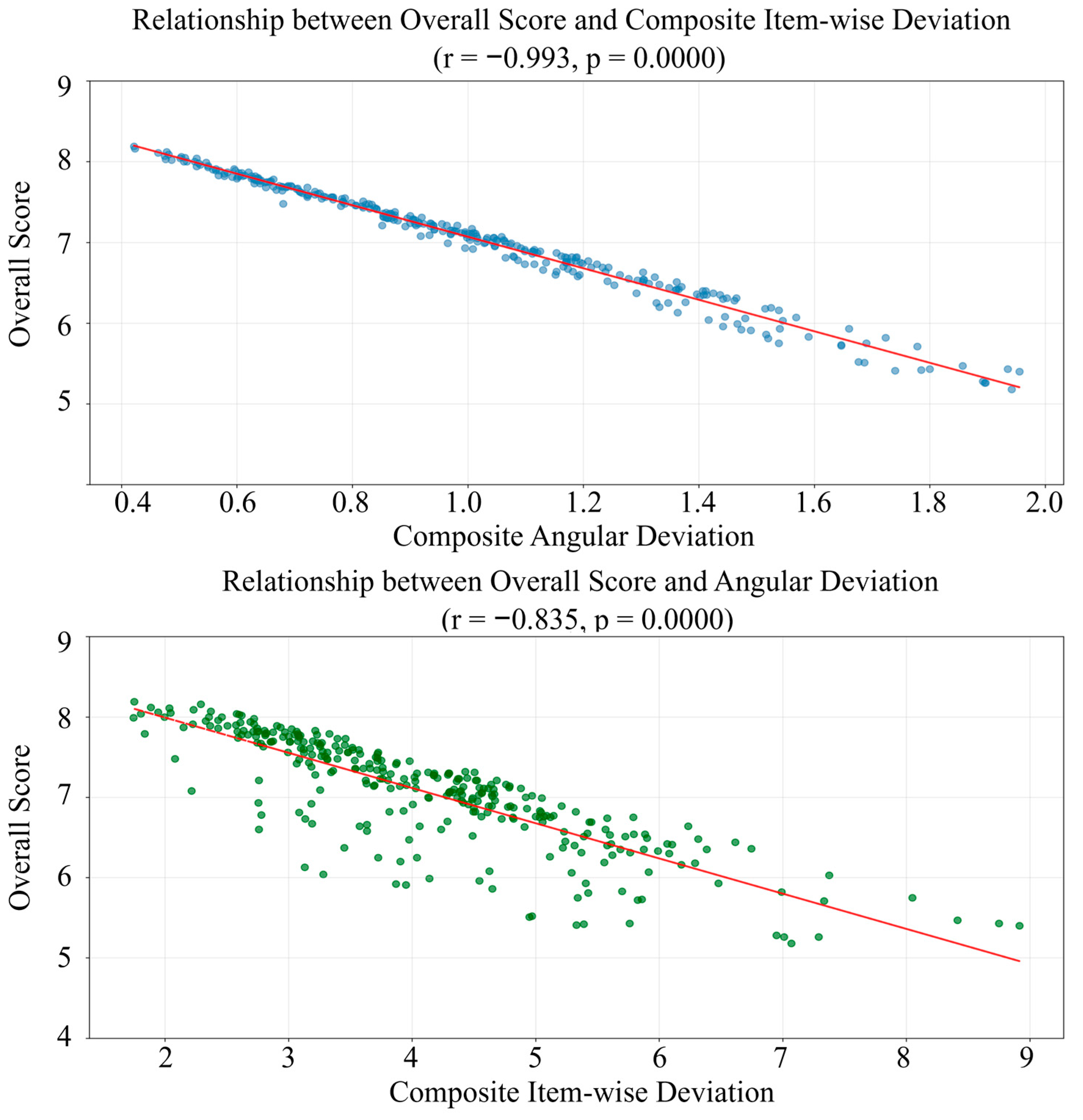 p < 0.001). This indicates that the scoring system has a highly consistent internal logic and can reliably convert local structural deviations into a final composite evaluation. At the same time, the correlation between the composite score and the weighted angle deviation is r = −0.835 (
