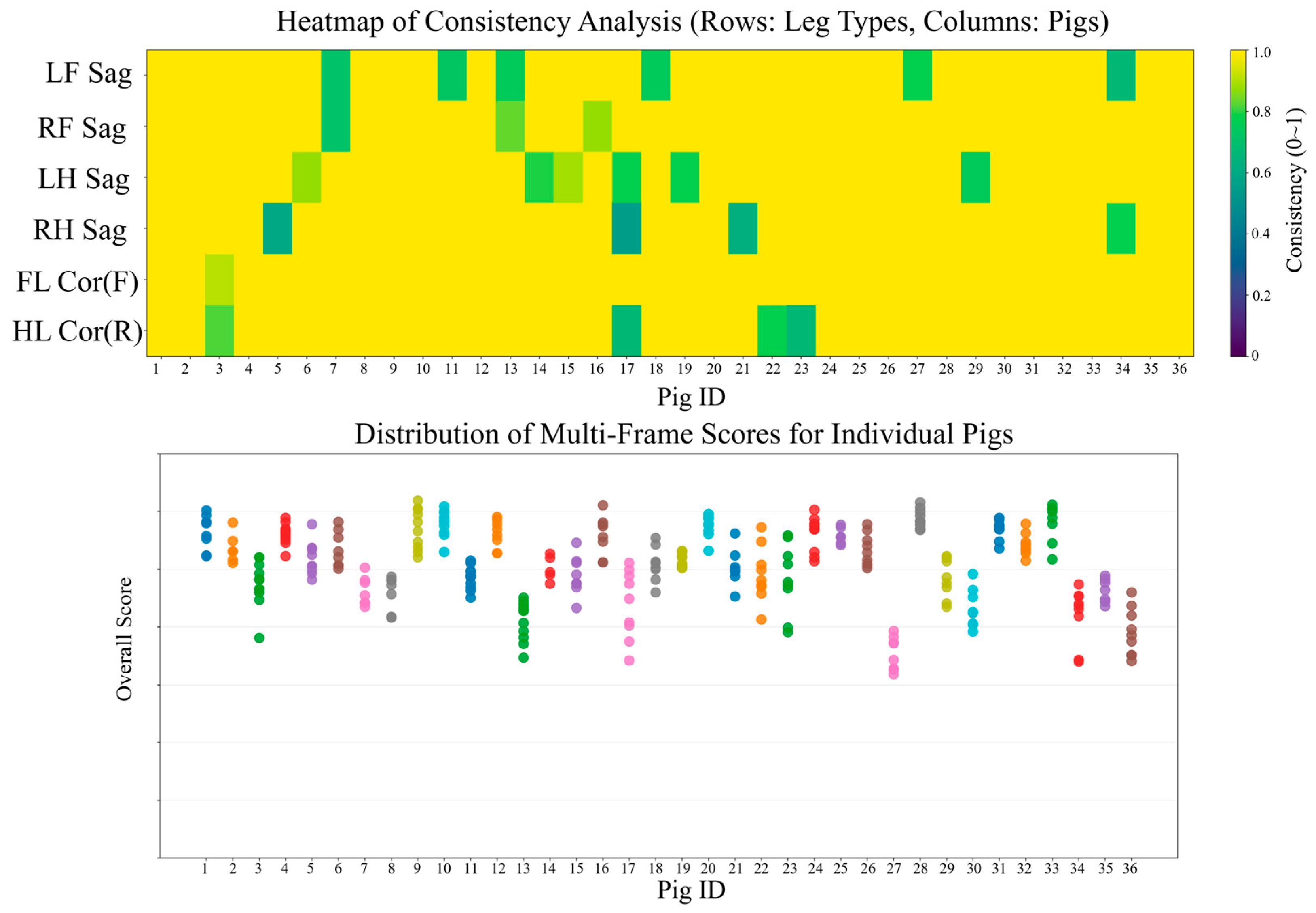 The coefficient of variation (CV) further supports this conclusion: the mean CV was 4.3%, and 72.2% of individuals had CVs below 5%, indicating stable scores for the majority of animals. In addition, the intraclass correlation coefficient (ICC) based on multi-frame repeated measurements across 36 pigs was 0.777 (95% CI: [0.684, 0.860]), reflecting good reliability of the system under multi-frame conditions. Taken together, these results show that the system provides highly consistent and reliable scores for the same pig under multi-frame conditions, effectively distinguishing differences between individuals while maintaining stable repeated measurements within individuals. This indicates that, provided a reasonable number of detection frames is guaranteed, the system’s scores can serve as an important reference index for evaluating leg structure and supporting breeding decisions in pigs.
